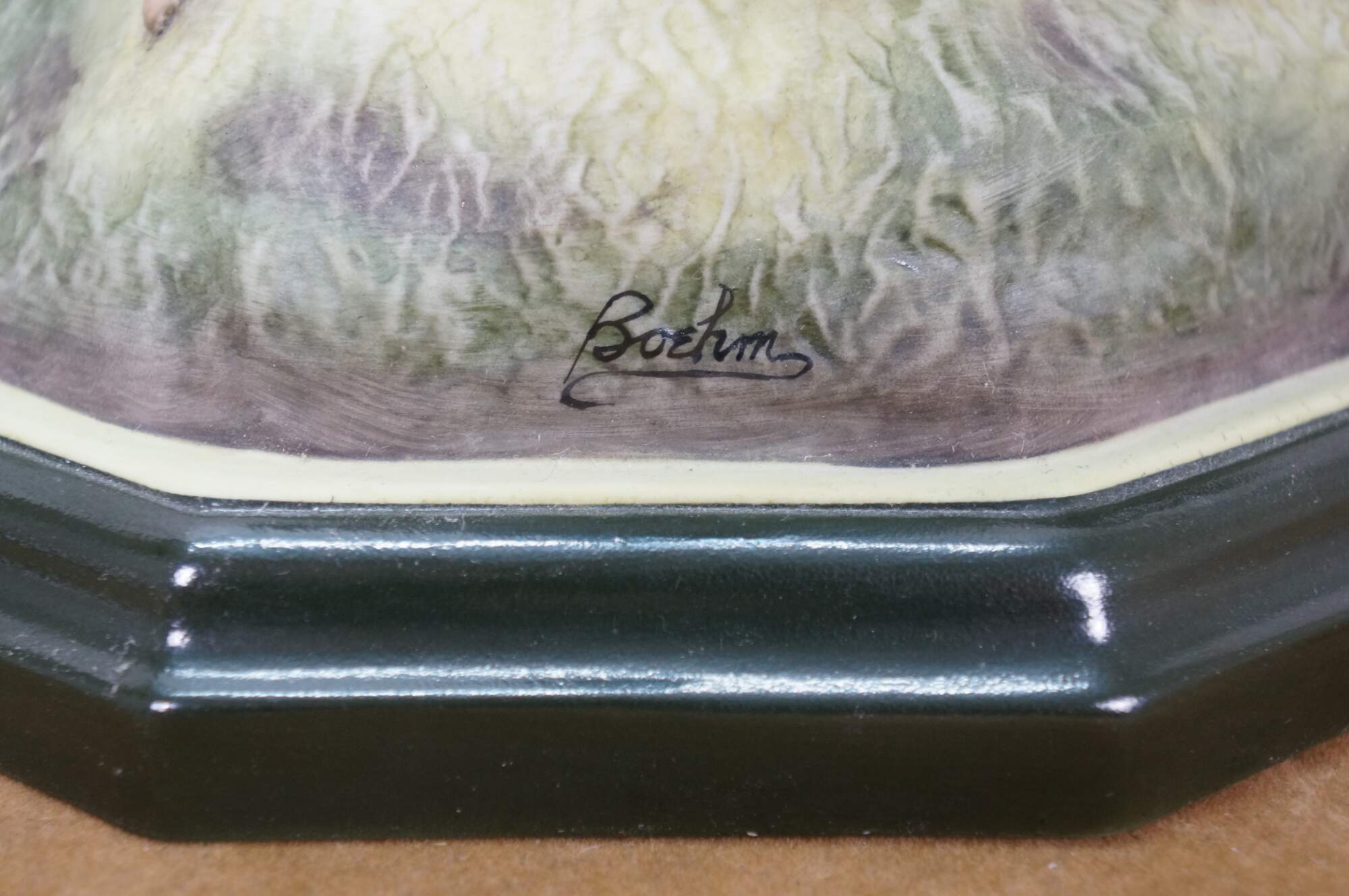 "Edward Marshall Boehm (August 21, 1913 – January 29, 1969) was an American figurative expressionist sculptor, known for his porcelain figures of birds and other wildlife. Boehm explained his choice of porcelain as the medium for his art as follows: "Porcelain is a permanent creation. If properly processed and fired, its colors will never change; and it can be subjected to extreme temperatures without damage. It is a medium in which one can portray the everlasting beauty of form and color of wildlife and nature." He and his wife founded an eponymous company, E.M. Boehm Studios, in 1950. Edward Marshall Boehm was born in Baltimore, Maryland in 1913. His surname is pronounced "Beam". His parents separated before his birth. His mother, Elsie, died when he was seven years old. (He did not meet his father until he was in his twenties.) Friends enrolled him in an all-boys school for orphans and the poor, the McDonogh School, where he remained until he was 16 years old, when he left to work as a farmhand. He studied animal husbandry at the University of Maryland, College Park. From 1934 to 1942, he managed Longacres Farm on the Eastern Shore of Maryland, specializing in Guernsey cattle. During World War II Boehm was in charge of a rehabilitation program for the Air Force at Pawling, New York. After World War II, Boehm apprenticed for six months with sculptor Herbert Haseltine. Boehm studied draftsmanship three times a week and taught himself the ancient process of porcelain making. In 1944, he married Helen Franzolin (12/26/1920–11/15/2010). They moved to Trenton, New Jersey, where they founded their business in 1950. The following year, the American Wing of the Metropolitan Museum of Art in New York ordered two statues for the museum's collection. The marriage was long and happy but childless. The couple remained together until Edward's death in 1969, aged 55. Boehm kept a large collection of exotic birds in extensive aviaries and tropical houses at his home in Trenton. These birds became some of the subjects and inspiration for his sculptures. Many of these species were successfully bred, approximately 12 were recognised as being for the first time in captivity anywhere in the world. For these breeding successes Edward Boehm received a number of commemorative medals and plaques. Edward Marshall Boehm died from a heart attack on January 29, 1969, aged 55. His widow, Helen Boehm, died in 2010, aged 89. The couple is interred at Saint Mary's Cemetery, Trenton, Mercer County, New Jersey. Boehm was accorded his highest honor in 1992 when a wing of the Vatican Museums in Rome was named in his memory. This was the first time in its 500-year history that one of the 13 museums in the Vatican was named for an American citizen, as the twelve other museums are named for popes and royal families." (Wikipedia)