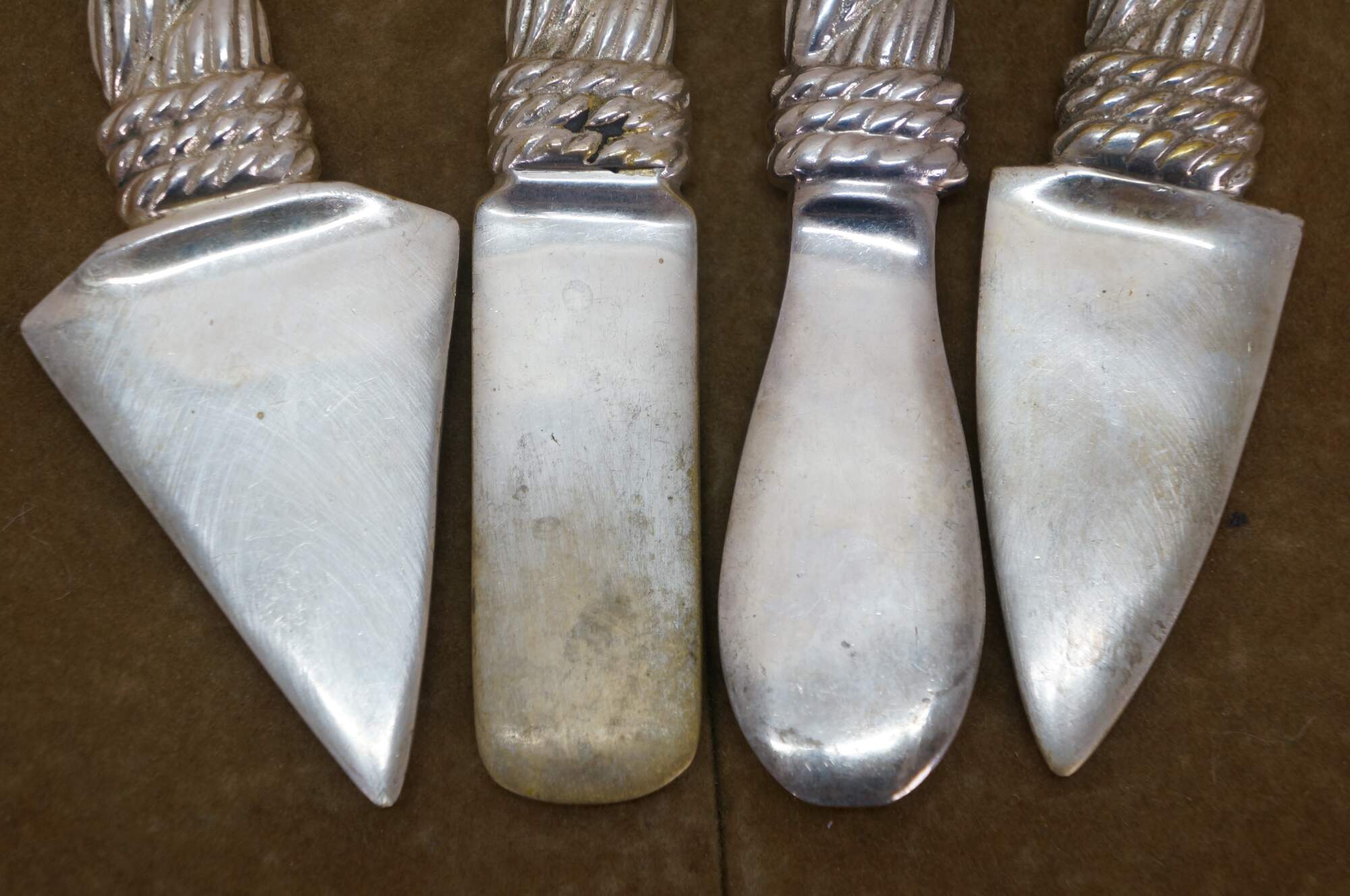 Set of four late 20th-century silver-plate cheese knives/spreaders with woven rope-patterned handles.