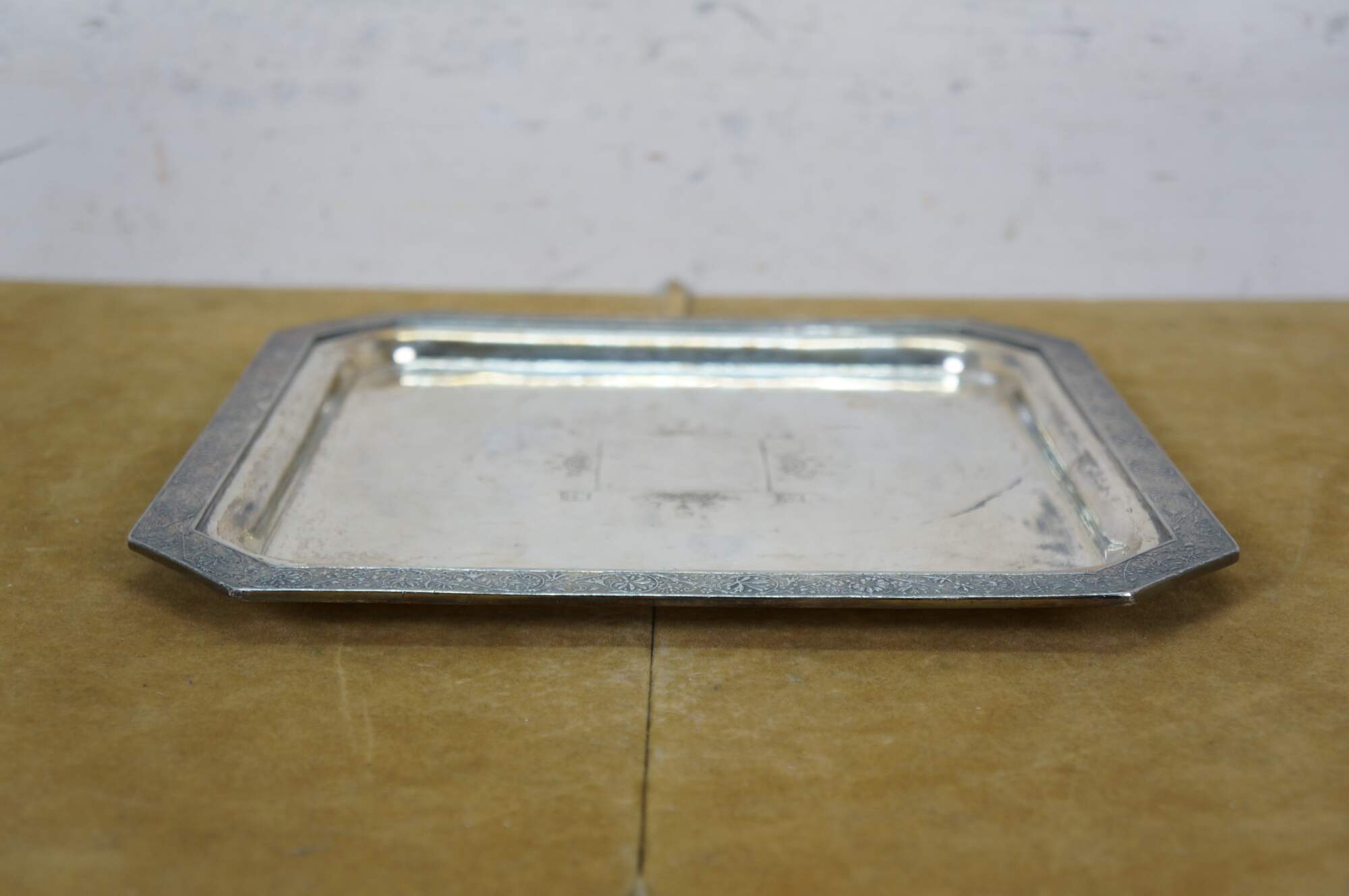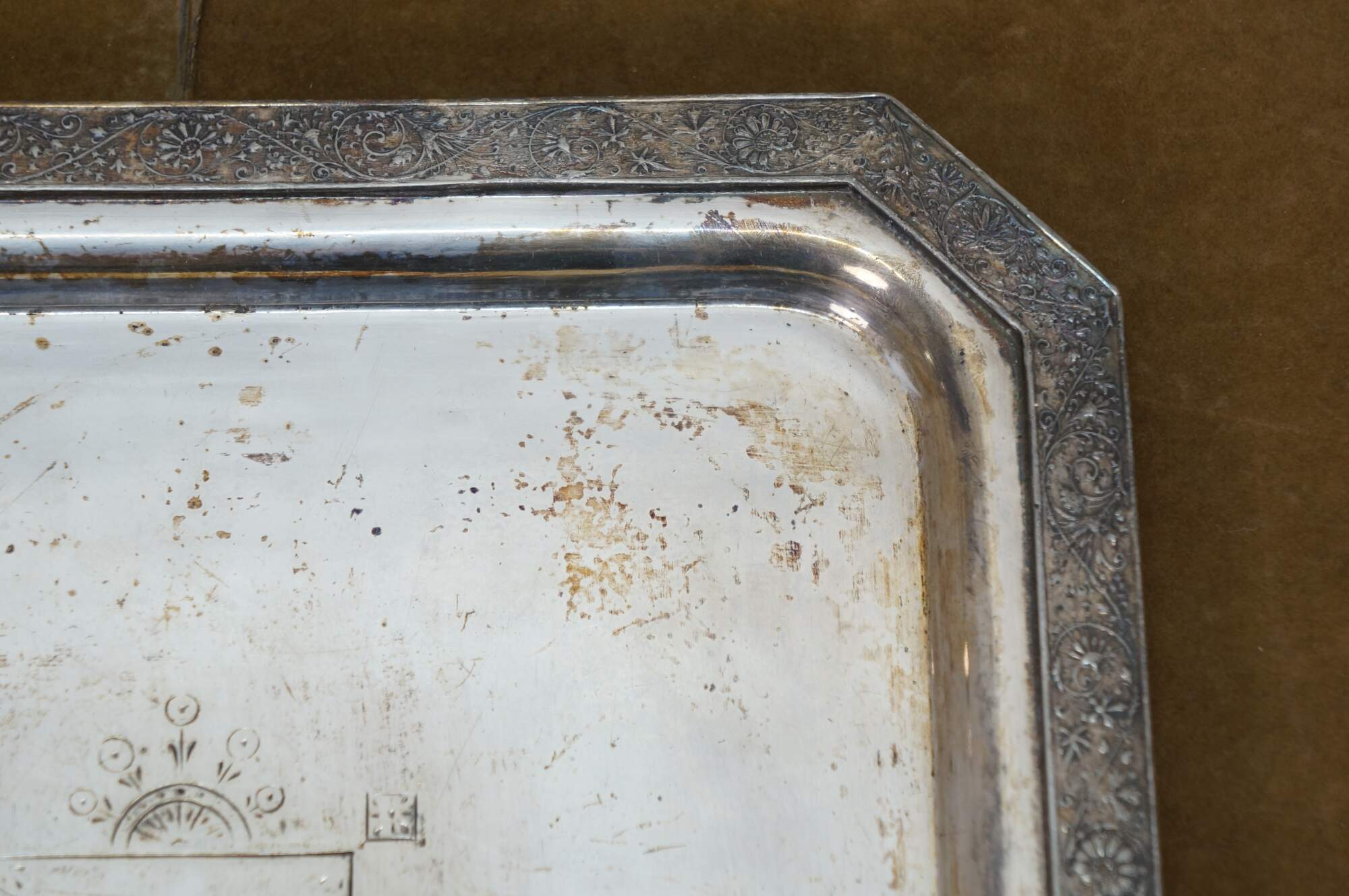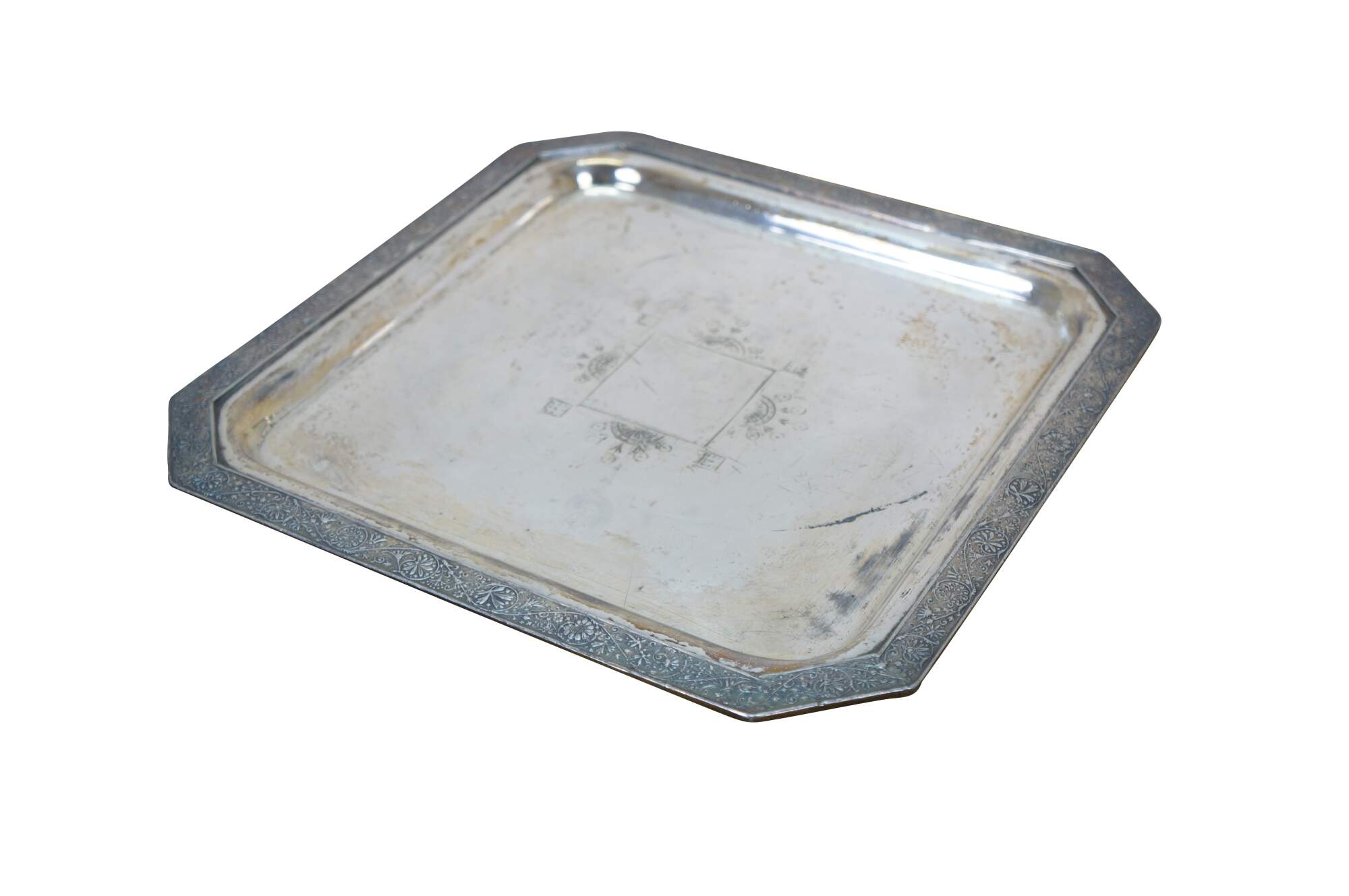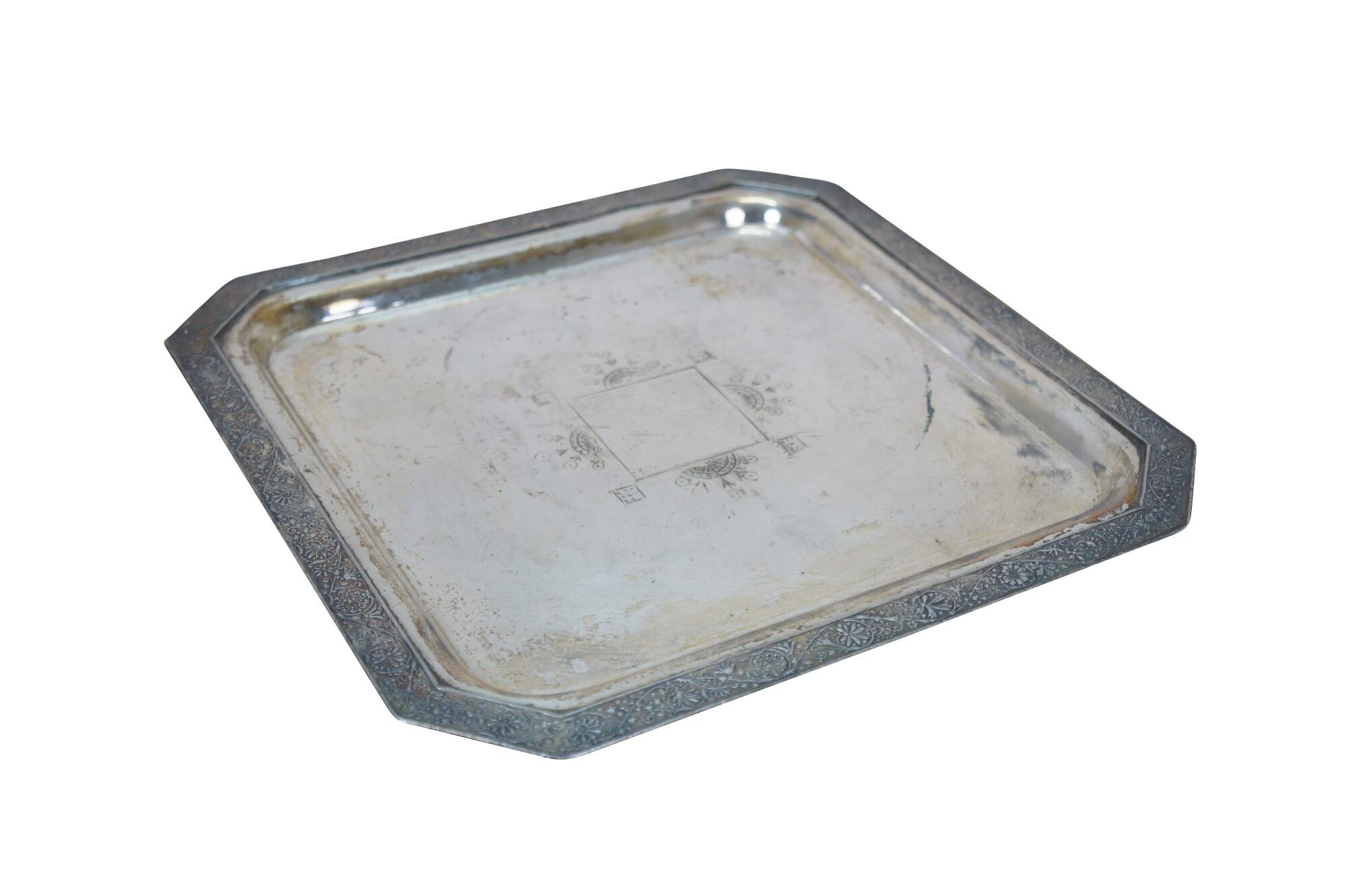 Late 19th century hard white metal quadruple plate serving tray by Middletown Plate Company. Numbered 63 and 10 on reverse. Square form with cut corners, etched geometric design at center; floral and foliate edge.