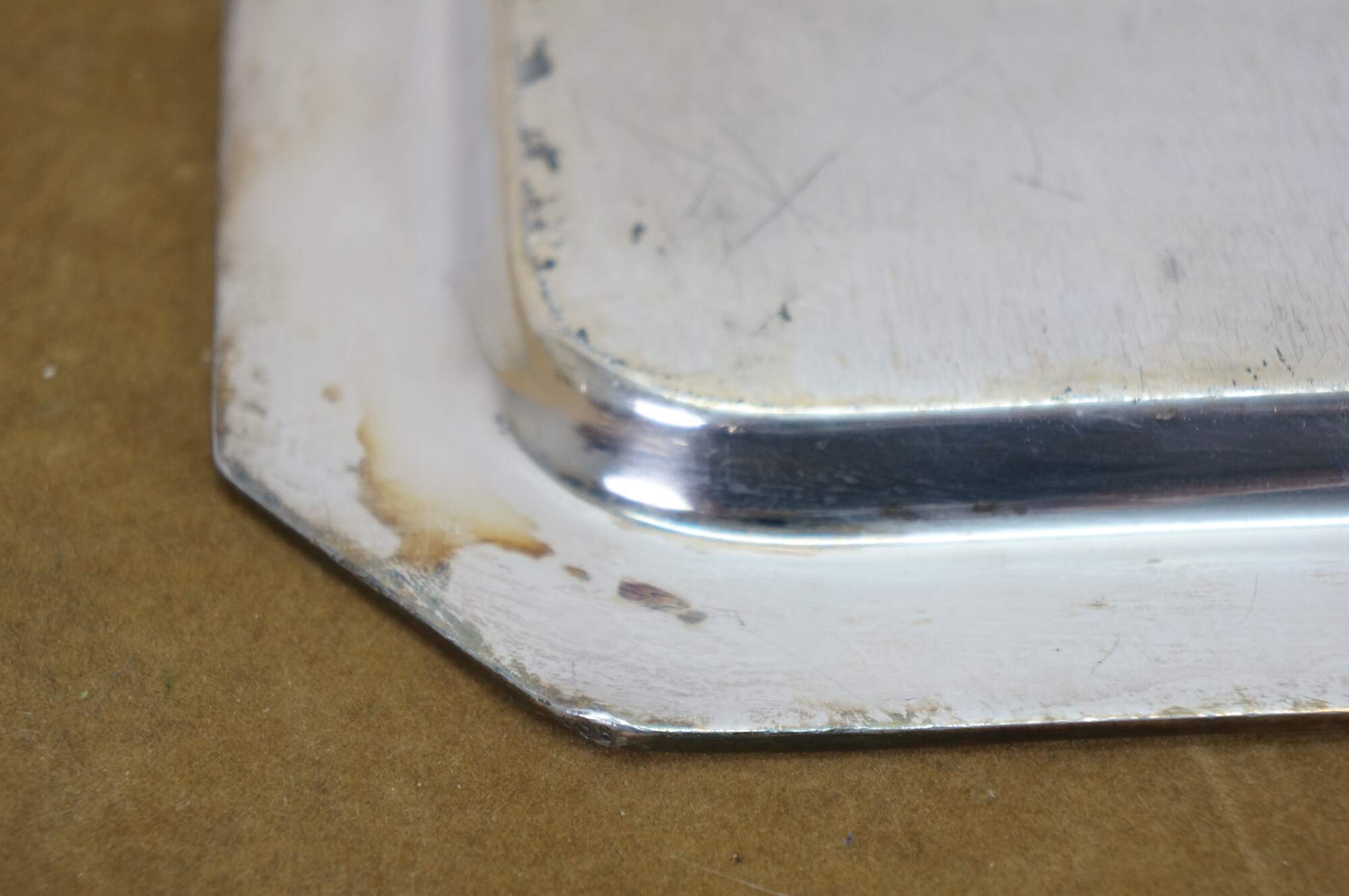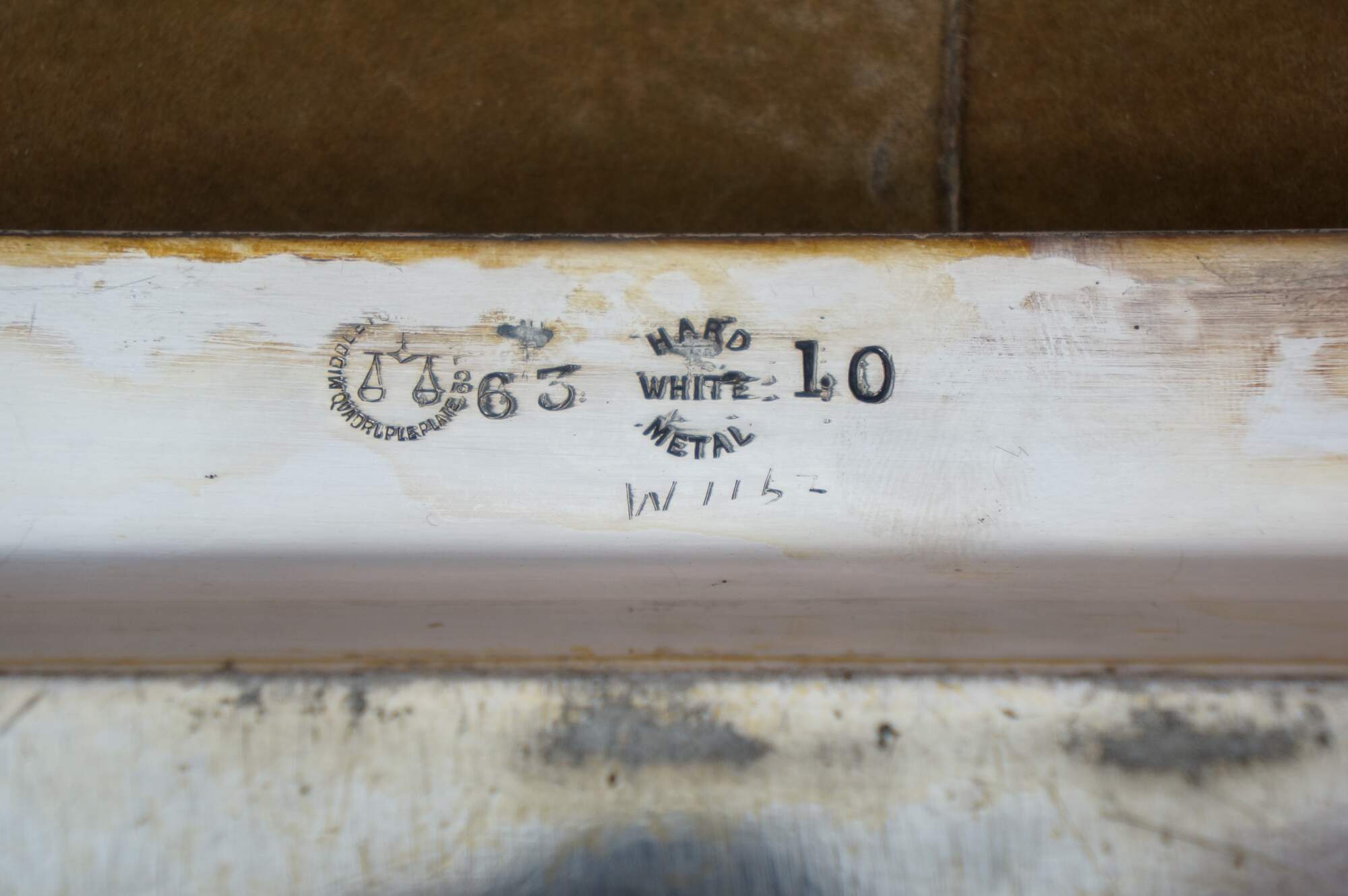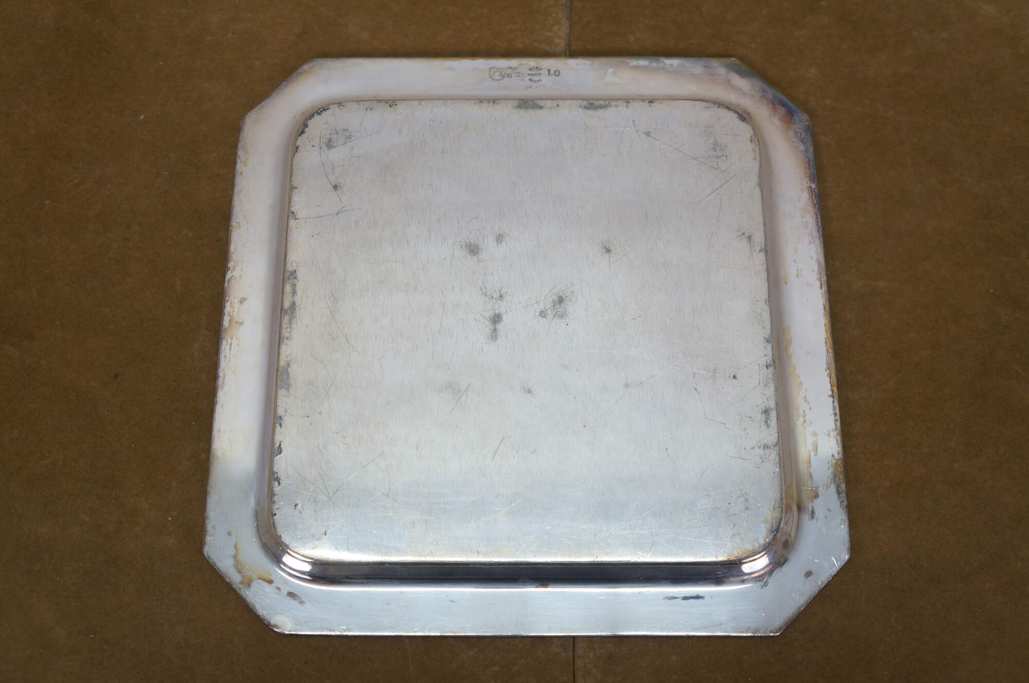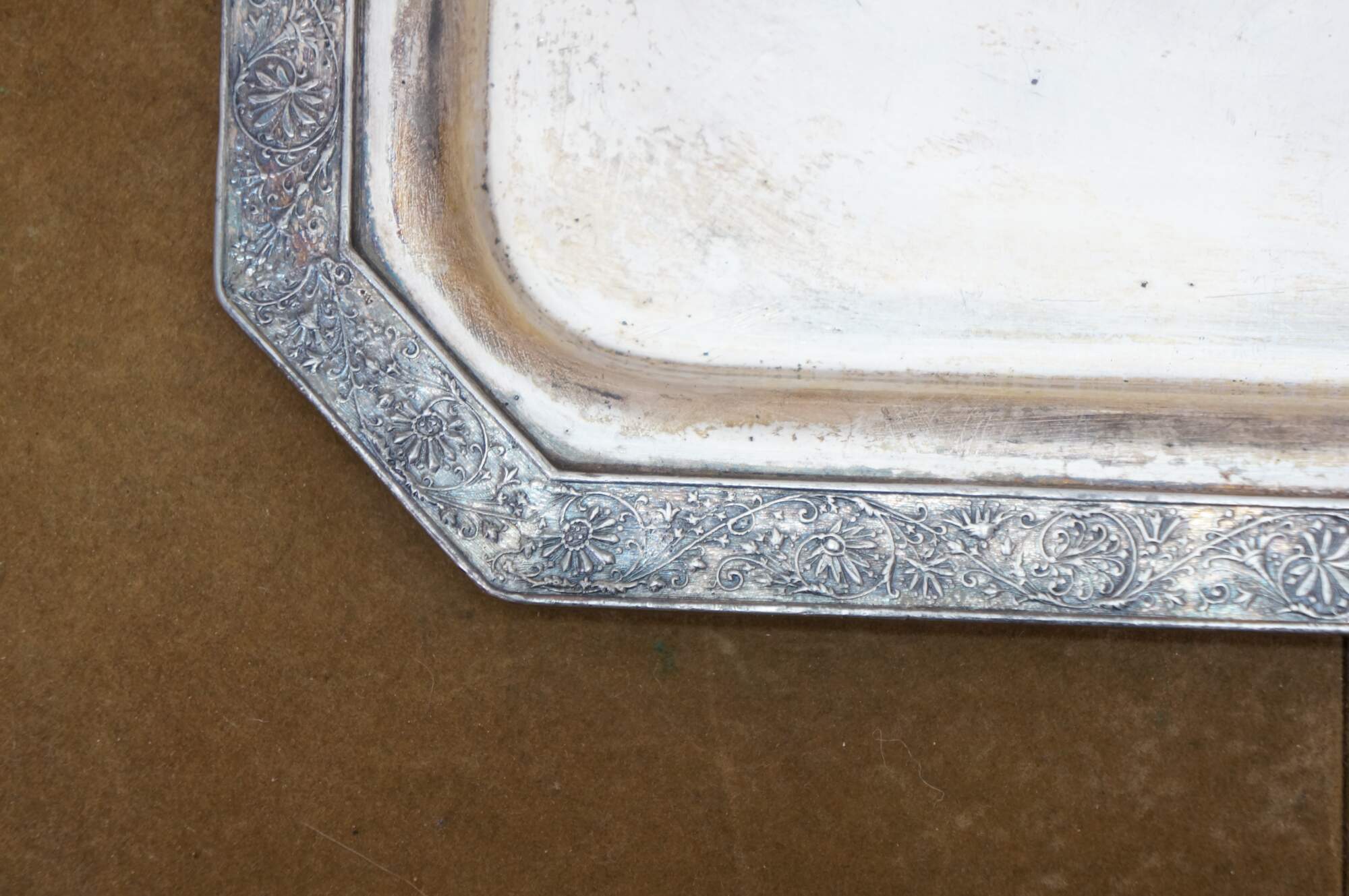 Late 19th century hard white metal quadruple plate serving tray by Middletown Plate Company. Numbered 63 and 10 on reverse. Square form with cut corners, etched geometric design at center; floral and foliate edge.