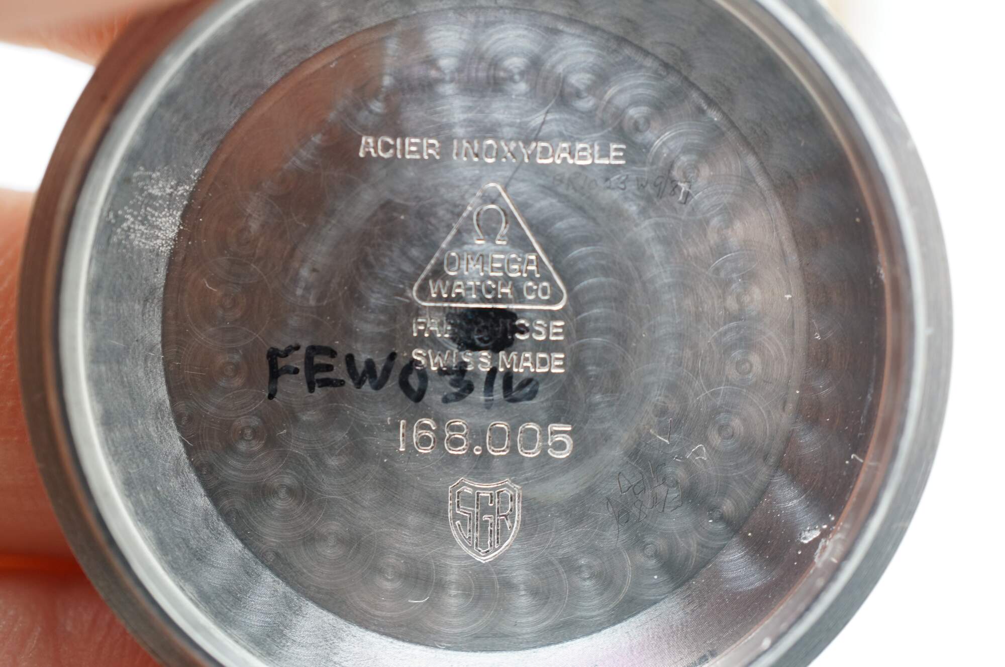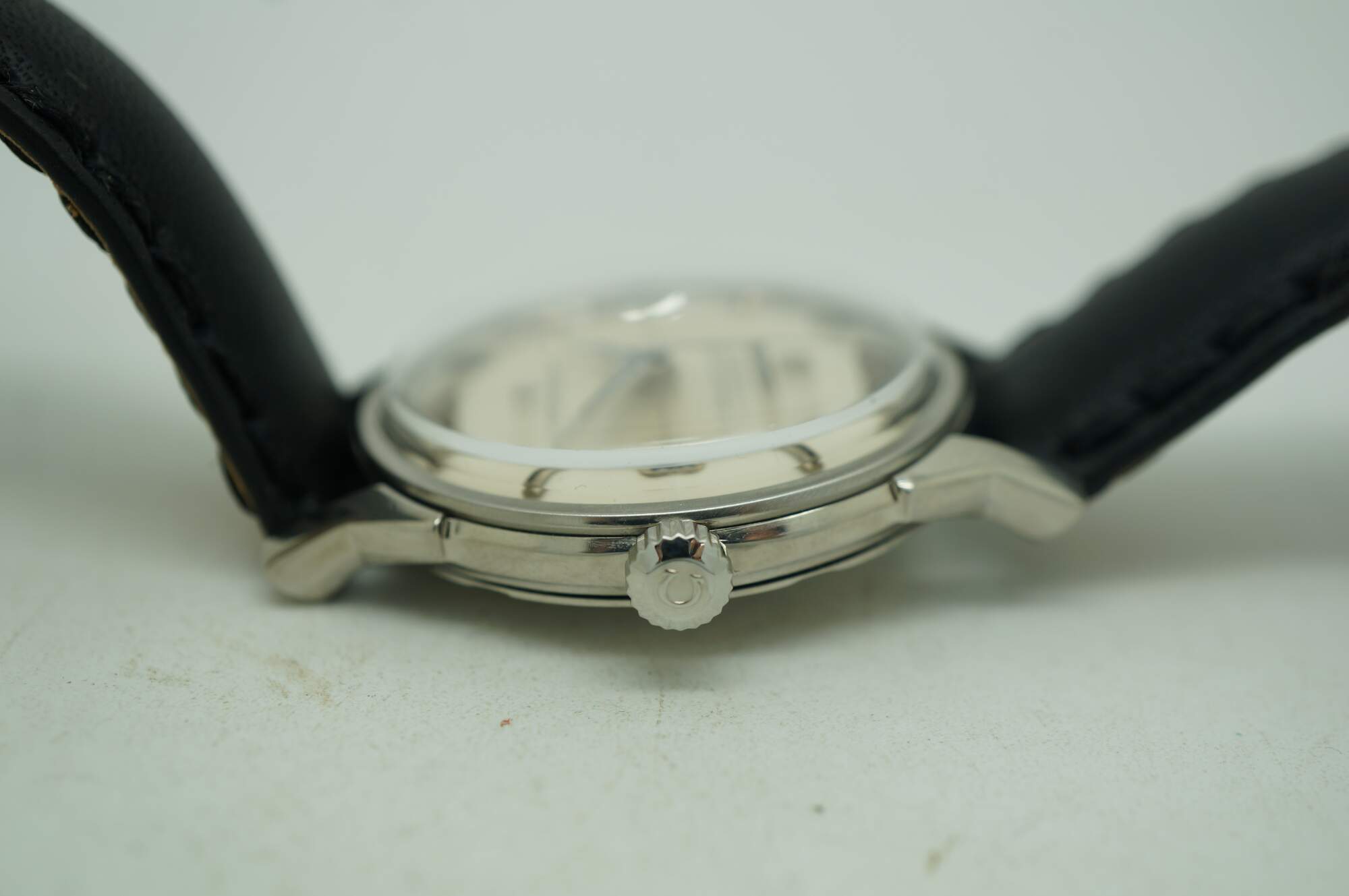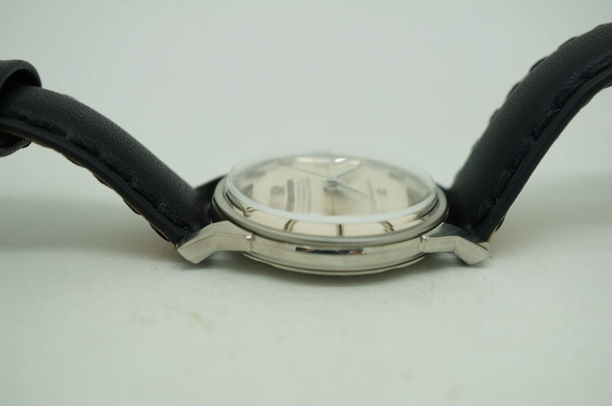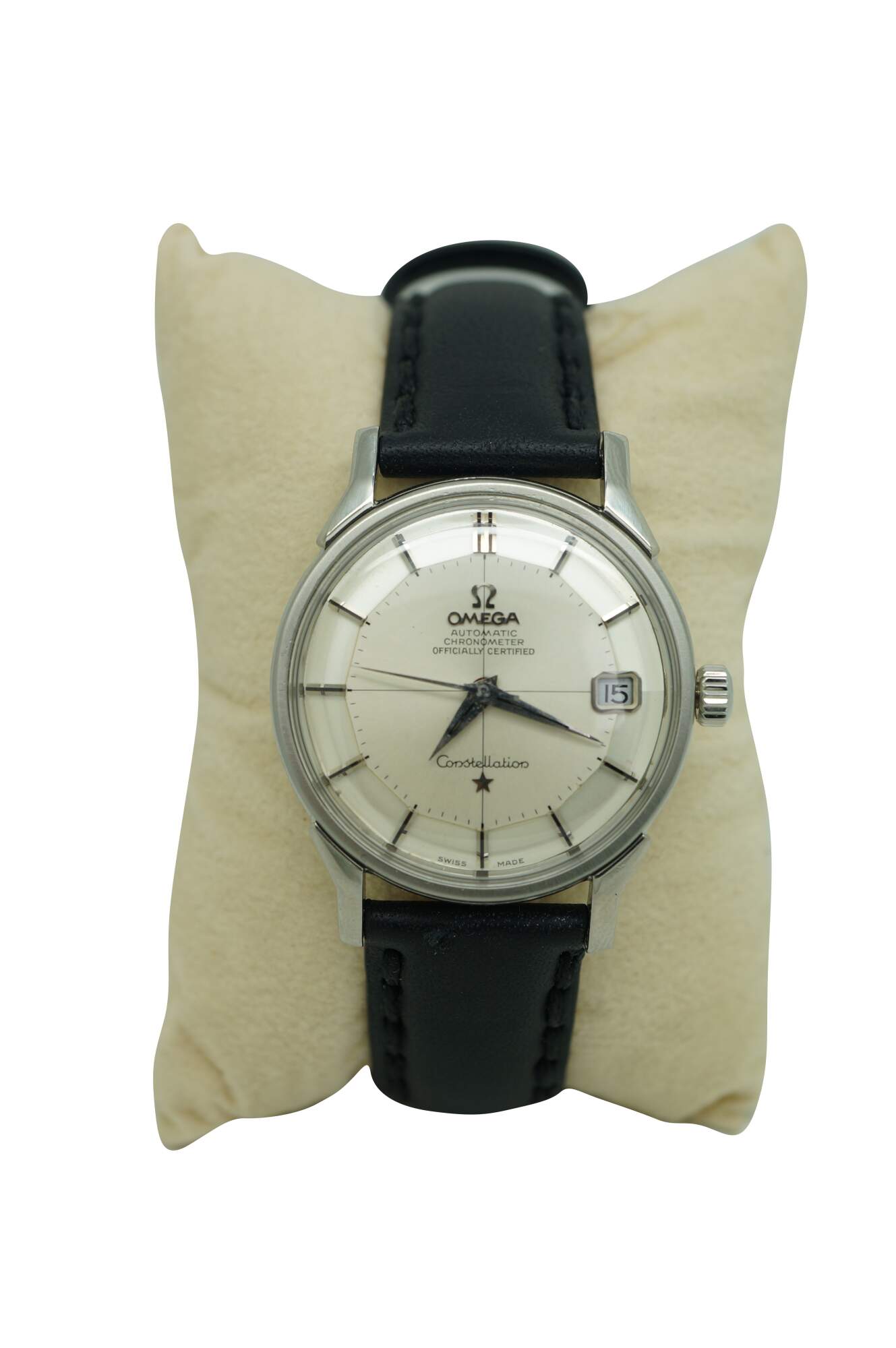 Vintage circa 1963-1967 Omega Constellation Automatic Chronometer Officially Certified wrist watch. Silver / chrome color stainless steel case; white dodecahedron shaped / pie pan dial with black and silver tick marks and hands; date number at right. Omega Watch Company - Swiss Made - 168.005 - SGR - Acier Inoxydable. Movement Unadjusted - Five (5) Positions and Temperature - Twenty Four 24 Jewels - 564 - 2535xxxx. New band by deBeer Watch Bands - Item Number 923-18 - Saddle Leather (hand stitching) - Black - 18mm - Weber Jewelers of Dayton, OH.