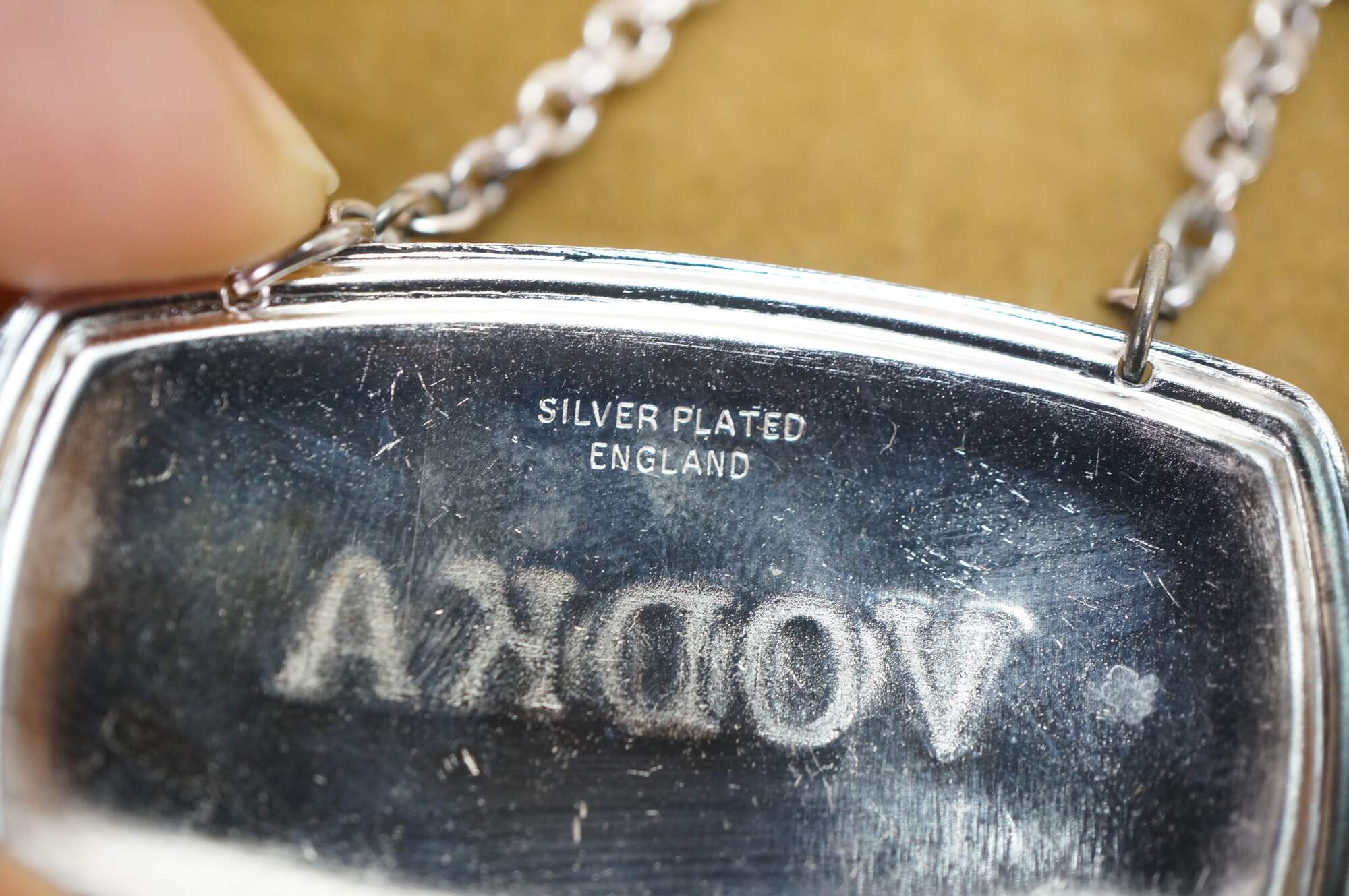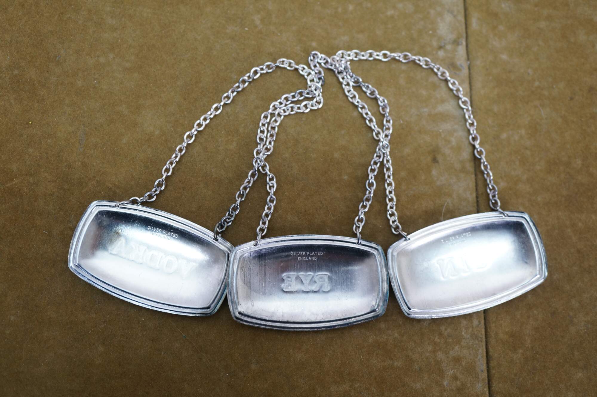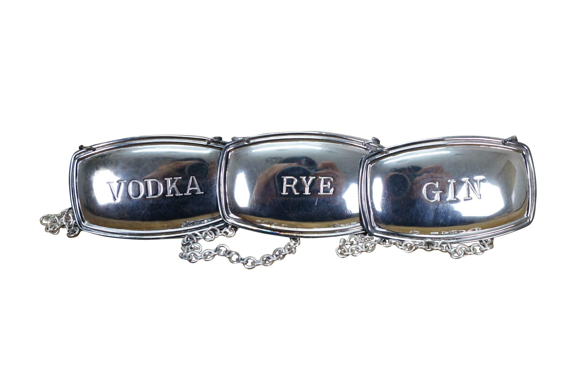 Set of three vintage silverplate decanter / bottle labels / charms on chain. Vodka, Rye and Gin. Rounded rectangular shape with grooved edge. Made in England.