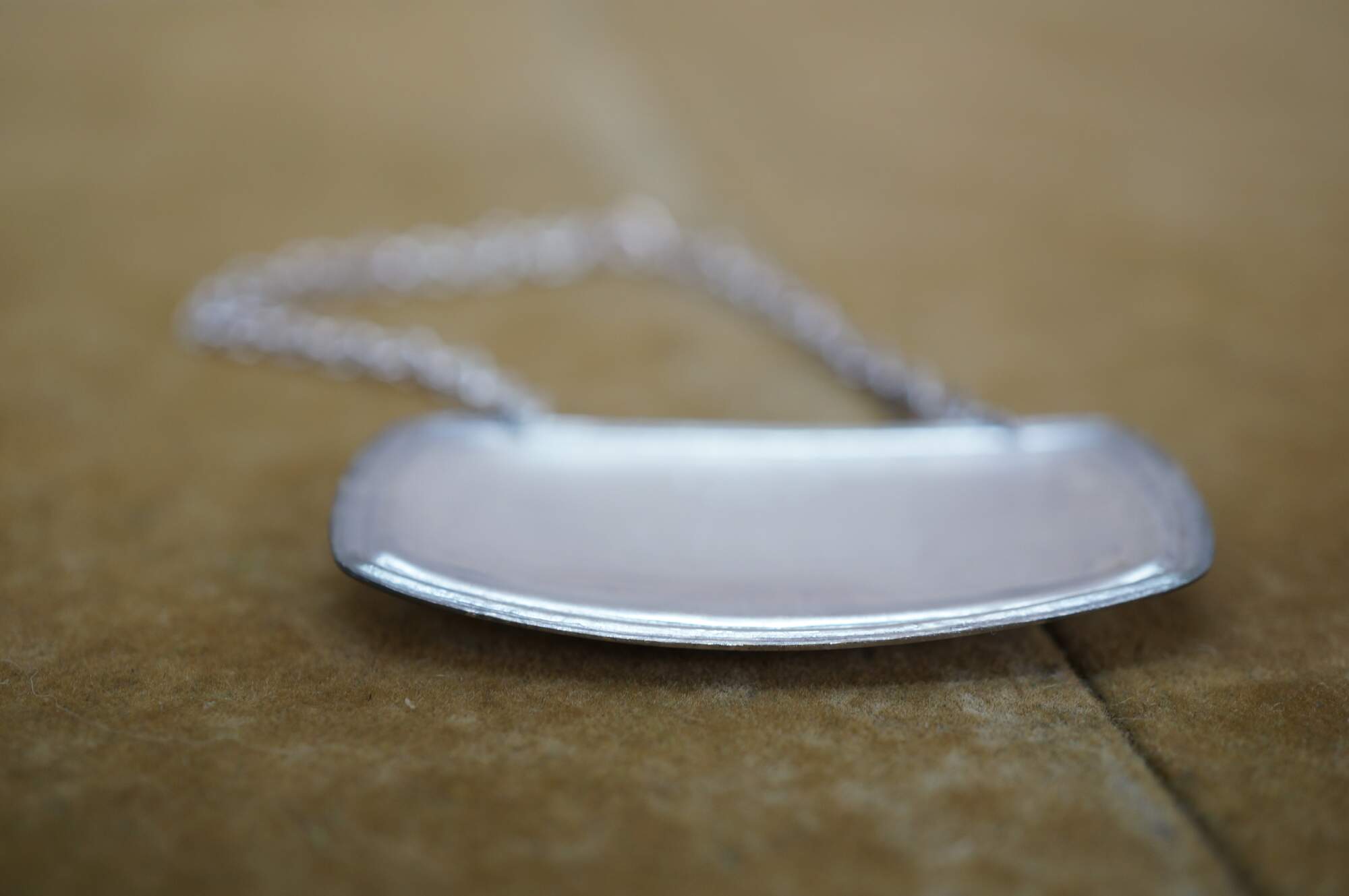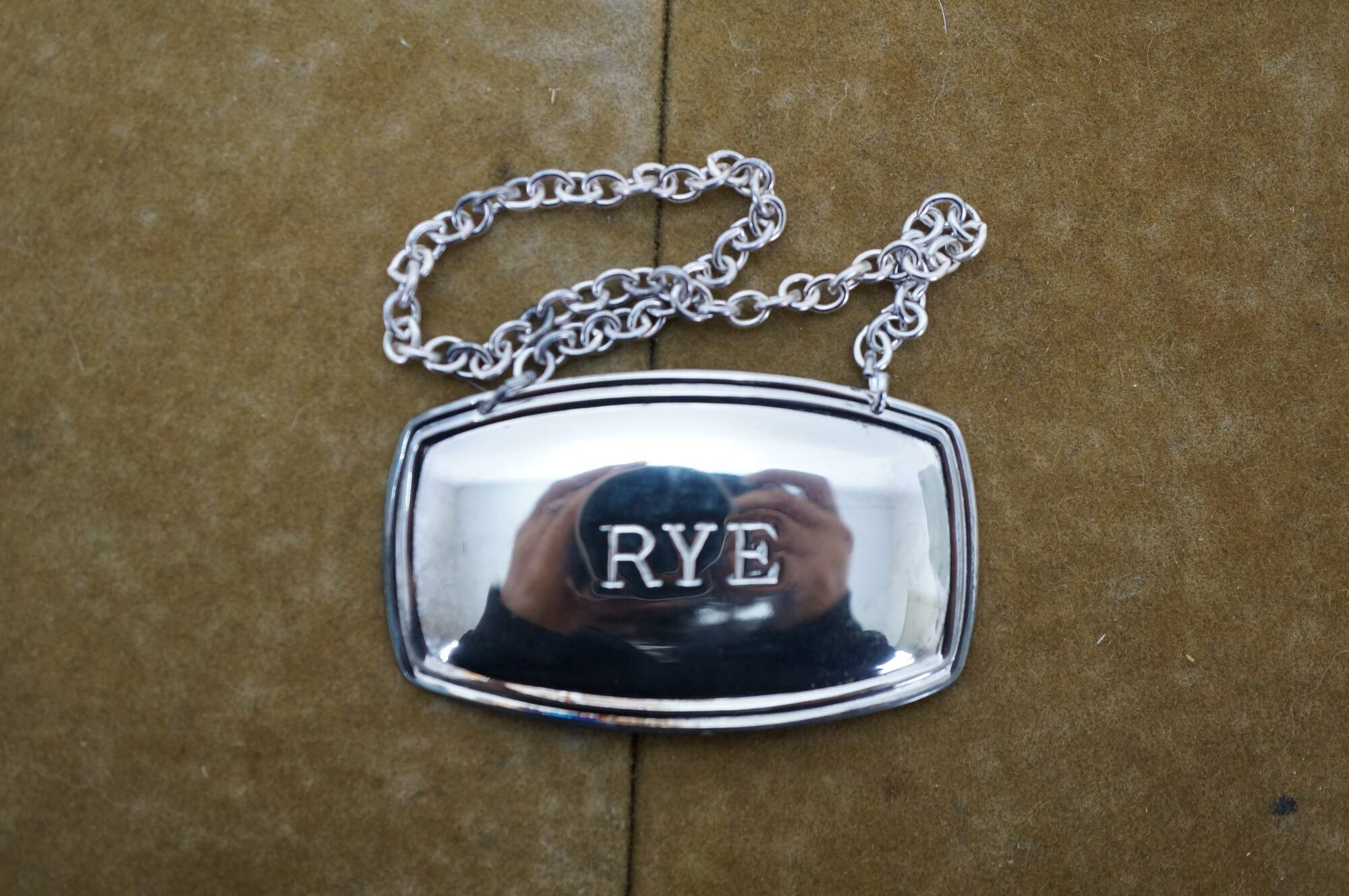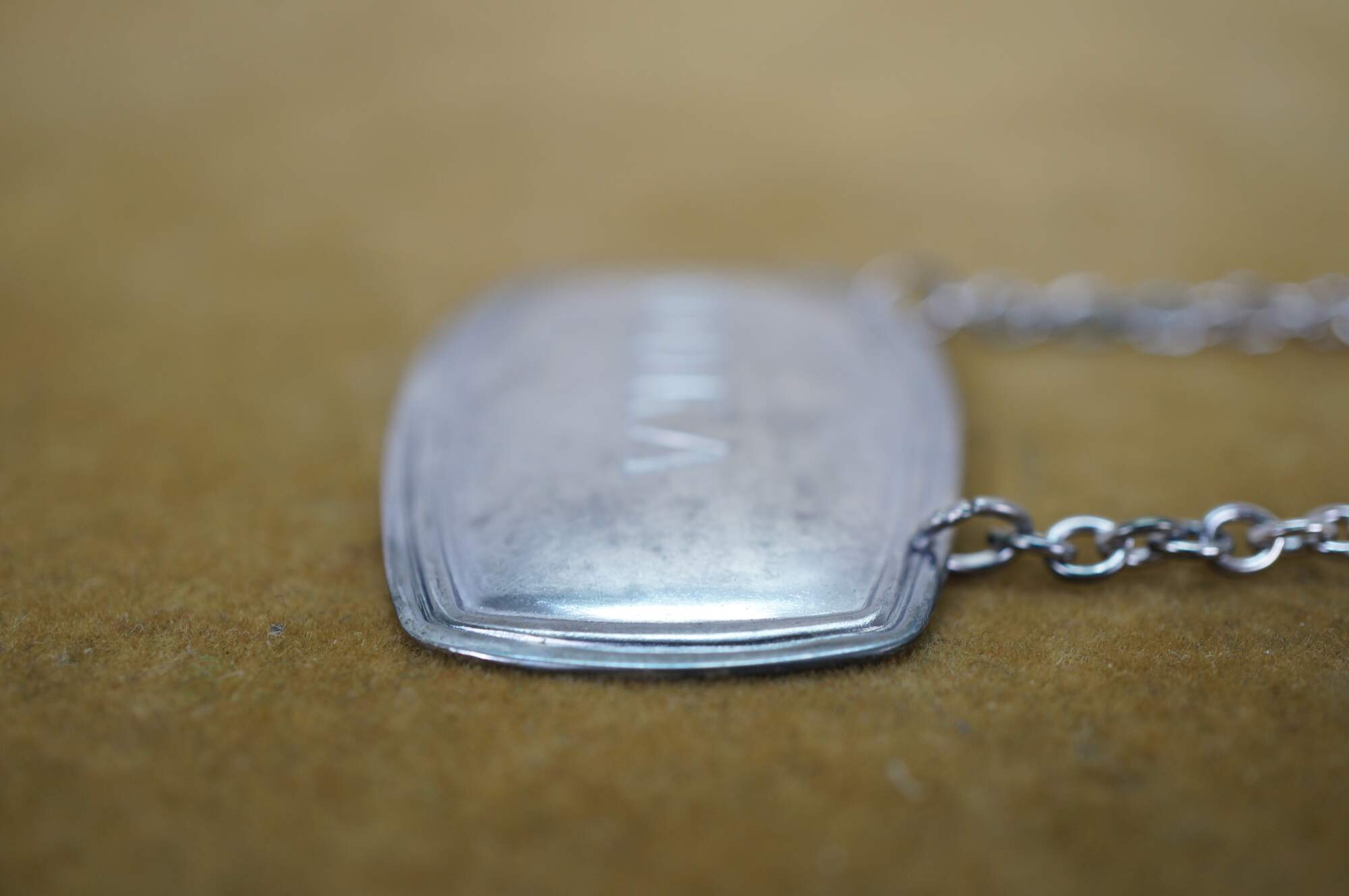 Set of three vintage silverplate decanter / bottle labels / charms on chain. Vodka, Rye and Gin. Rounded rectangular shape with grooved edge. Made in England.