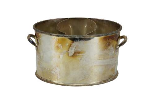 Circa 1990's silver plated wine cooler / chiller / bucket with removable ice dividers. Oval shape with plain fixed bail handles and rope twist edge. Dividers can be flipped or removed to accommodate different setups. Monogrammed with the initials RMH. Made in India.