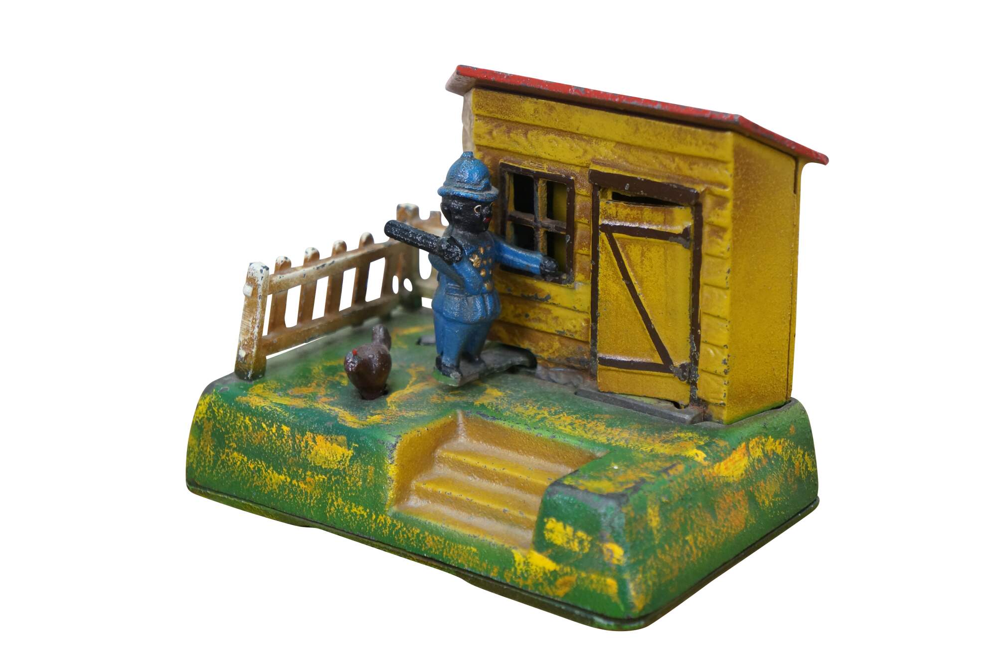 "Action of the "Uncle Remus Bank" is a masterpiece of synchronization. The figure of the cop is pulled back into position (refer to Figure 1). A coin is then placed into the slot atop the hen house roof. The operating lever, in the form of the chicken and positioned in front of the coop, is pressed downward. Simultaneously, the cop, nightstick raised, scoots around the side of the house. The coin then falls into the bank; Uncle Remus slams the door shut, hiding himself from the pursuing policeman. Deposits are retrieved by opening the square key-lock coin retainer underneath the base.