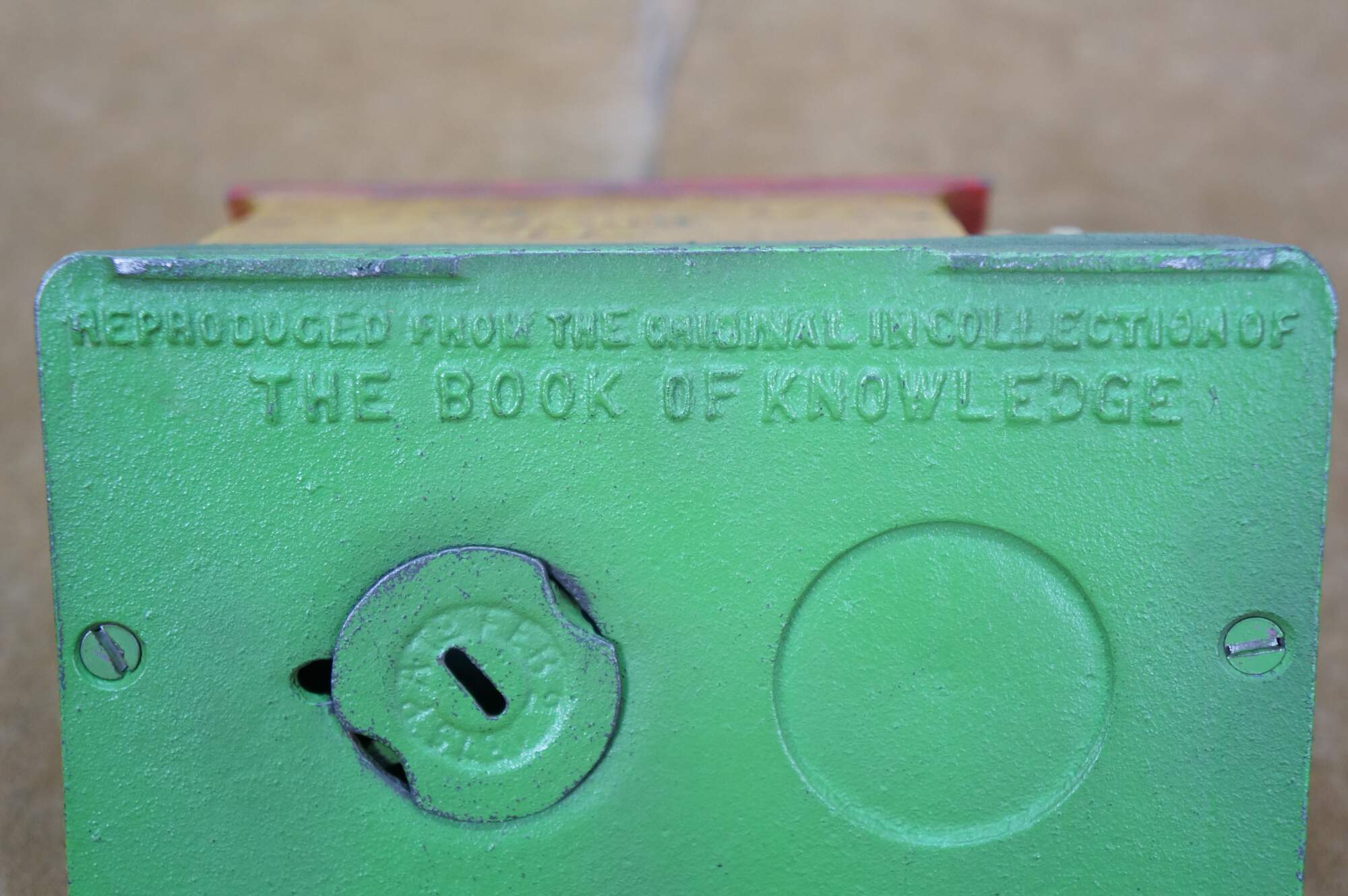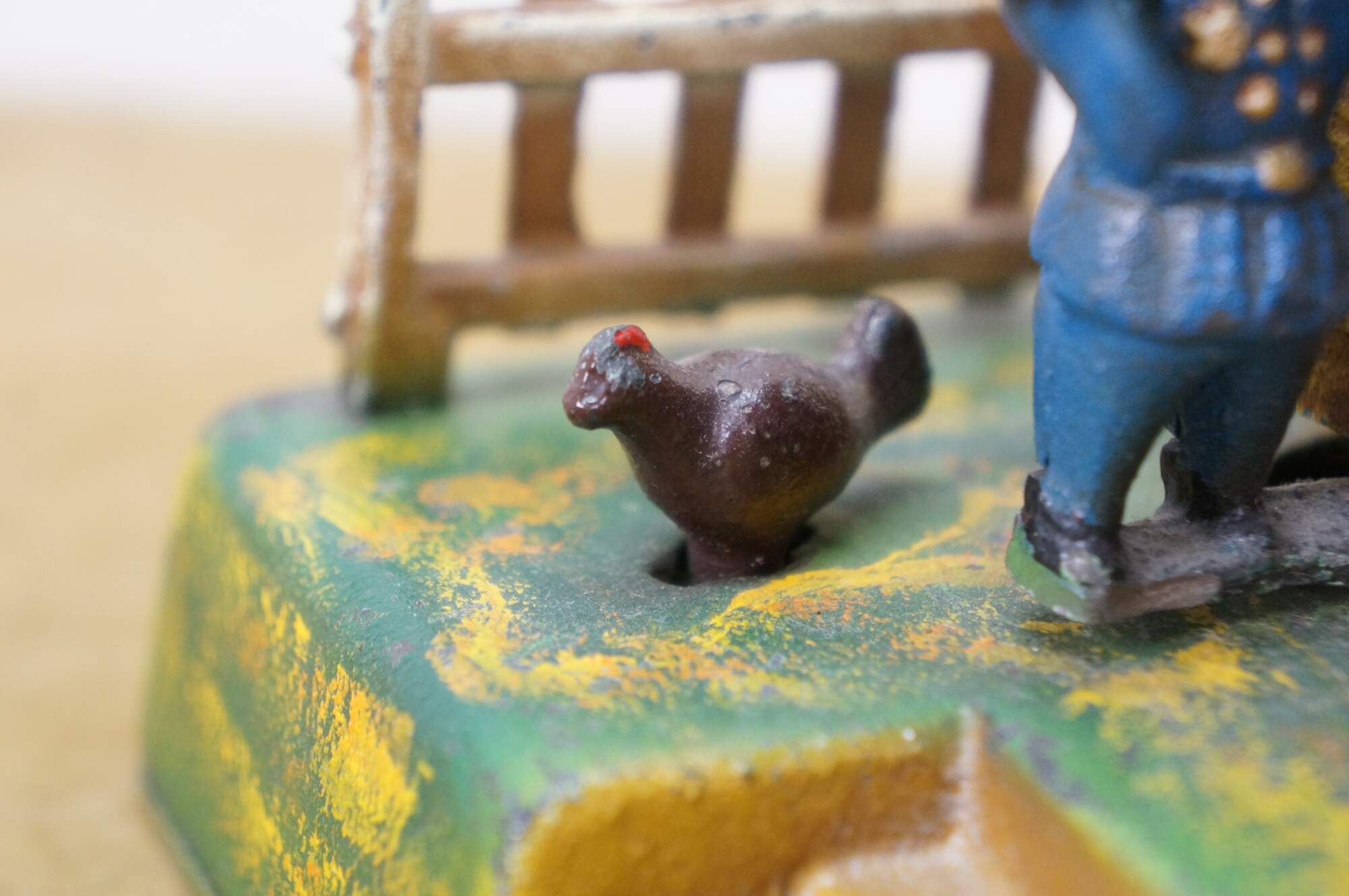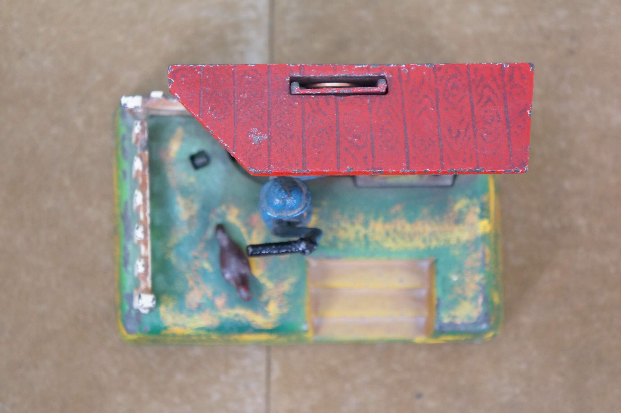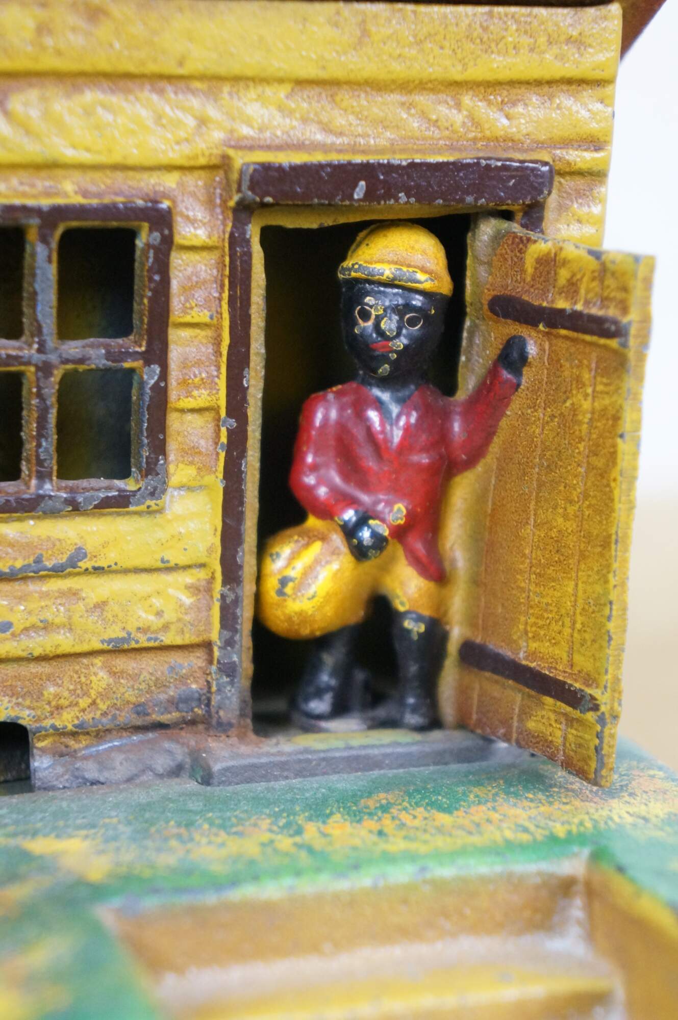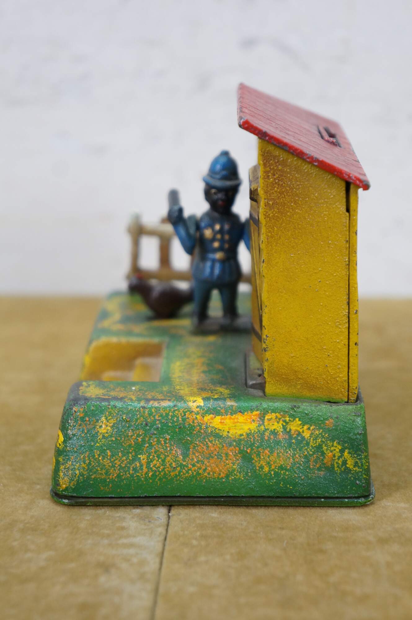 Vintage 20th century Uncle Remus number 136 cast iron mechanical coin bank. Depicts a thief with a sack at the door of a yellow and red hen house, while a policeman in traditional beat cop attire comes around the corner with his Billy club. A chicken stands in the foreground by a set of steps. Reproduced from the Original in Collection of The Book of Knowledge. Patd Feb 9, 1873.