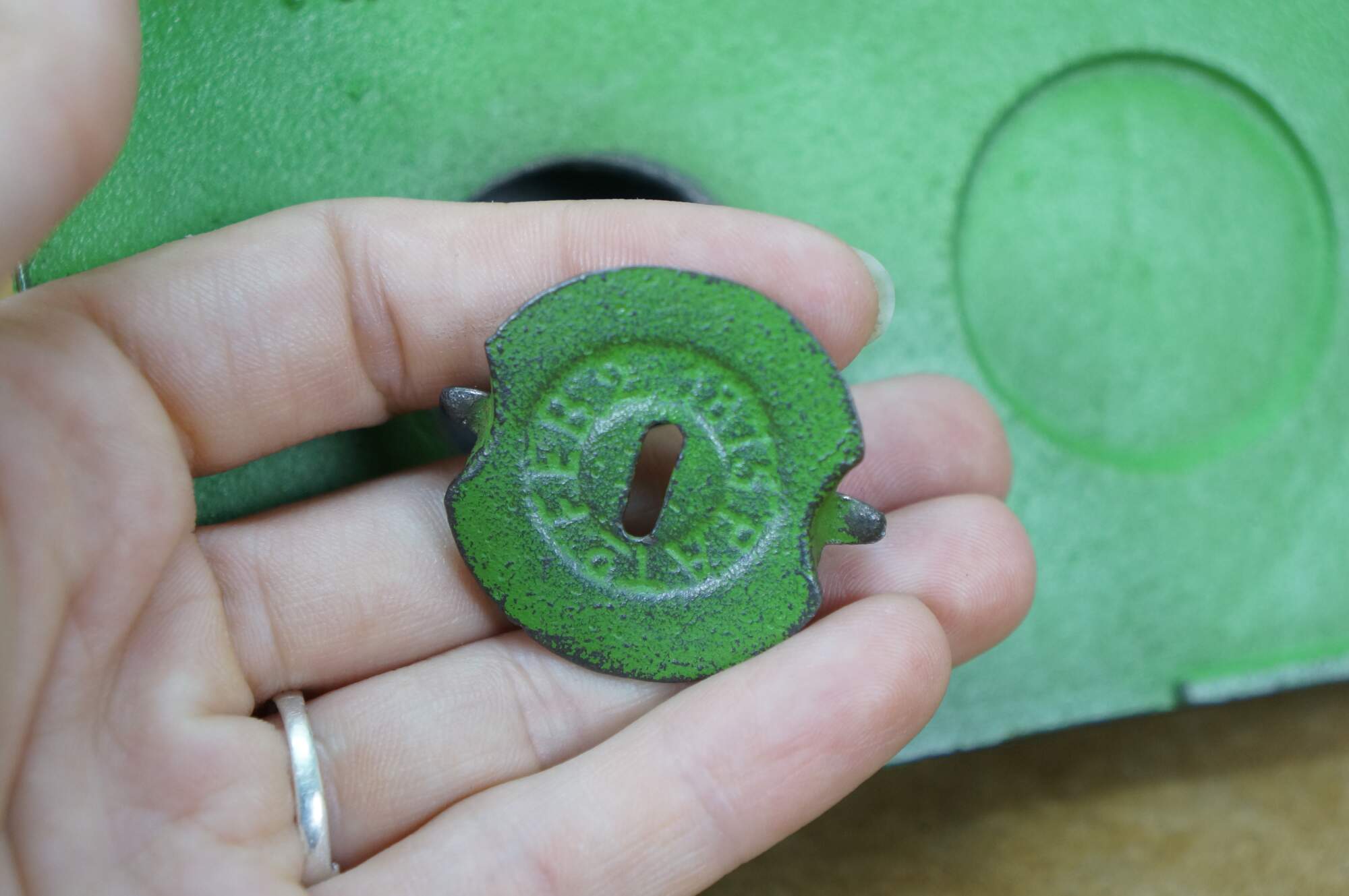 Spring mechanism not currently functional; part of fence post missing; wear to paint