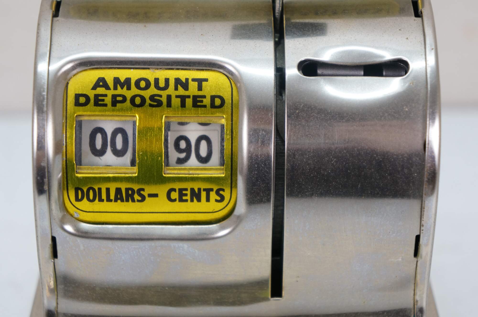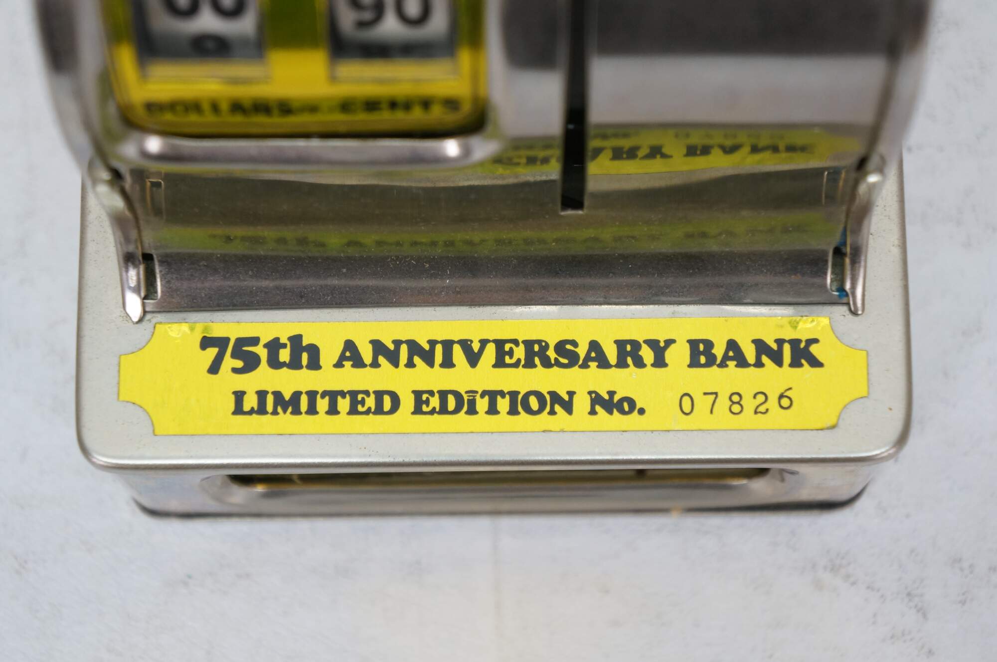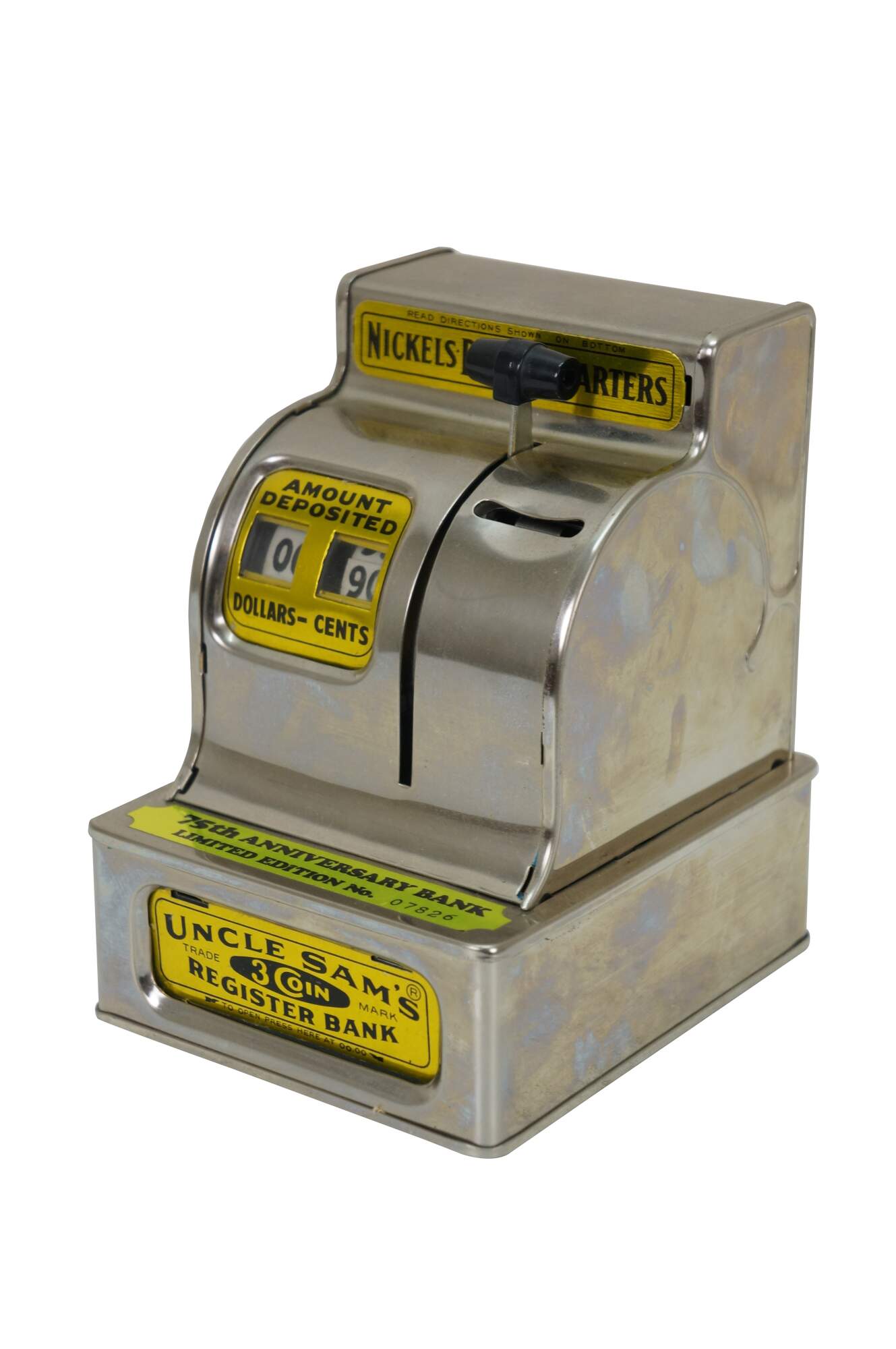 Vintage 1980's 75th Anniversary Limited Edition of the Uncle Sam's 3 Coin Register Bank. Chrome cash register shaped body with black plastic handled lever and gold metallic text panels. Number 07826. Wesco International Inc. Made in Korea.