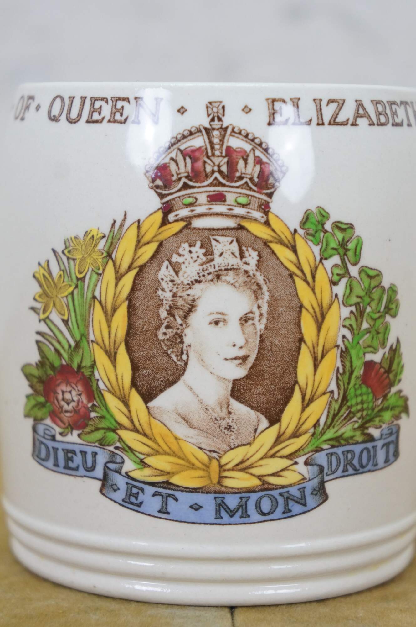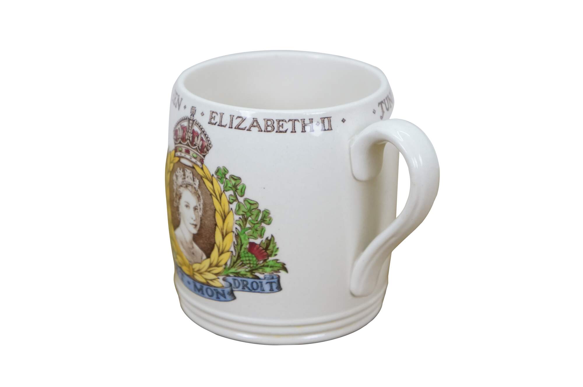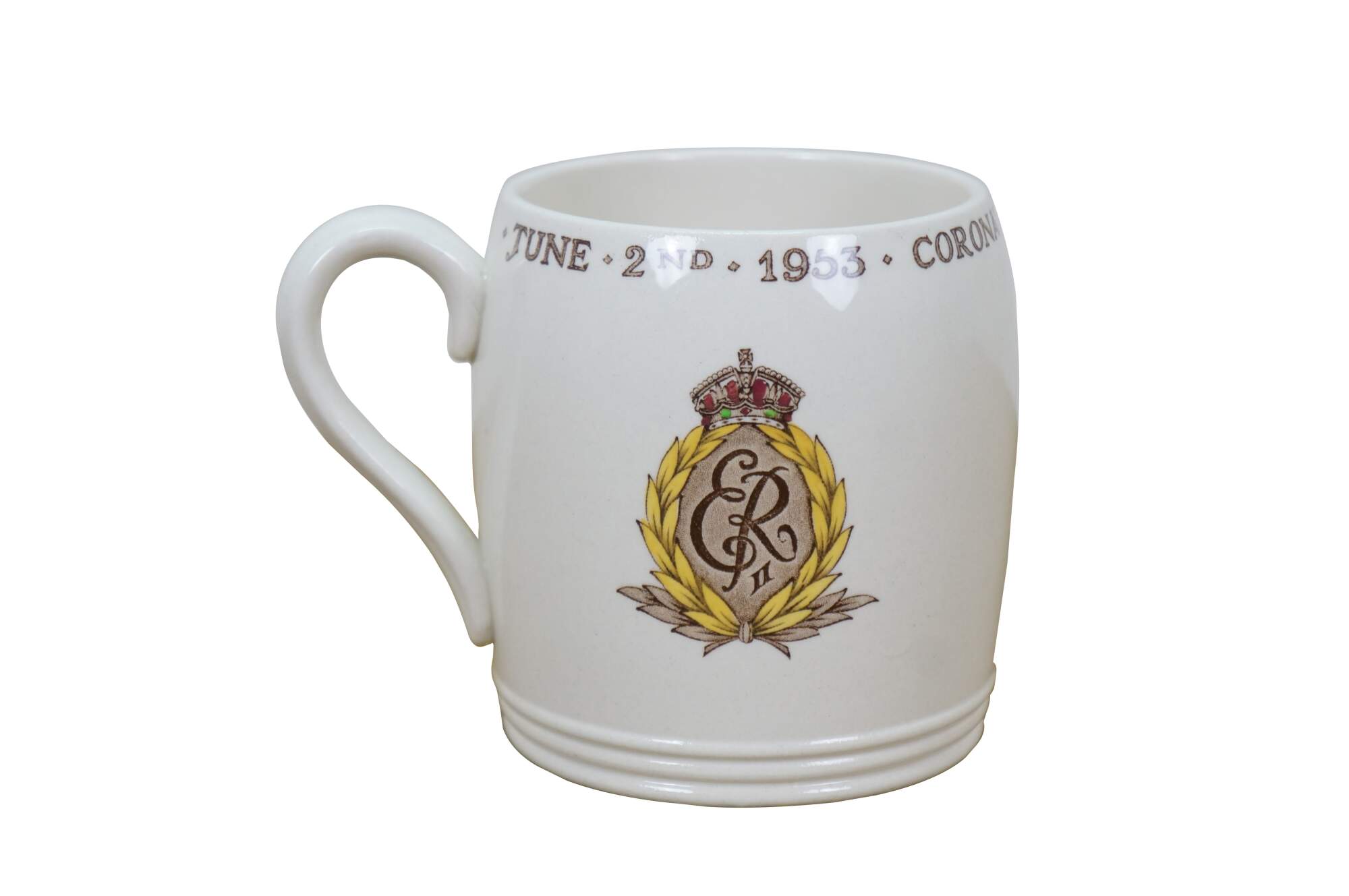 Mid 20th century Spode pottery mug commemorating the June 2nd 1953 Coronation of Queen Elizabeth II. Barrel shaped white ceramic mug with a portrait of the Queen on one side and her cypher on the other.