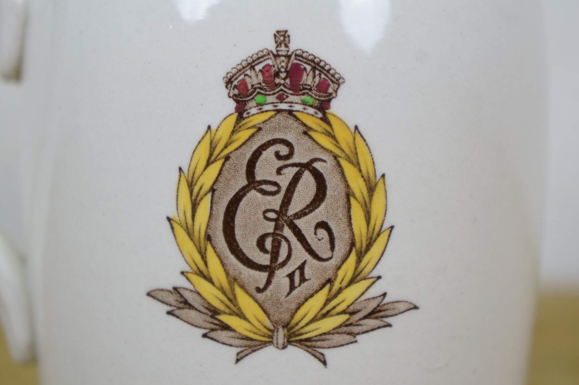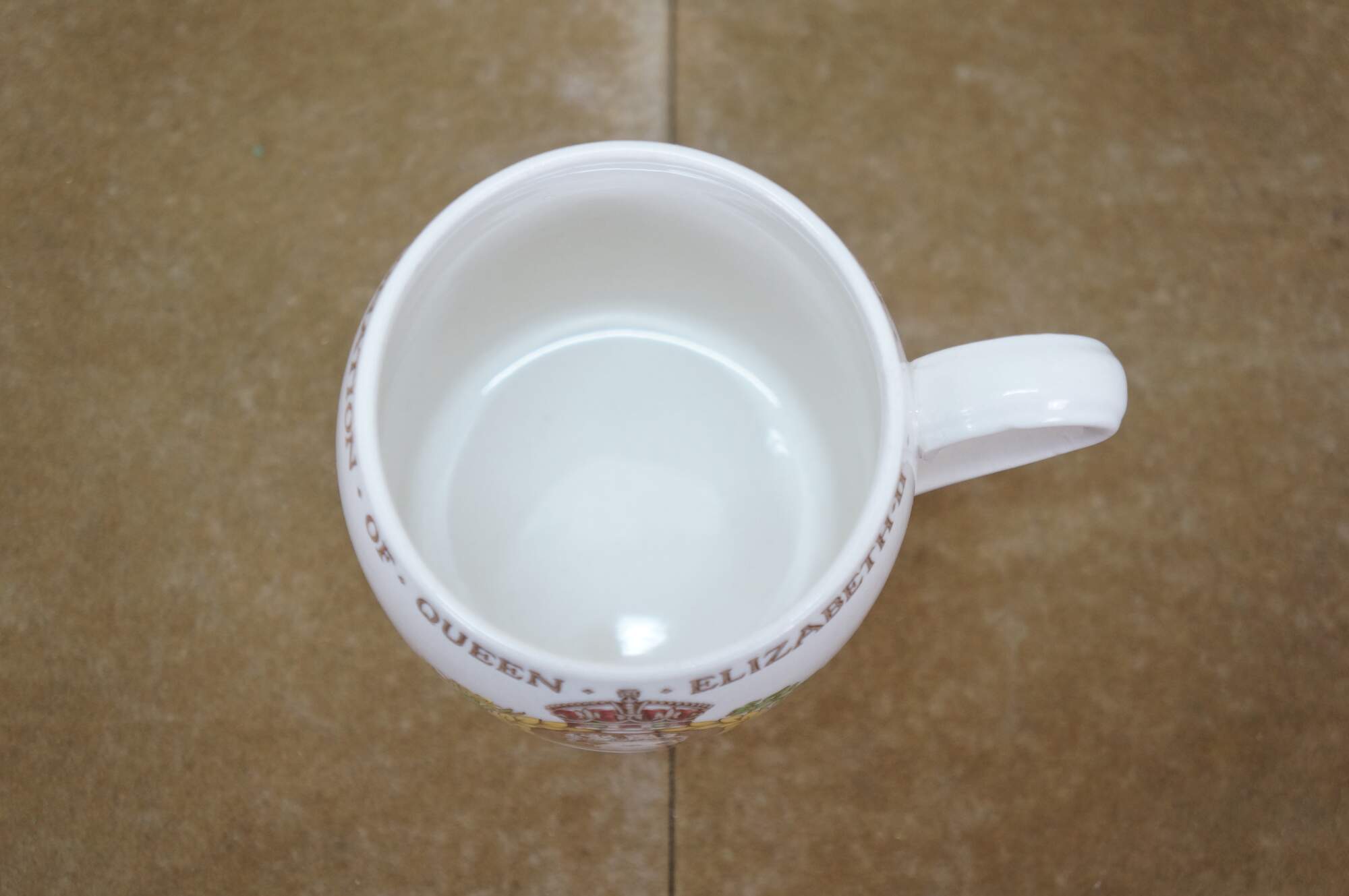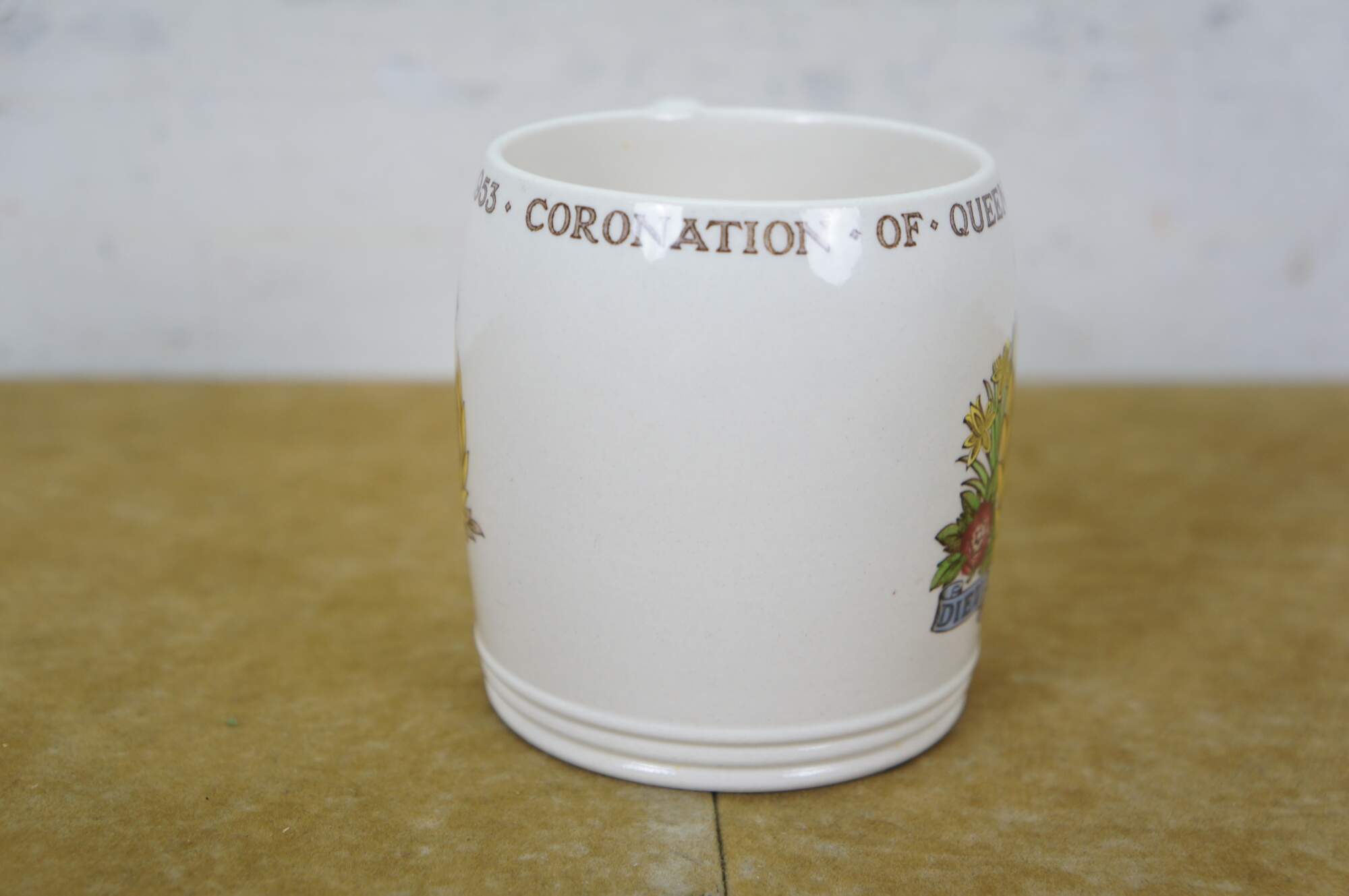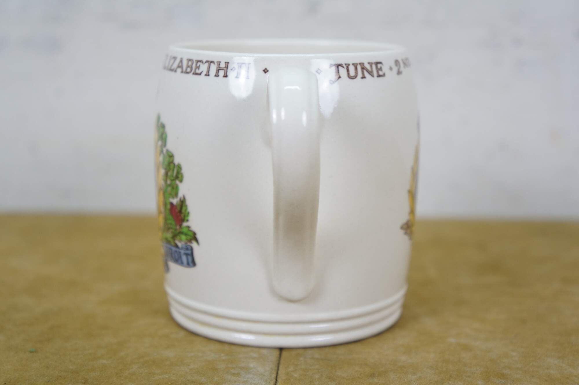 Mid 20th century Spode pottery mug commemorating the June 2nd 1953 Coronation of Queen Elizabeth II. Barrel shaped white ceramic mug with a portrait of the Queen on one side and her cypher on the other.