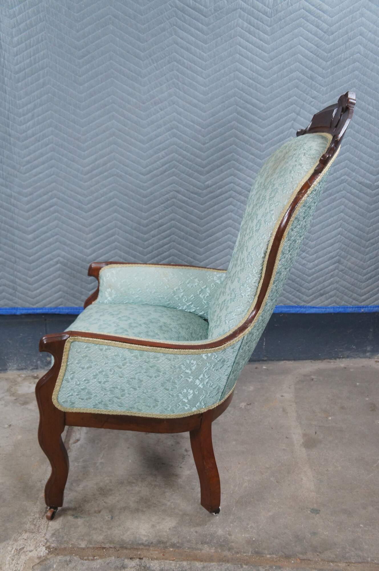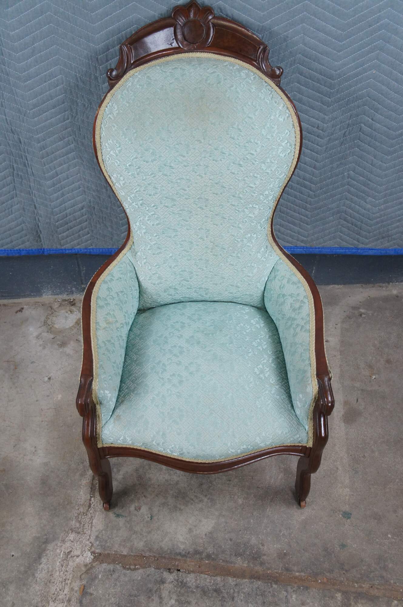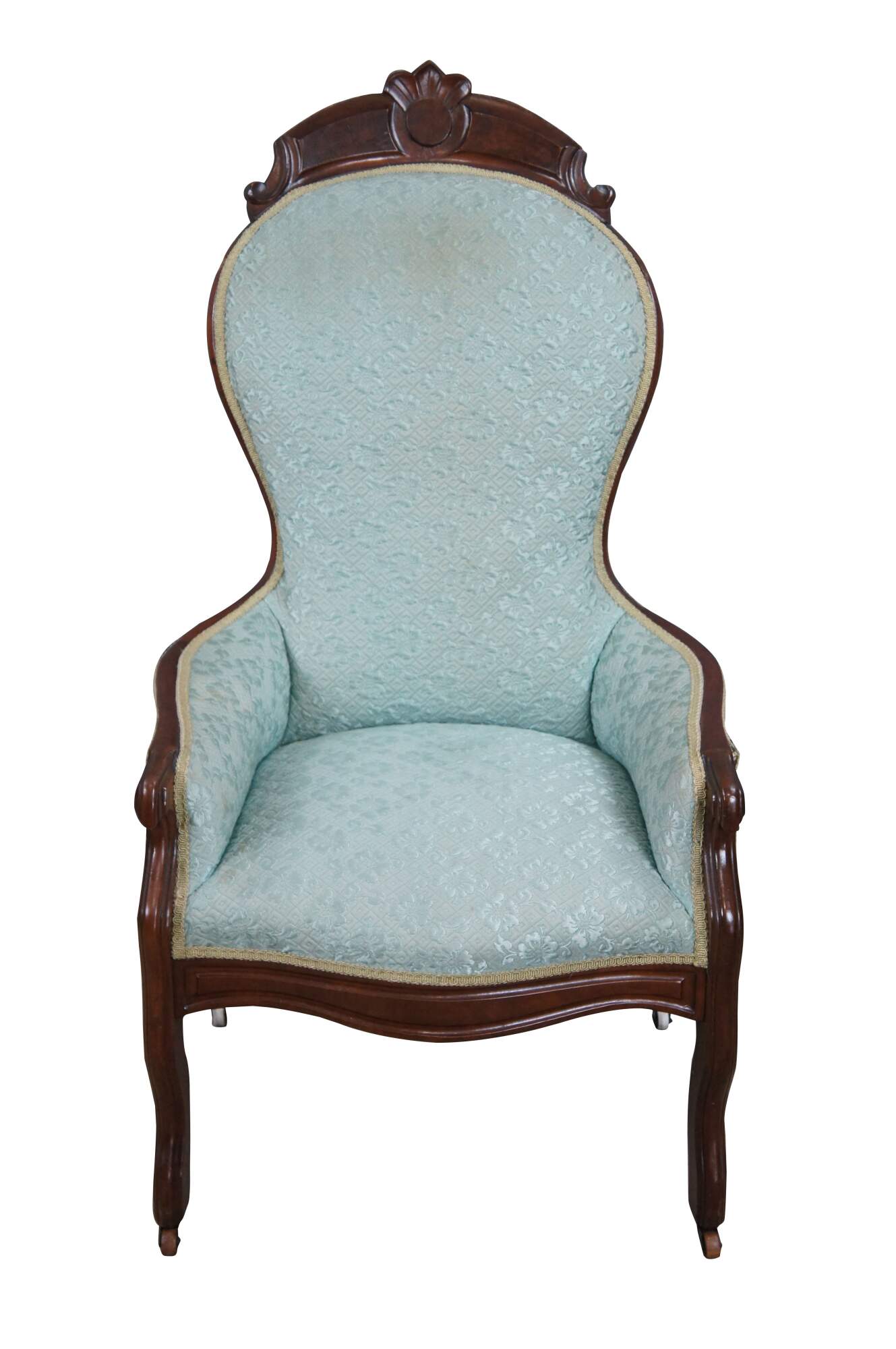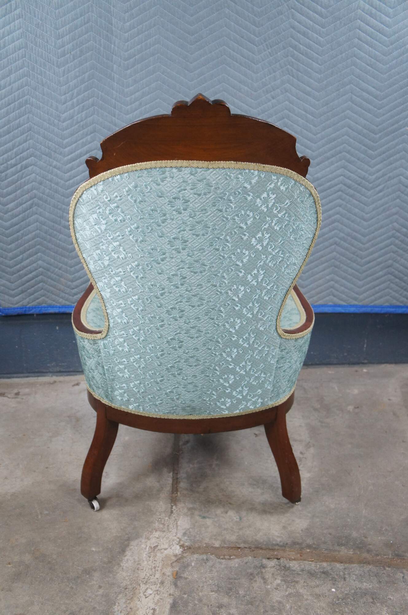 Antique Victorian balloon back arm chair. Made of walnut featuring high back with paneled foliate crest, low arms and serpentine legs with castors. Upholstery by Shillito's Department Store in Cincinnati. Shillito's was the first department store in Cincinnati in 1830. Shillito's merged with Rikes, before becoming Lazarus, which eventually merged into Macy's.