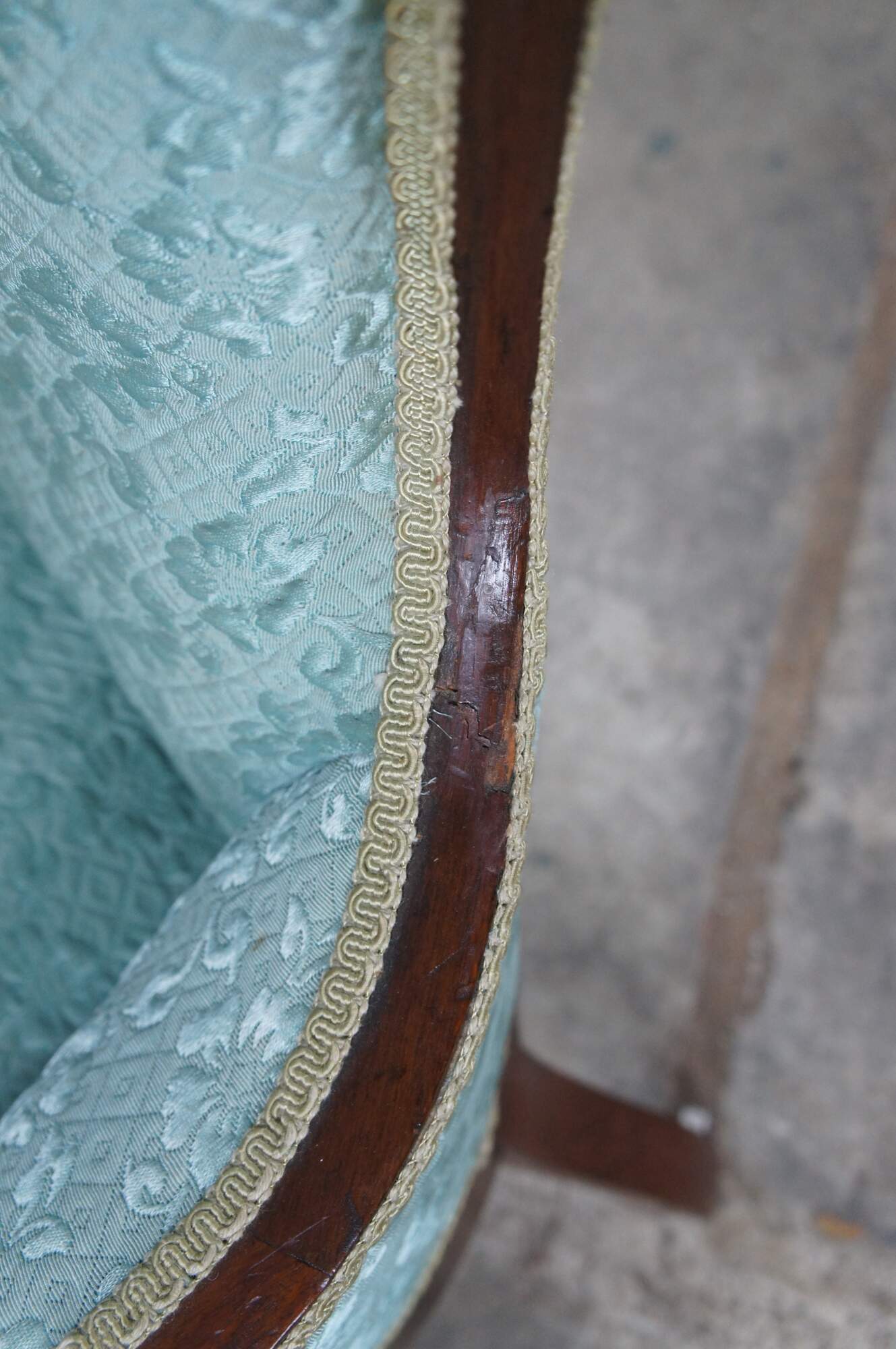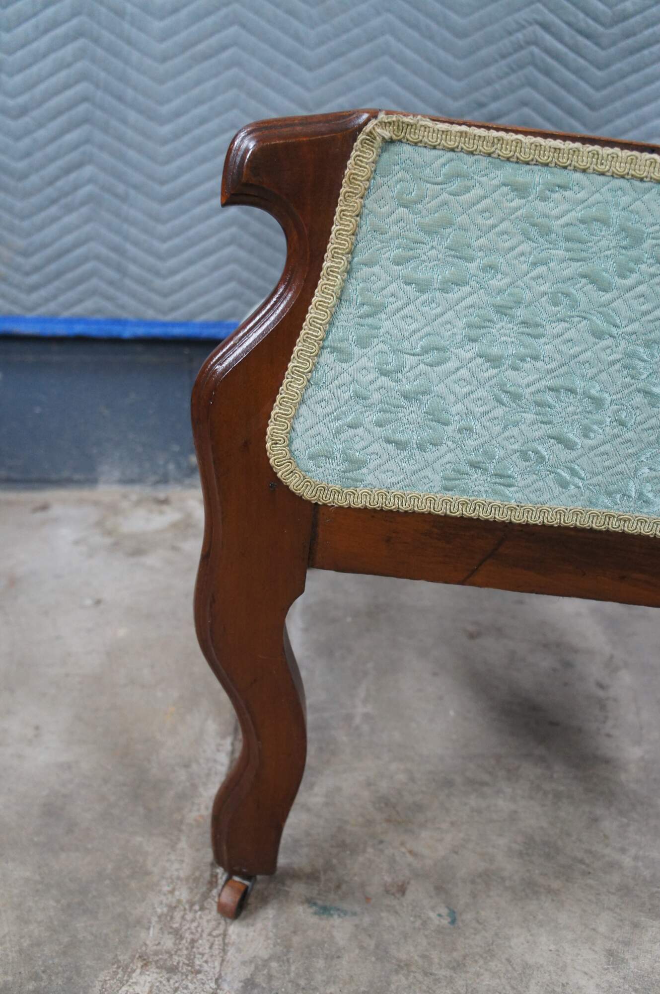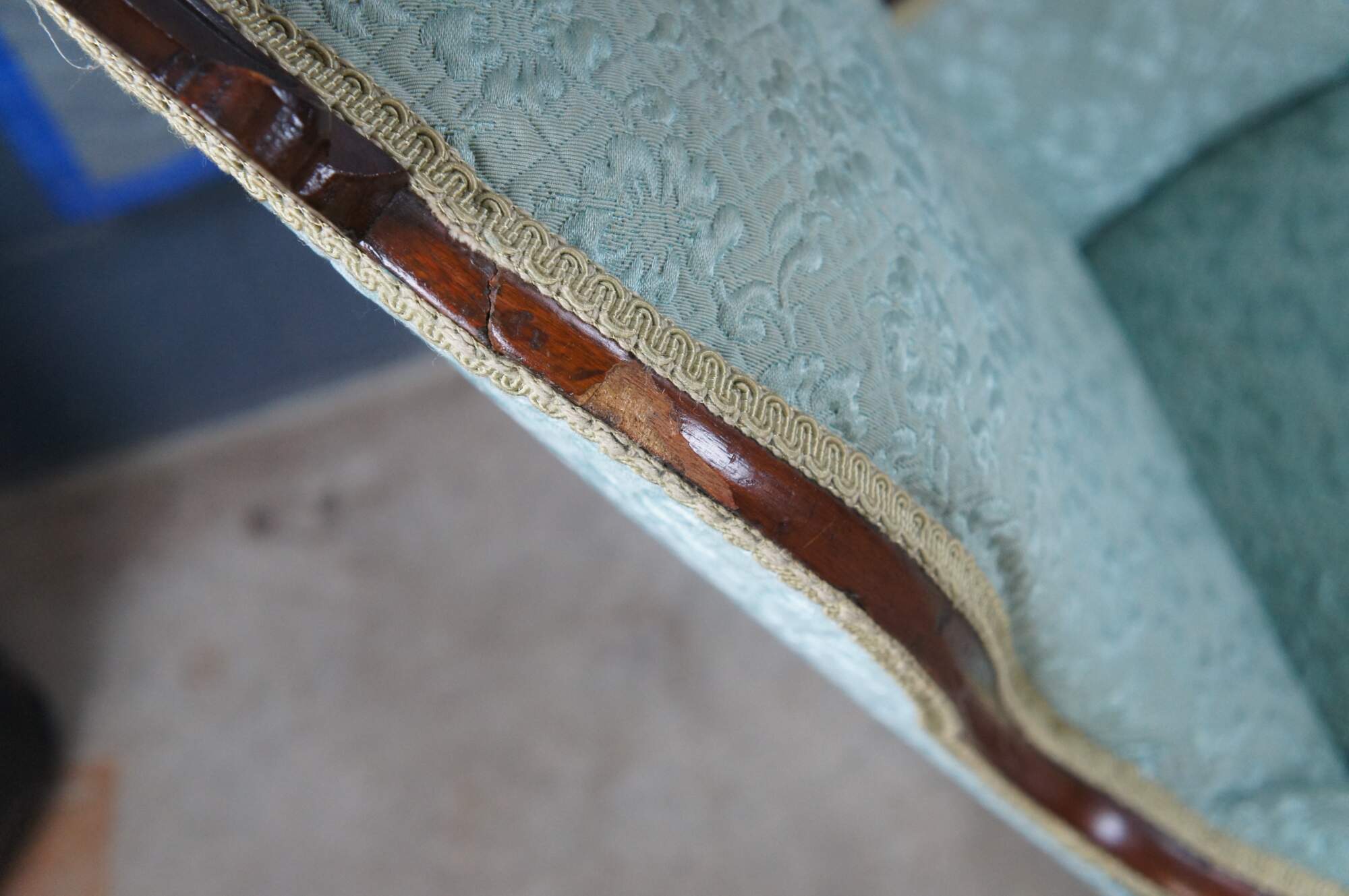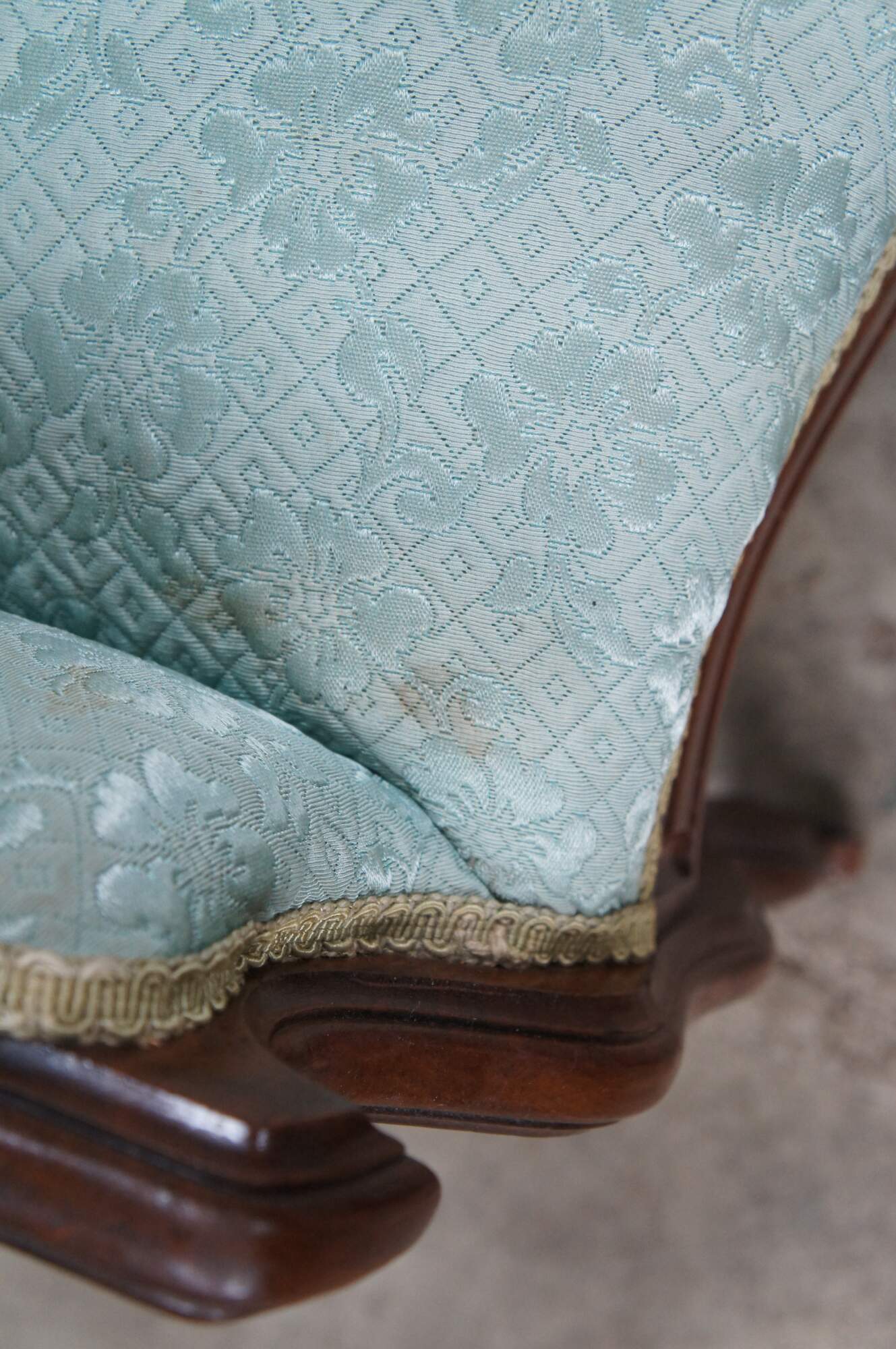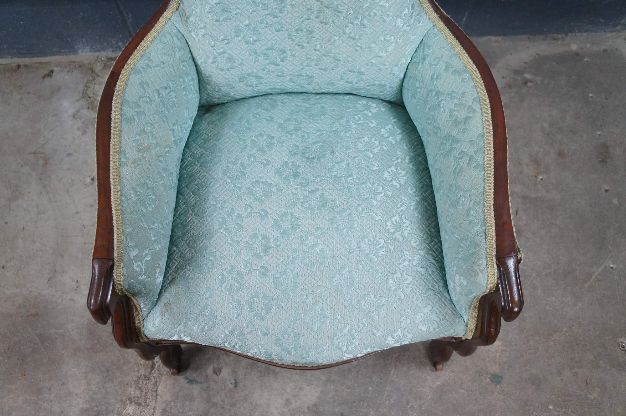 Antique Victorian balloon back arm chair. Made of walnut featuring high back with paneled foliate crest, low arms and serpentine legs with castors. Upholstery by Shillito's Department Store in Cincinnati. Shillito's was the first department store in Cincinnati in 1830. Shillito's merged with Rikes, before becoming Lazarus, which eventually merged into Macy's.