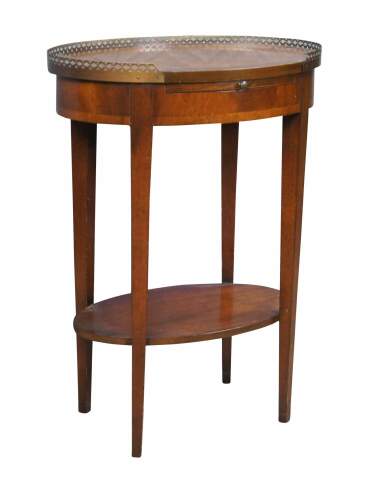 Vintage oval two tiered pierced brass gallery side accent tray table or stand. Made of mahogany featuring English Provincial finish. #1513. 888.