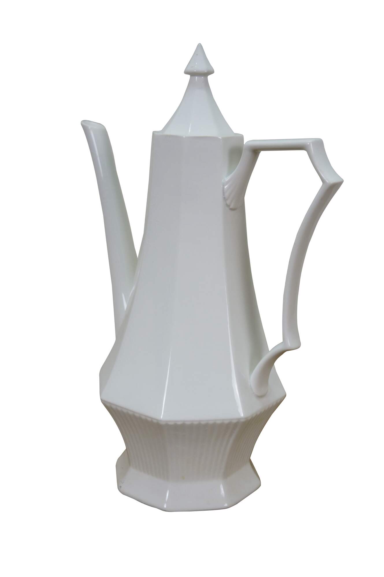 Mid to late 20th century Independence Ironstone white porcelain teapot / coffee pot by Castleton China Inc. Federal / early American inspired faceted style with a tall tapered body and angular handle.