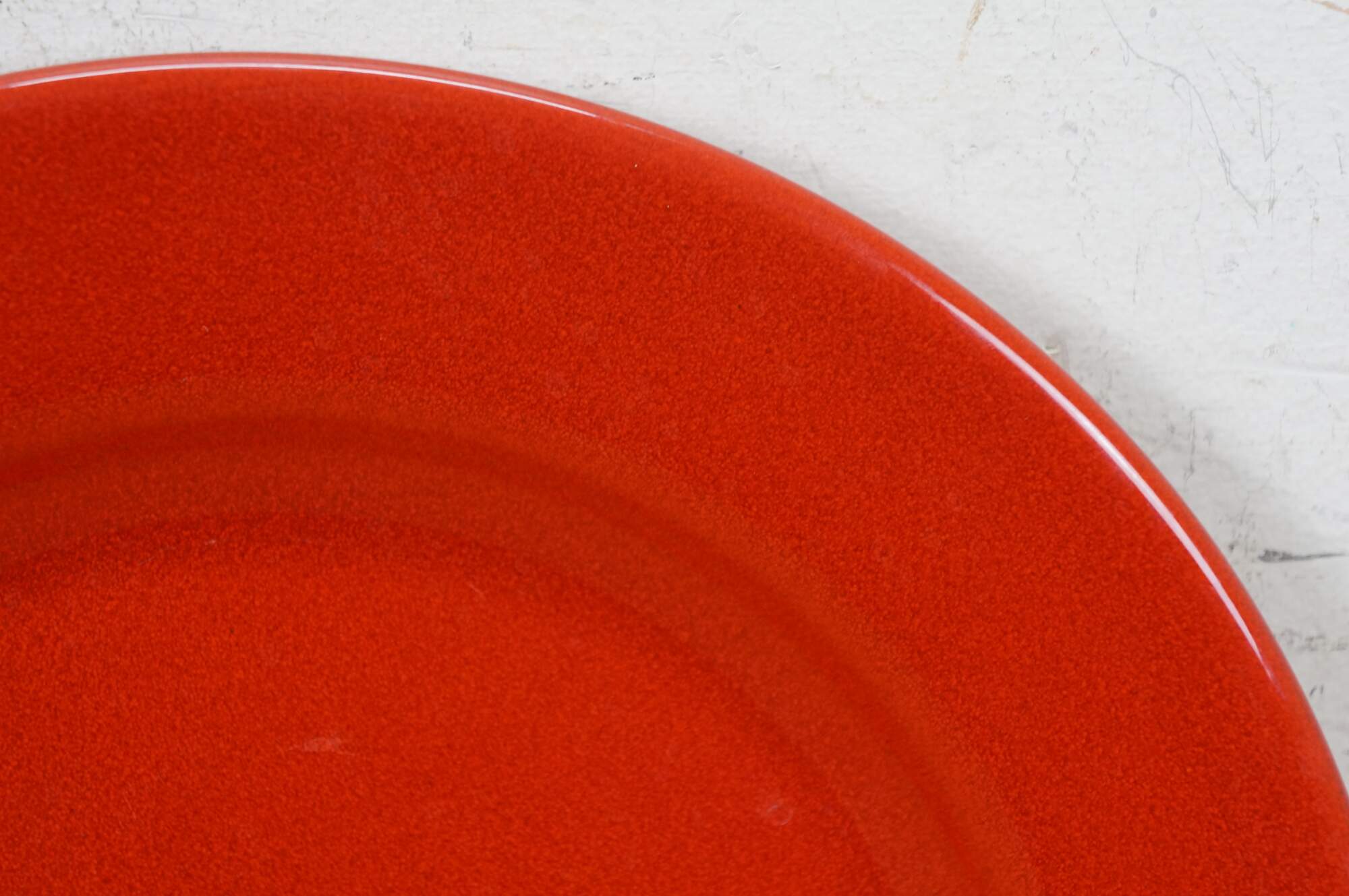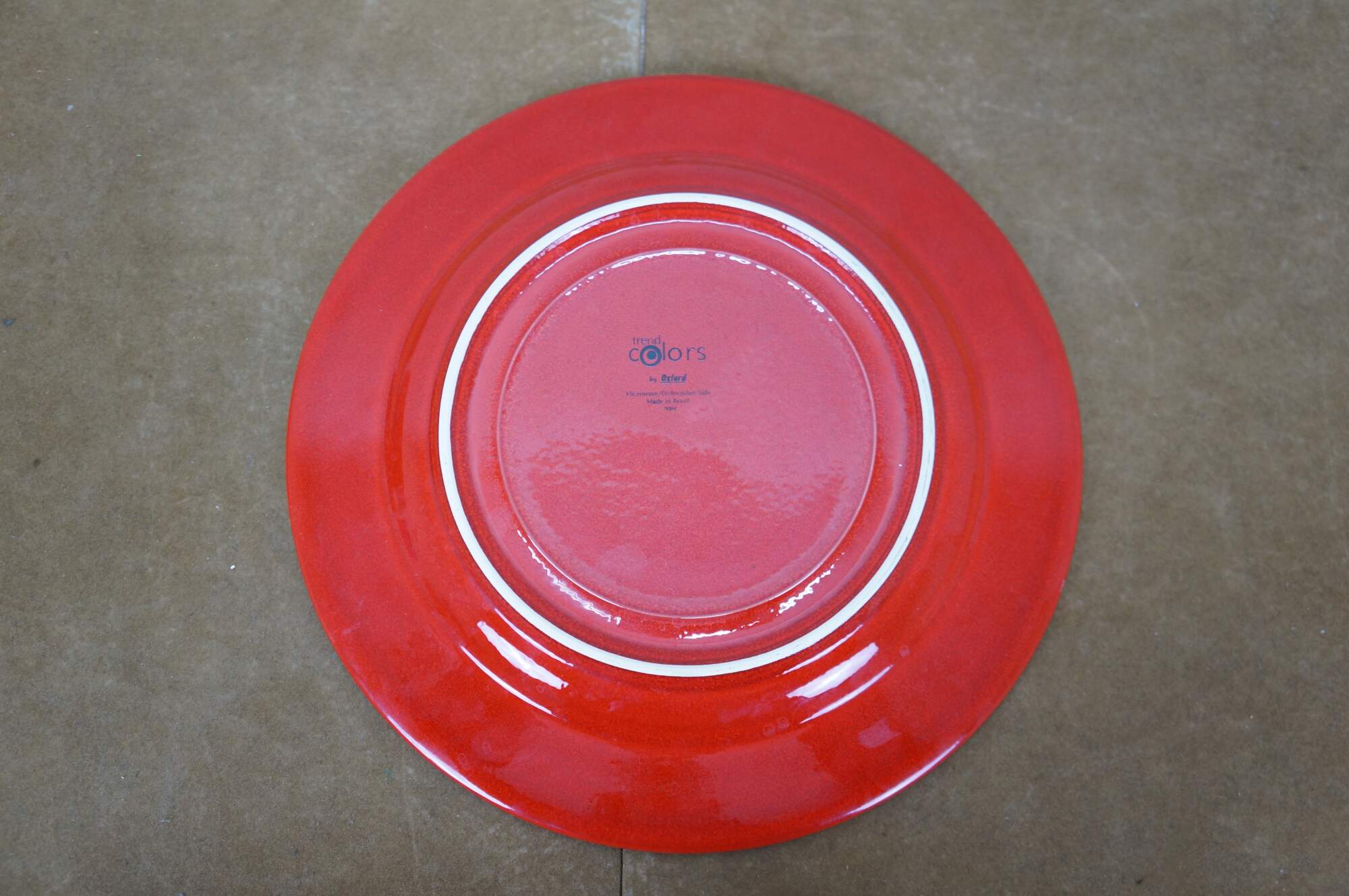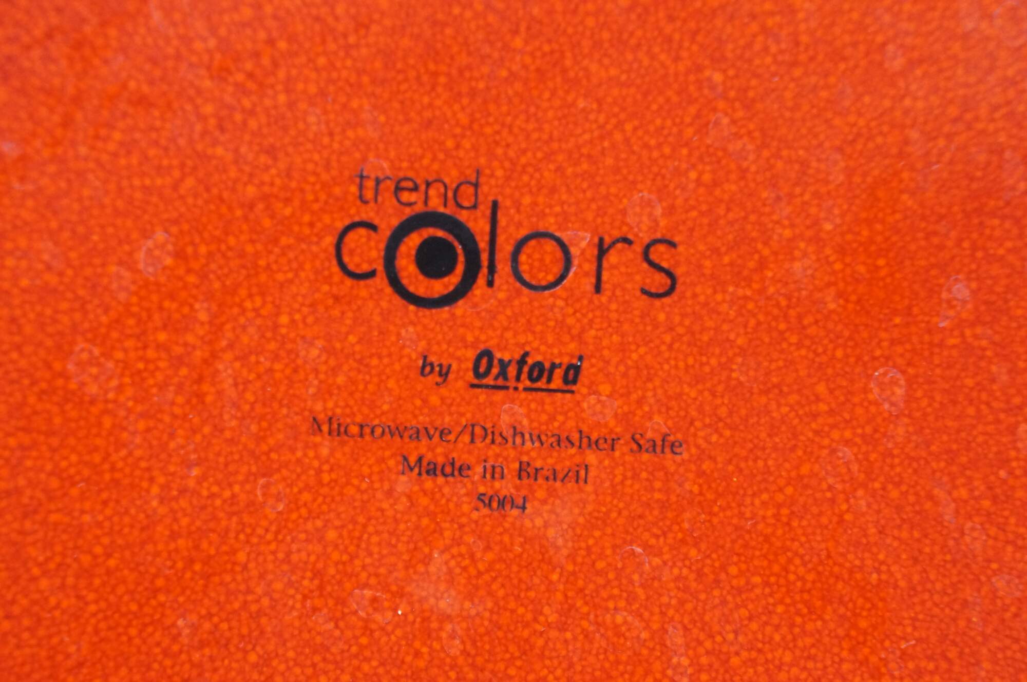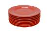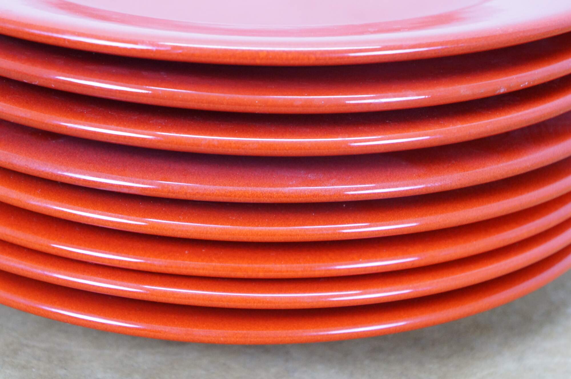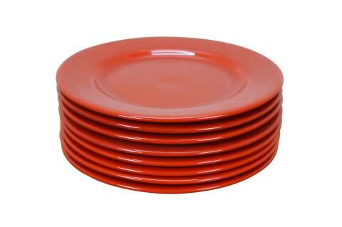 Set of 8 late 20th century Trend Colors by Oxford red ceramic dinner plates. Microwave/ Dishwasher Safe - Made in Brazil - 5004. Discontinued.