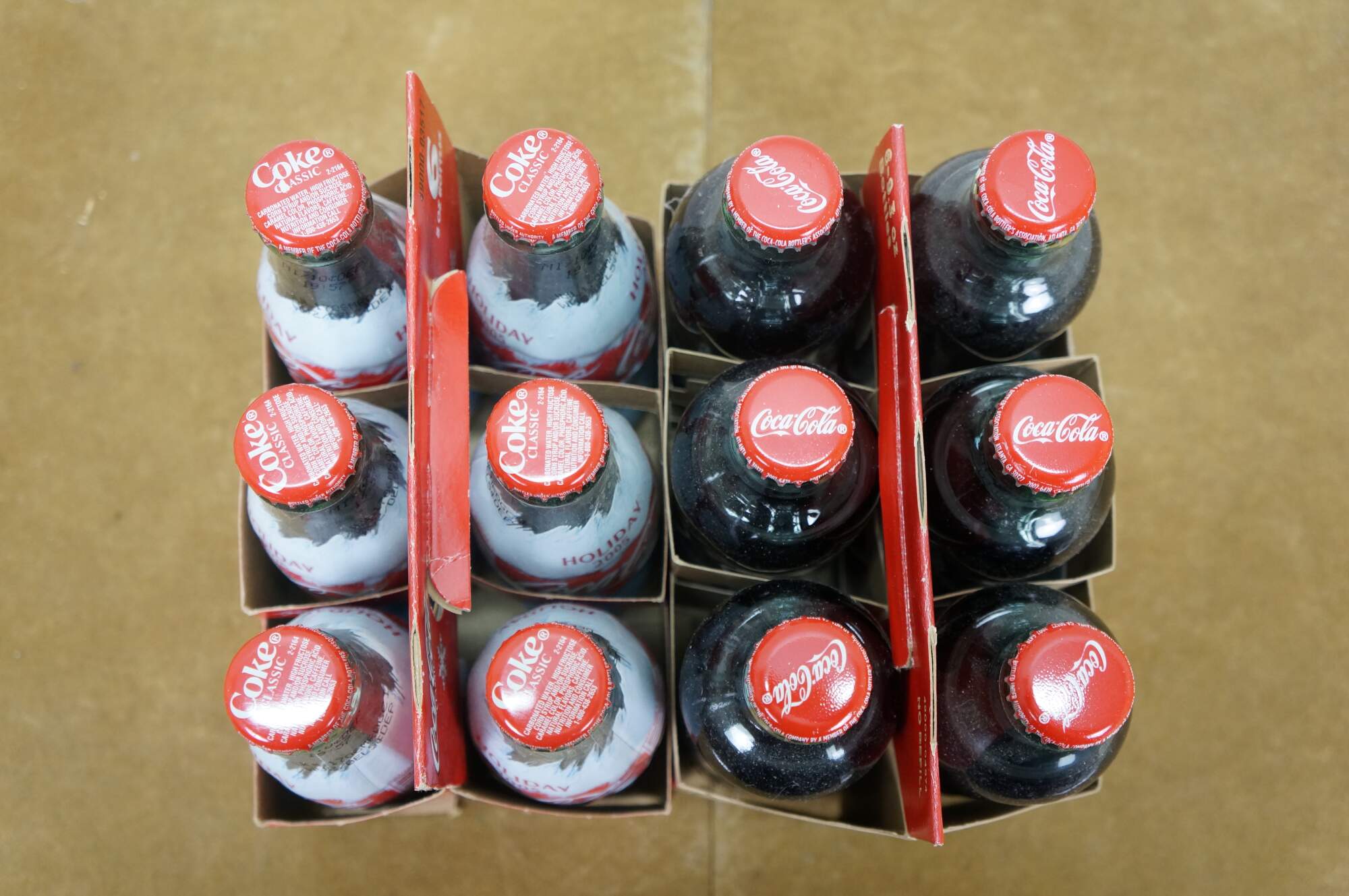Pair of holiday Coca-Cola glass bottle six packs of sealed bottles in original cardboard carriers - one Holiday 2005 Coca-Cola Classic and one Limited Edition Circa 1899 Bottle Refreshing Holiday Coca-Cola.
