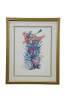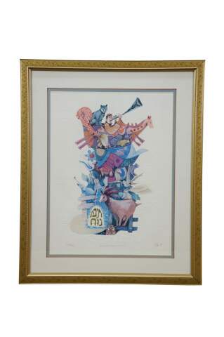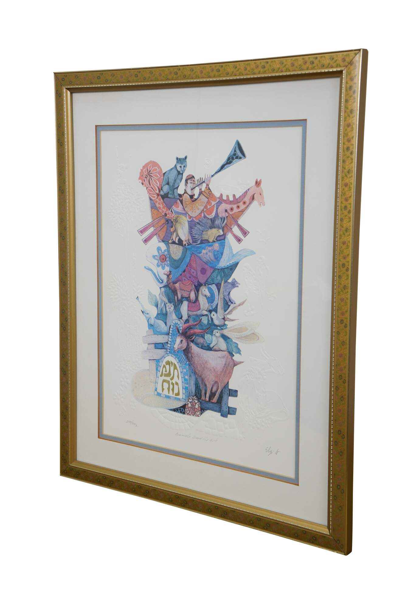 Vintage mixed media with copper plate titled "Animals Board the Ark" by Amram Ebgi. Depicts a colorful stack of of animals topped with Noah in the Ark, blowing a horn, framed with other embossed animals around the central image. Pencil signed, titled and numbered 359/950 II. Includes artist biography and Certificate of Authenticity from Renaissance Fine Arts, Authenticated by Cornell Gabos, 04/22/91. Gilt frame with printed daisy detail; no mat.