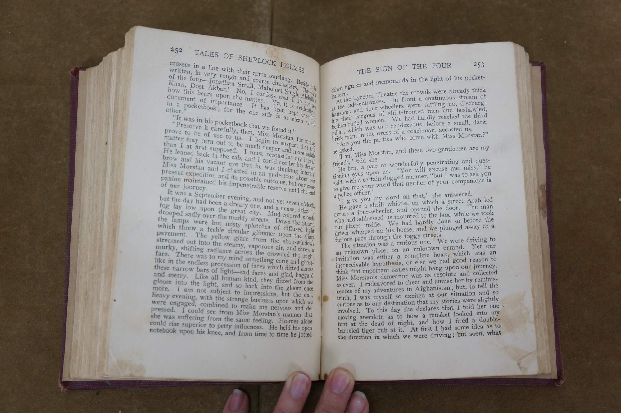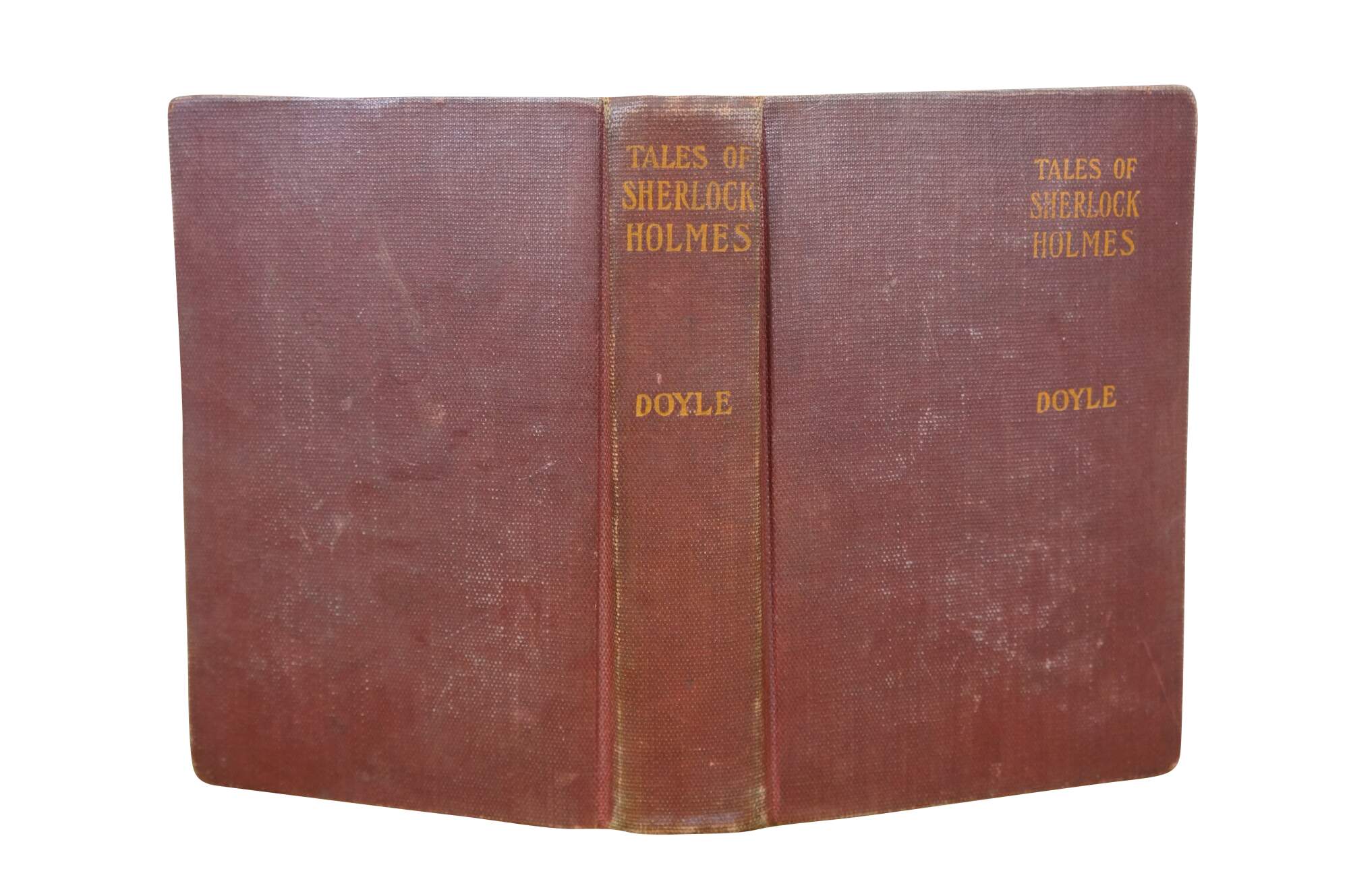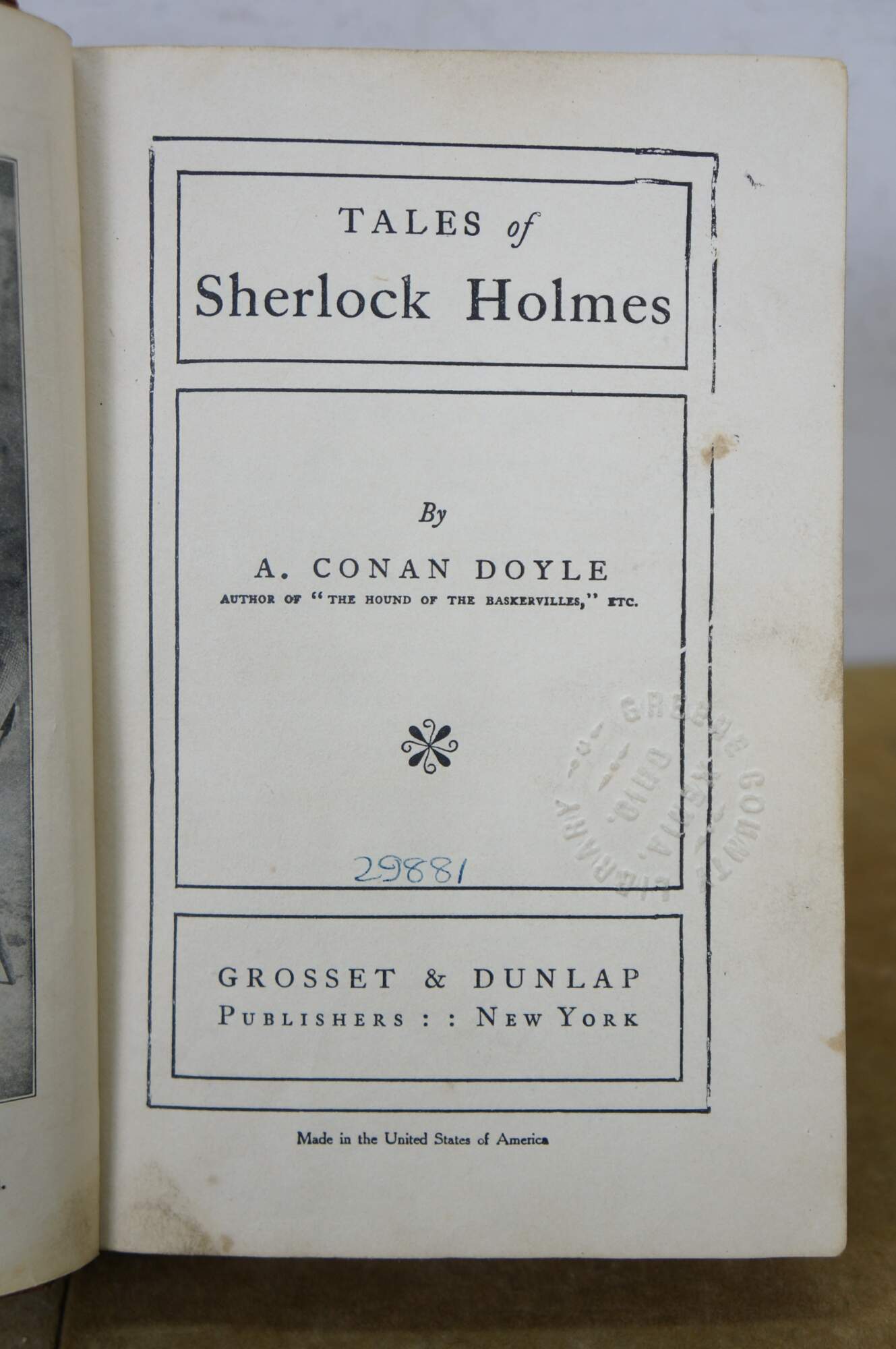 Antique early 20th century hard cover copy of "Tales of Sherlock Holmes" by Sir Arthur Conan Doyle - Published by Grosset & Dunlap - Made in the United States of America. Formerly in the collection of the Greene County District Library, due date slip shows check outs from the1920s-1930s. Hard back / hard cover, red cloth binding with stamped details. No jacket.