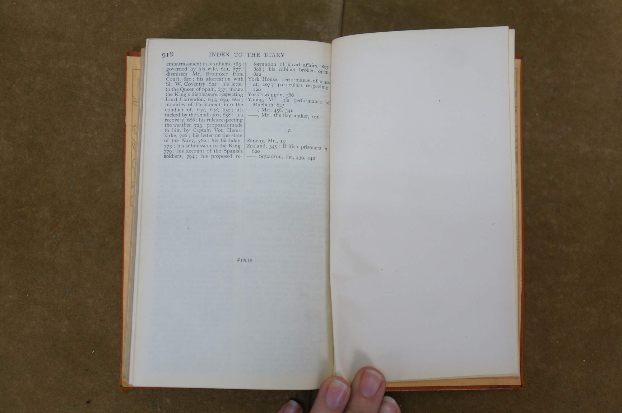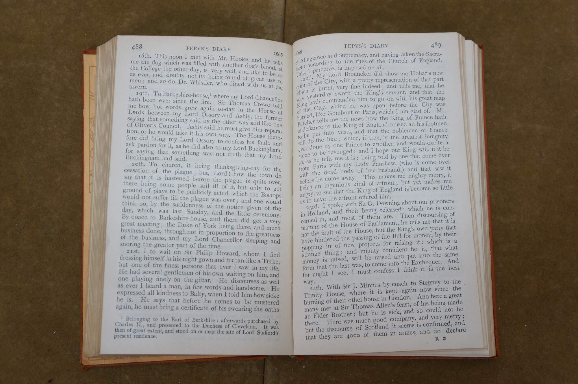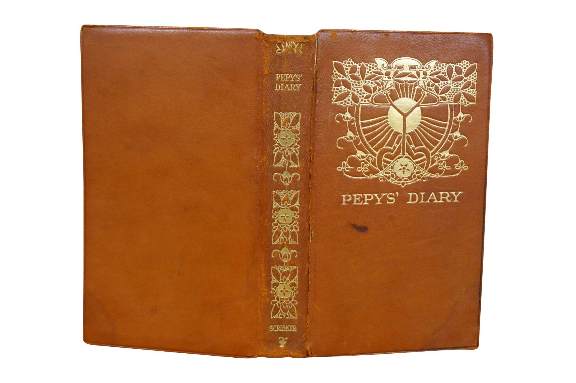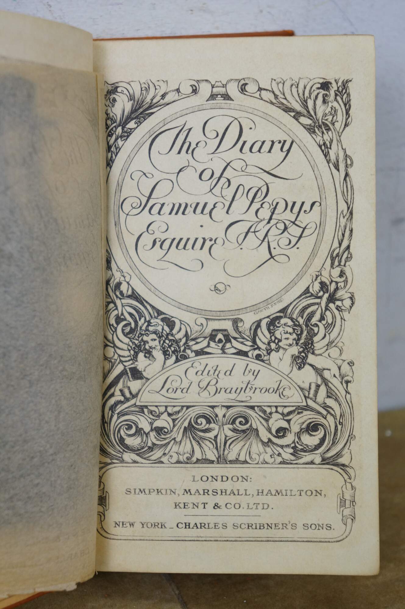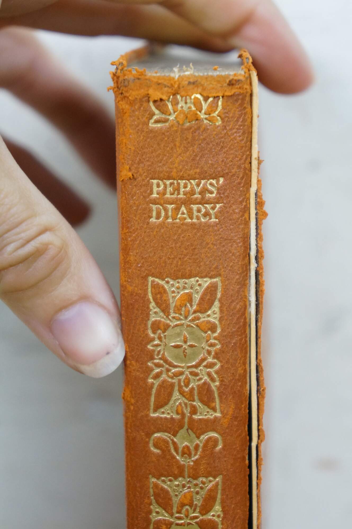Antique early 20th century soft cover copy of "The Diary of Samuel Pepys Esquire, F.R.S." - Edited by Lord Braybrook - Published by Simpkin, Marshall, Hamilton, Kent & Co Ltd / Charles Scribner's Sons - Title page design by Garth Jones - Printed in Great Britain by The Botolph Printing Works - Soft cover, orange leather binding with stamped gilt details. No jacket.
