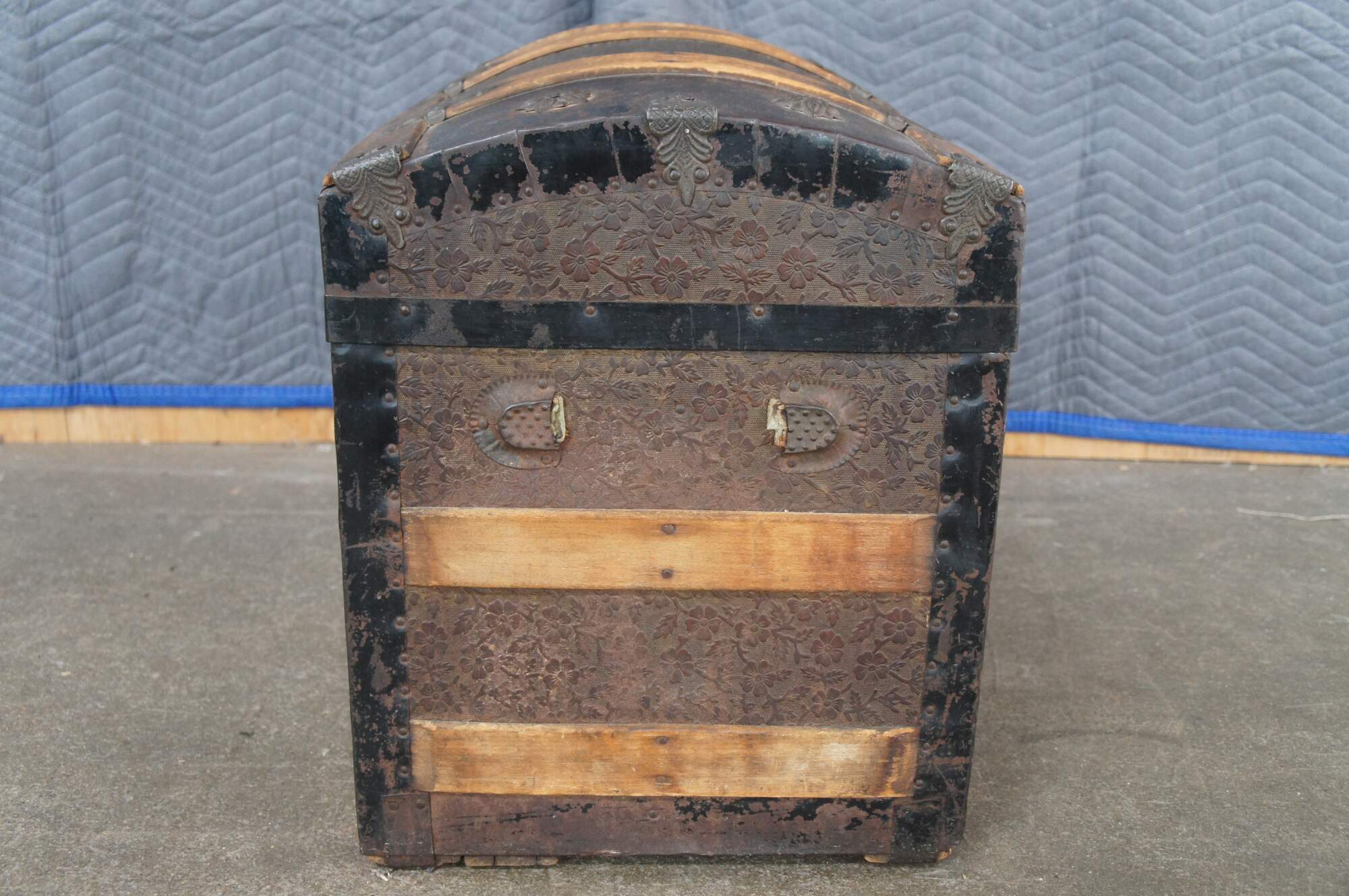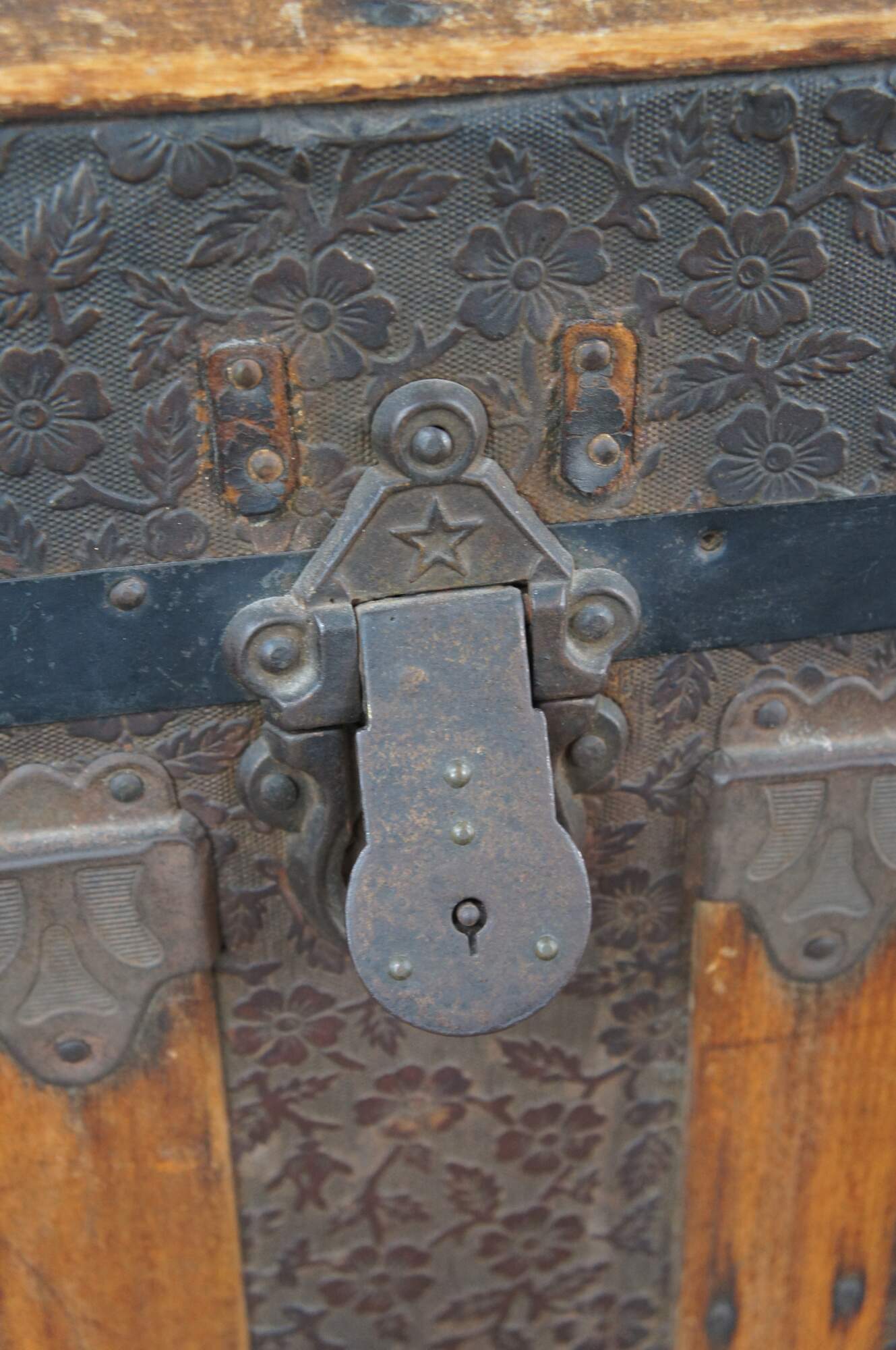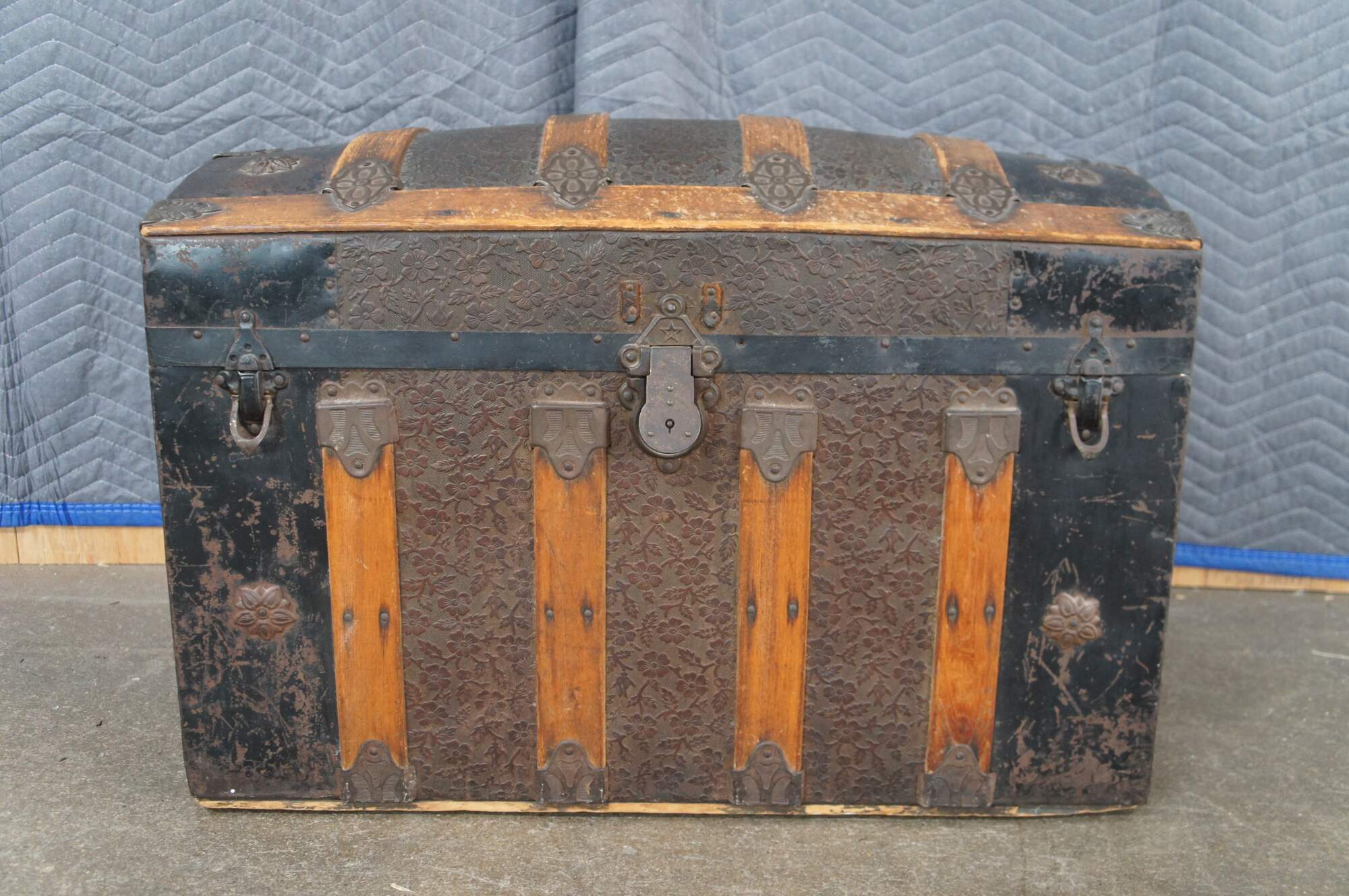 A charming antique 19th century steamer trunk. Made from oak with metal paneling and banding. The center of the trunk has a floral embossed fabric. Interior is lined with pine.