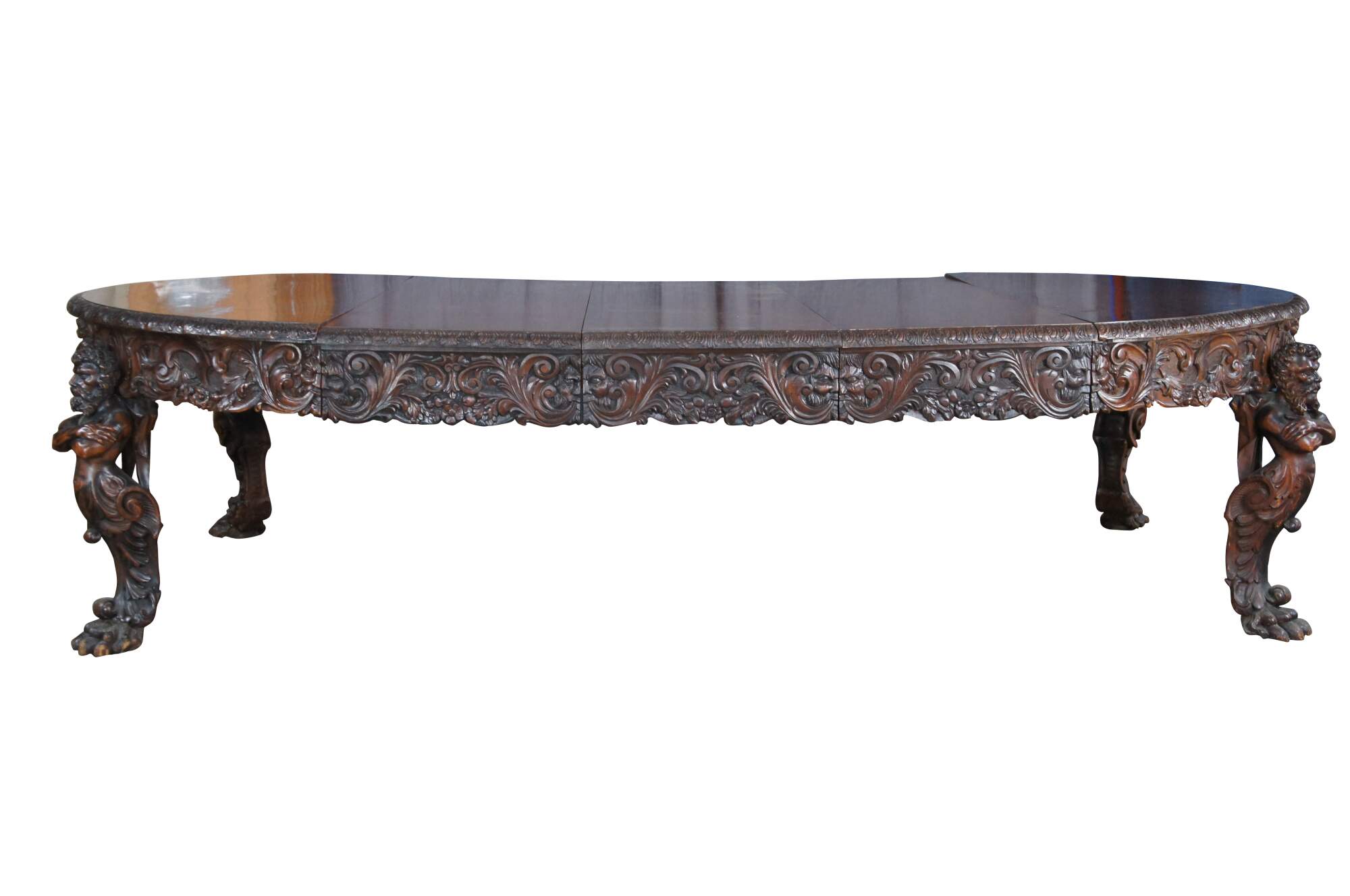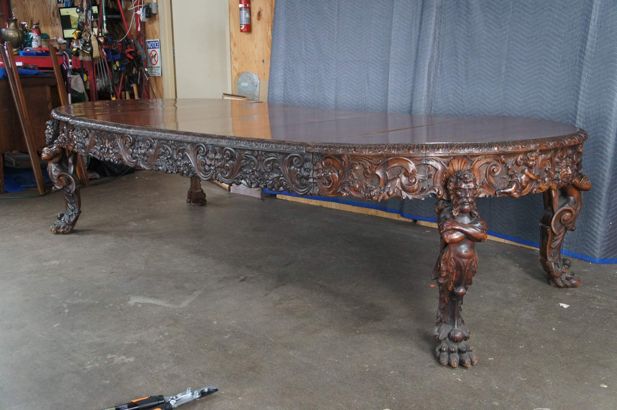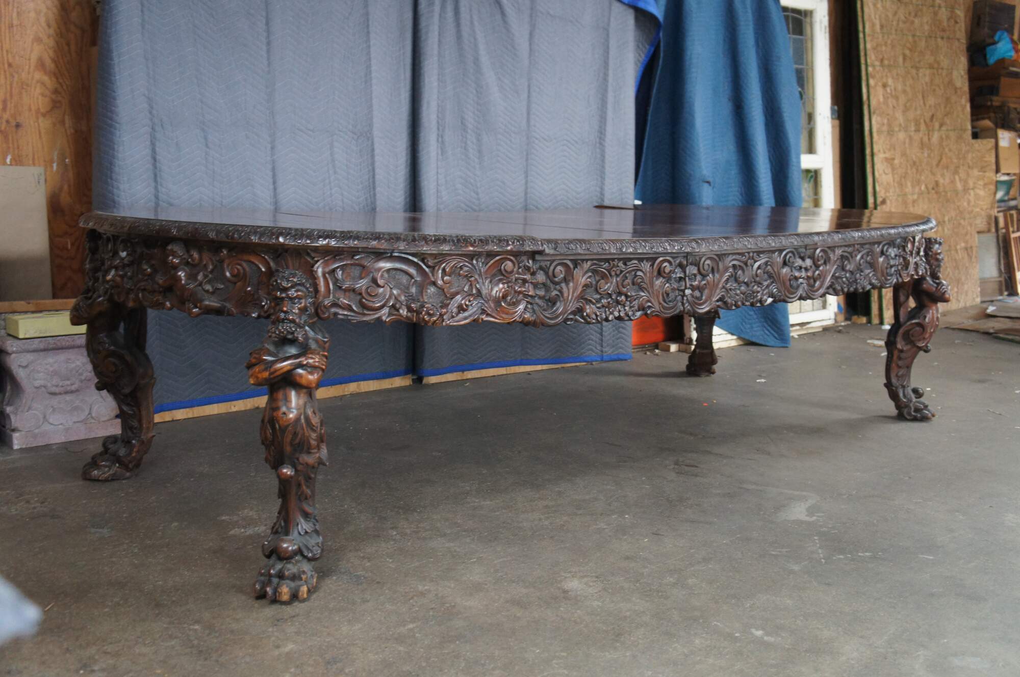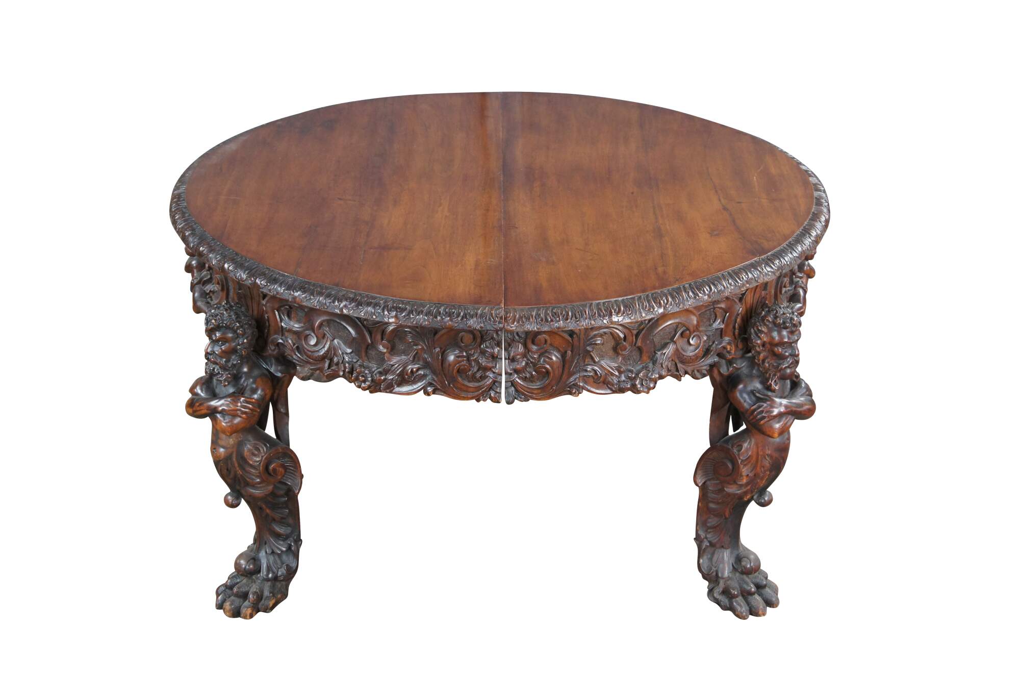 Exceedingly Rare Italian Renaissance Revival figural mahogany dining table, circa 1850-1870s. The table can be used in its smaller rounded form at 59" or extended to 125" for formal dining use. The table showcases an acanthus carved edge over a hand carved low relief apron with scrolling foliate, grotesque northwind faces flanked by cherubs, scalloping and acanthus relief. The table is supported by four robust fully carved Atlas figures with crossed arms over leafy scrolled lower body leading to large claw feet. Includes three leaves for extension. The table retains the original buzzer button that would have been used by the head of the house to signal to the butlers for service. This one of a kind piece will make the perfect statement for any grand dining room or great room.
