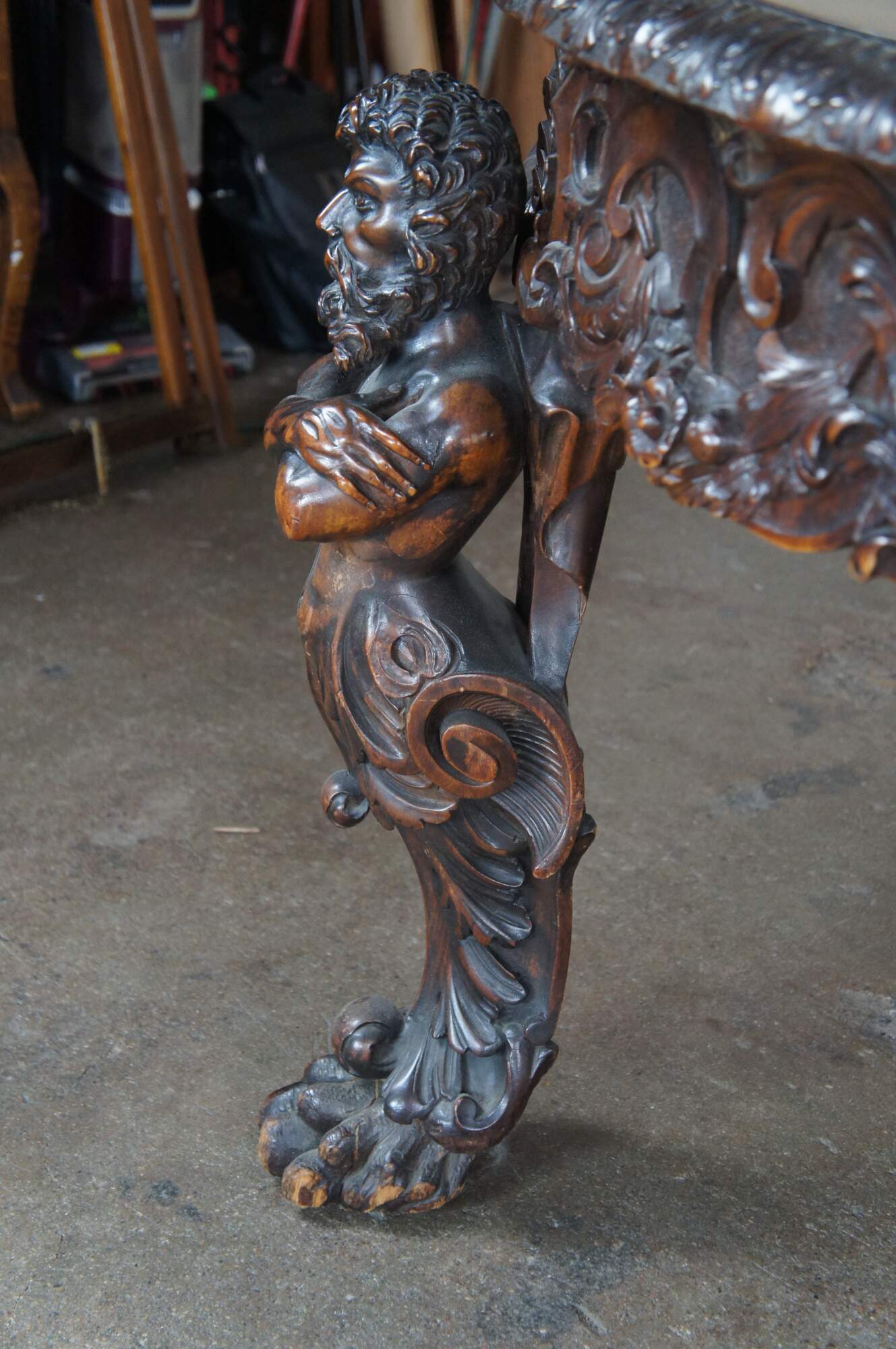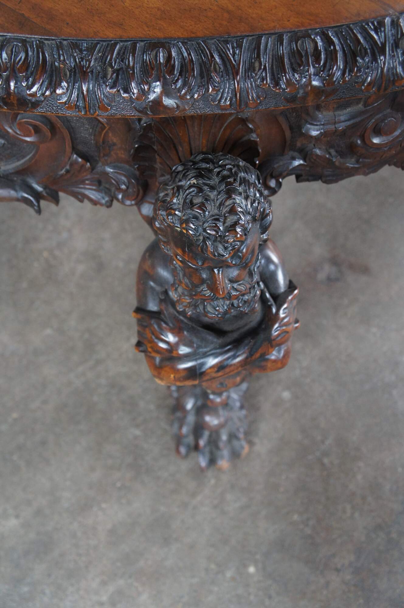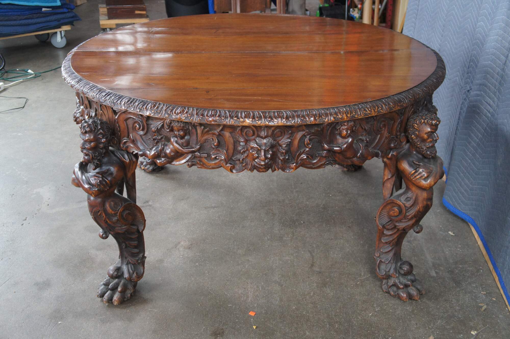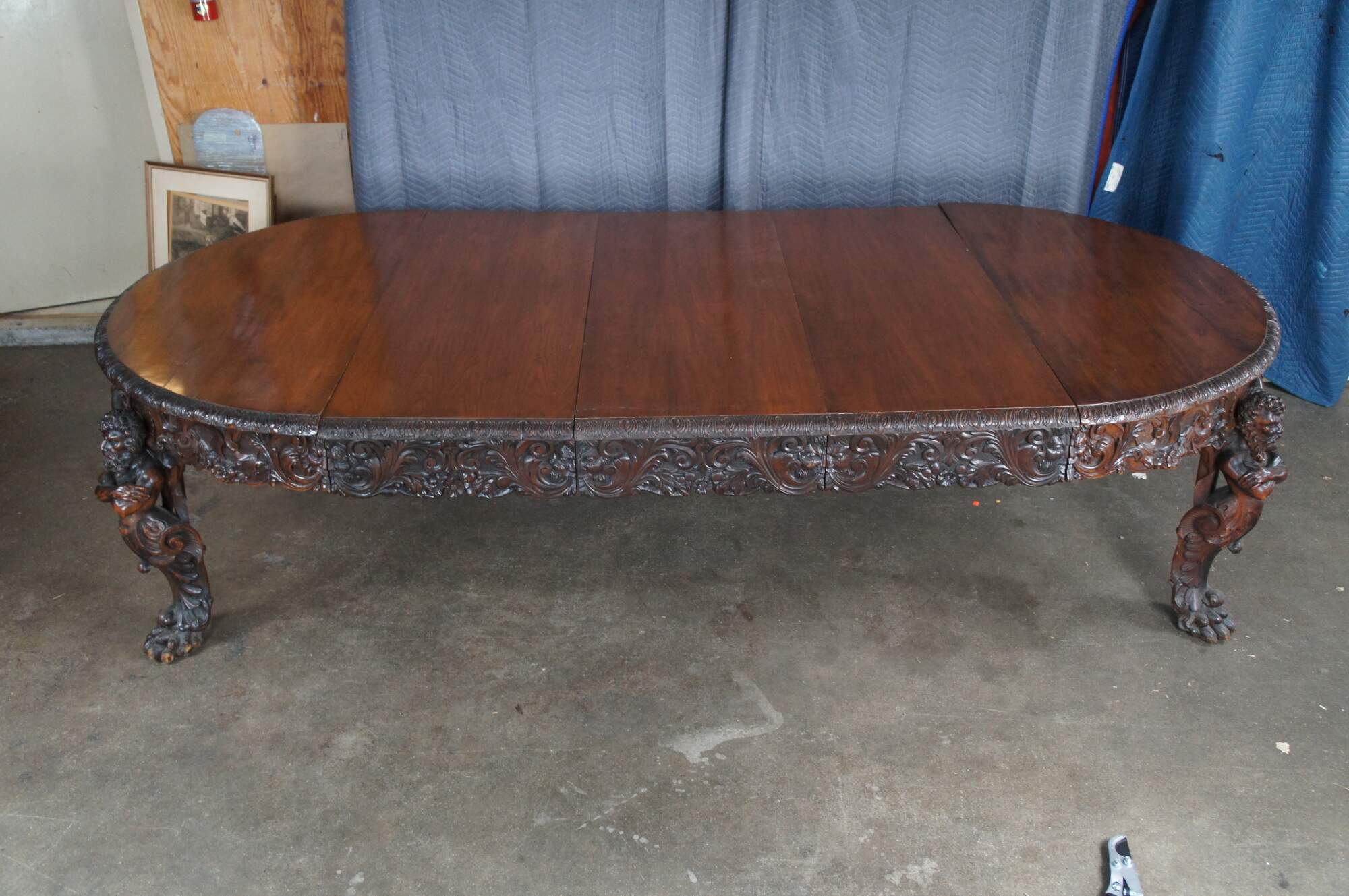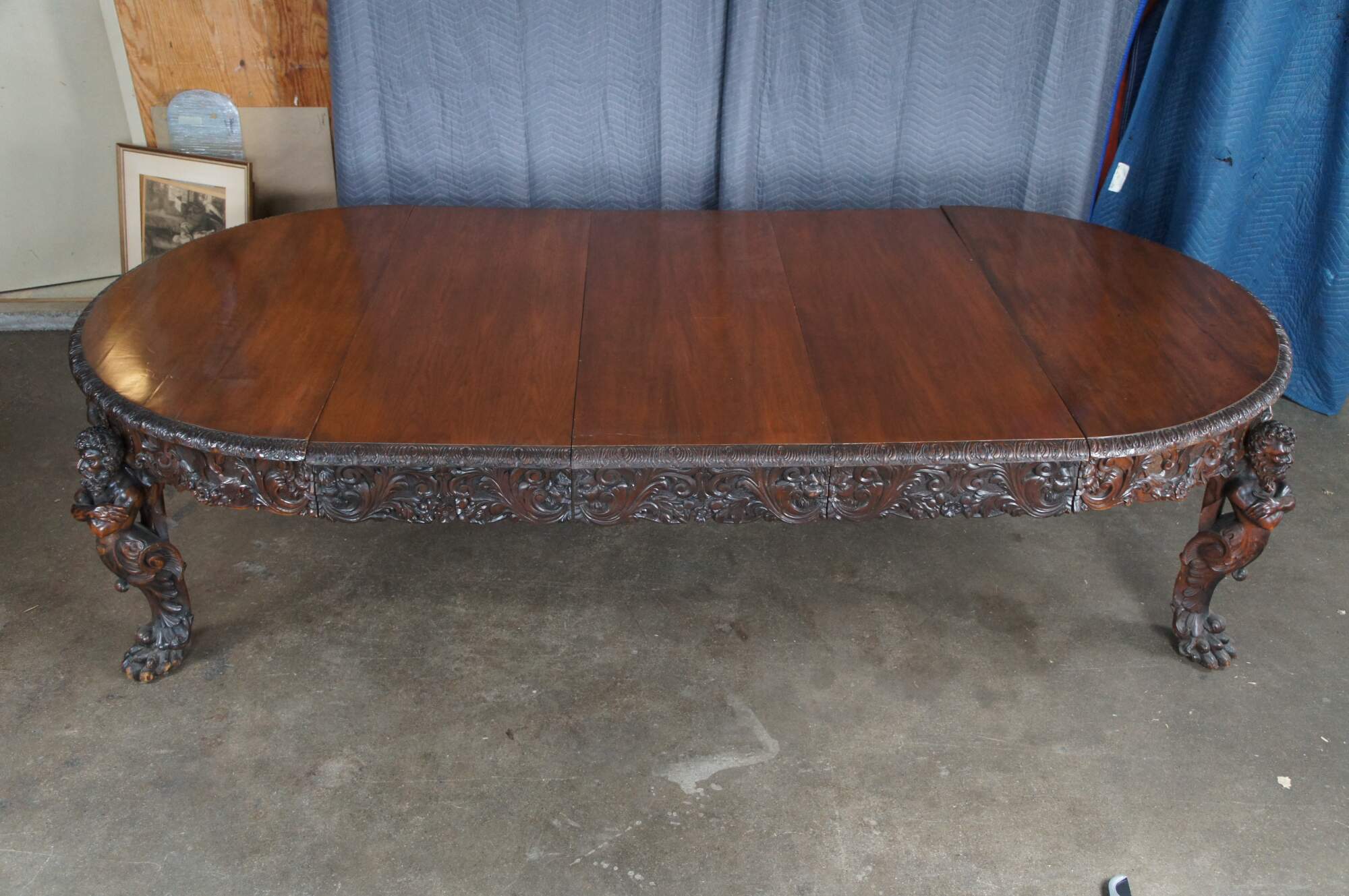 Exceedingly Rare Italian Renaissance Revival figural mahogany dining table, circa 1850-1870s. The table can be used in its smaller rounded form at 59" or extended to 125" for formal dining use. The table showcases an acanthus carved edge over a hand carved low relief apron with scrolling foliate, grotesque northwind faces flanked by cherubs, scalloping and acanthus relief. The table is supported by four robust fully carved Atlas figures with crossed arms over leafy scrolled lower body leading to large claw feet. Includes three leaves for extension. The table retains the original buzzer button that would have been used by the head of the house to signal to the butlers for service. This one of a kind piece will make the perfect statement for any grand dining room or great room.