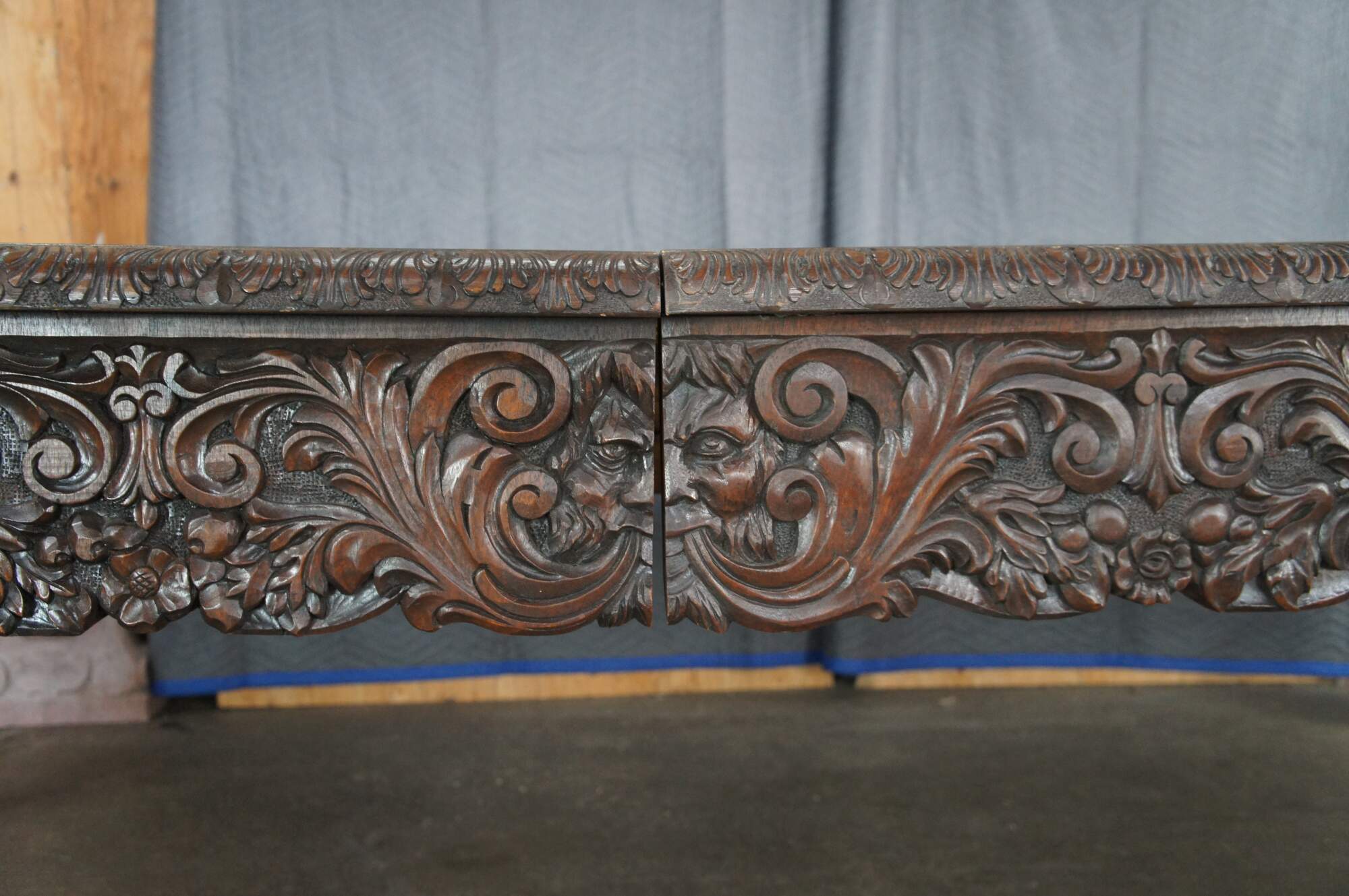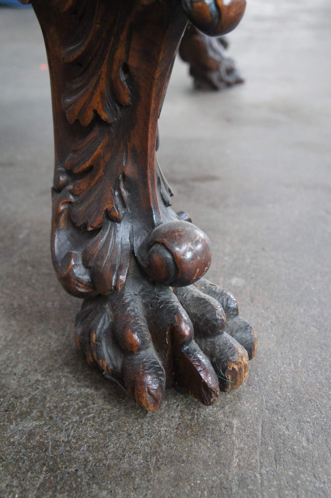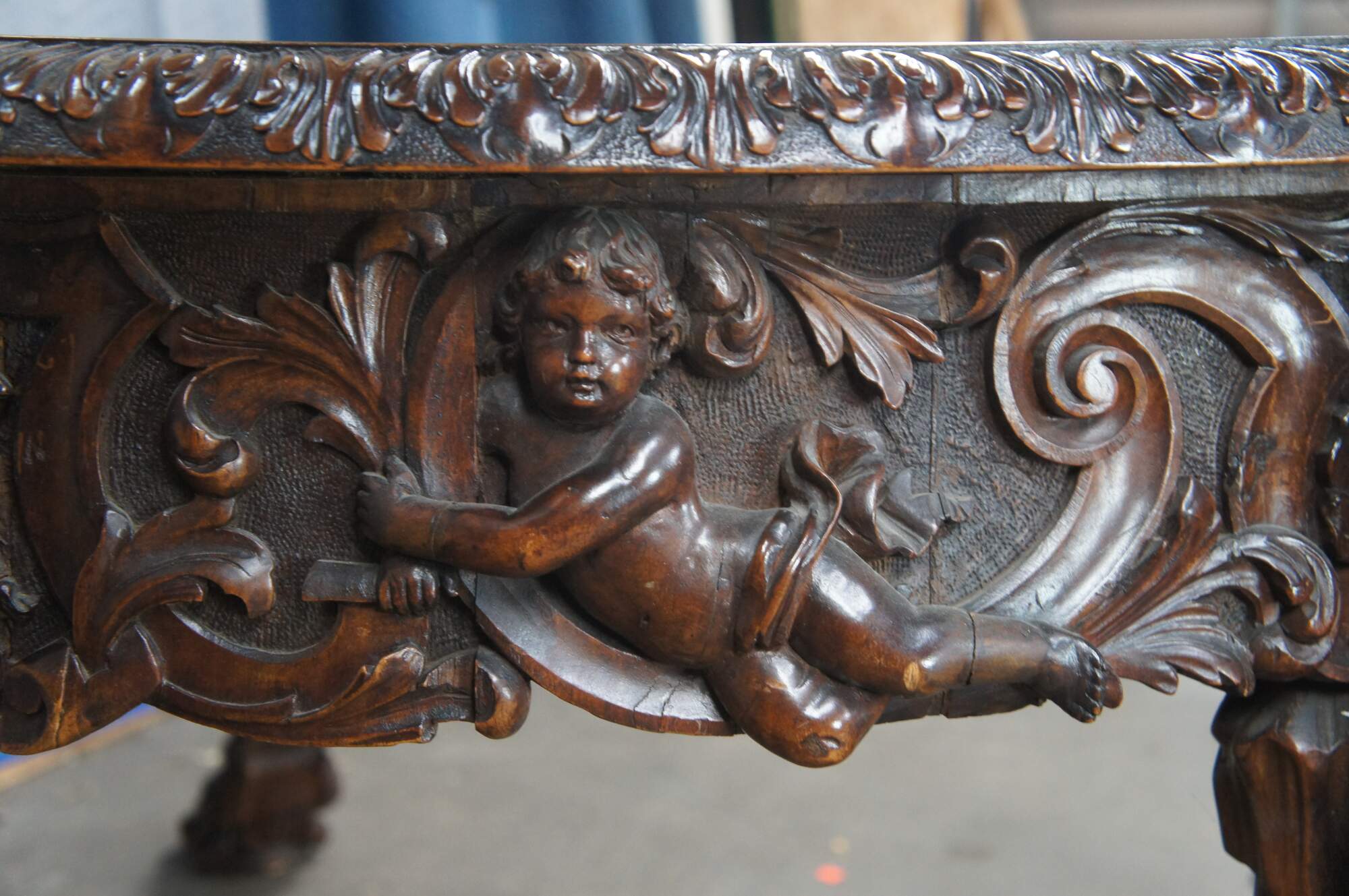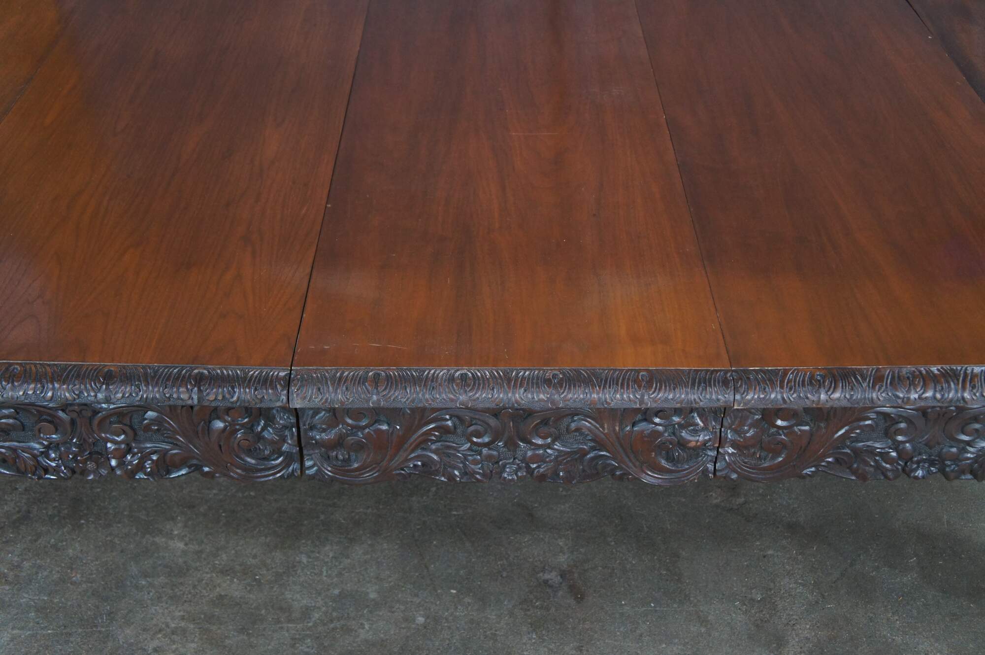 Exceedingly Rare Italian Renaissance Revival figural mahogany dining table, circa 1850-1870s. The table can be used in its smaller rounded form at 59" or extended to 125" for formal dining use. The table showcases an acanthus carved edge over a hand carved low relief apron with scrolling foliate, grotesque northwind faces flanked by cherubs, scalloping and acanthus relief. The table is supported by four robust fully carved Atlas figures with crossed arms over leafy scrolled lower body leading to large claw feet. Includes three leaves for extension. The table retains the original buzzer button that would have been used by the head of the house to signal to the butlers for service. This one of a kind piece will make the perfect statement for any grand dining room or great room.