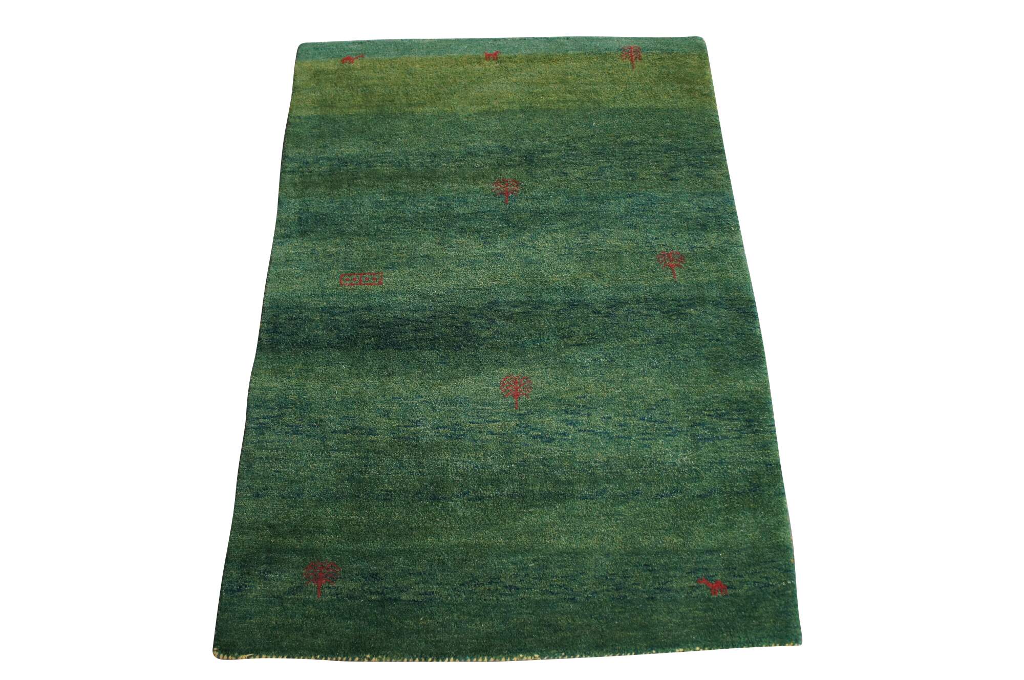 Hand Knotted Indian Gabbeh Wool Area Rug. Features a Modern design with green pile accented with red trees and figures.