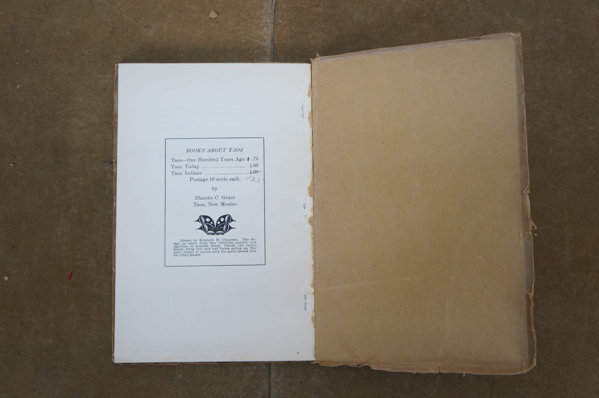 Antique Paper back copy of "Taos Indians" by Blance C. Grant - Printed in Taos, New Mexico 1925 - Copyright Blanche C. Grant 1925 - First Edition - Published by the Santa Fe New Mexican Publishing Corporation. Soft cover, brown paper binding.