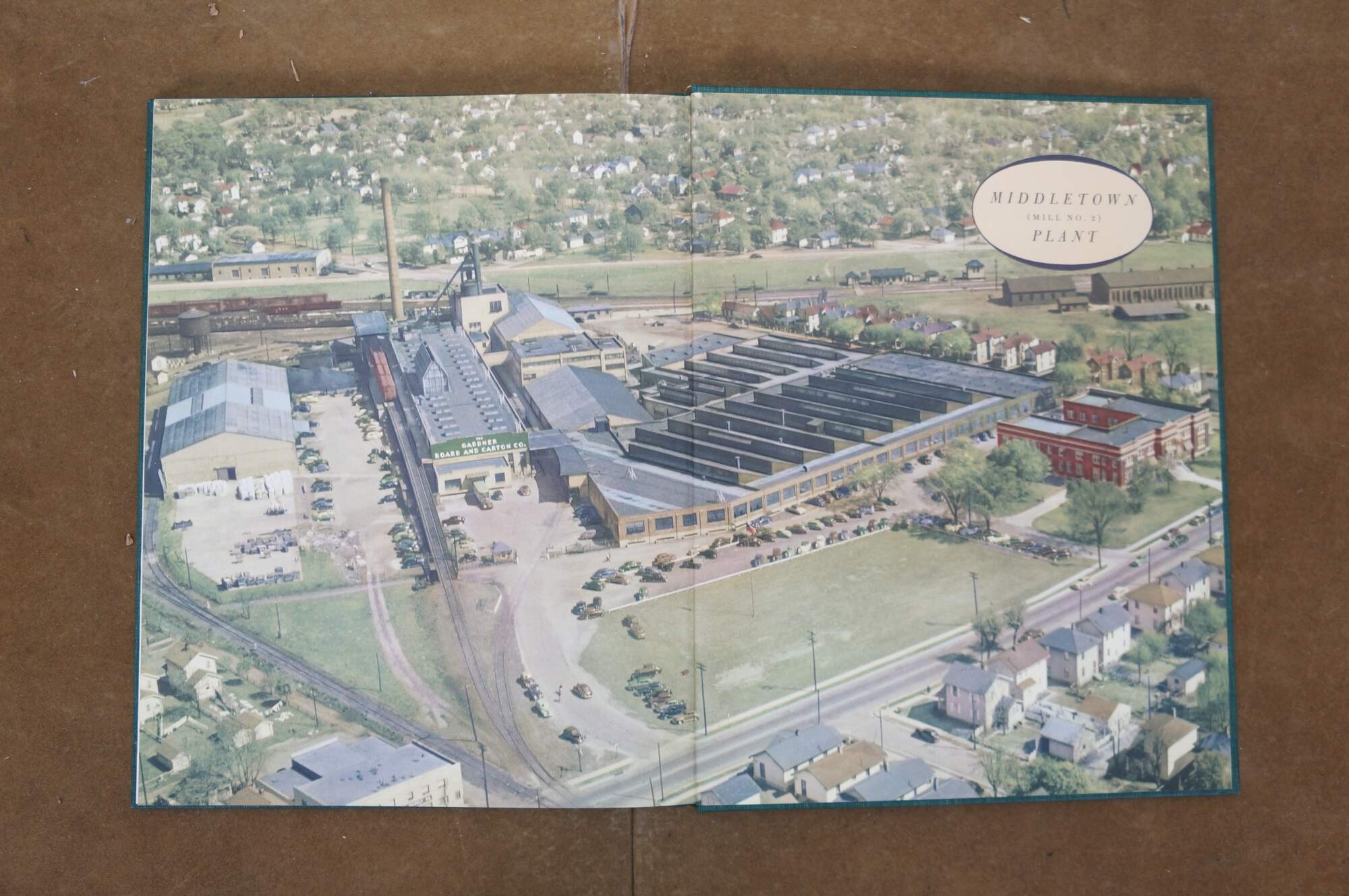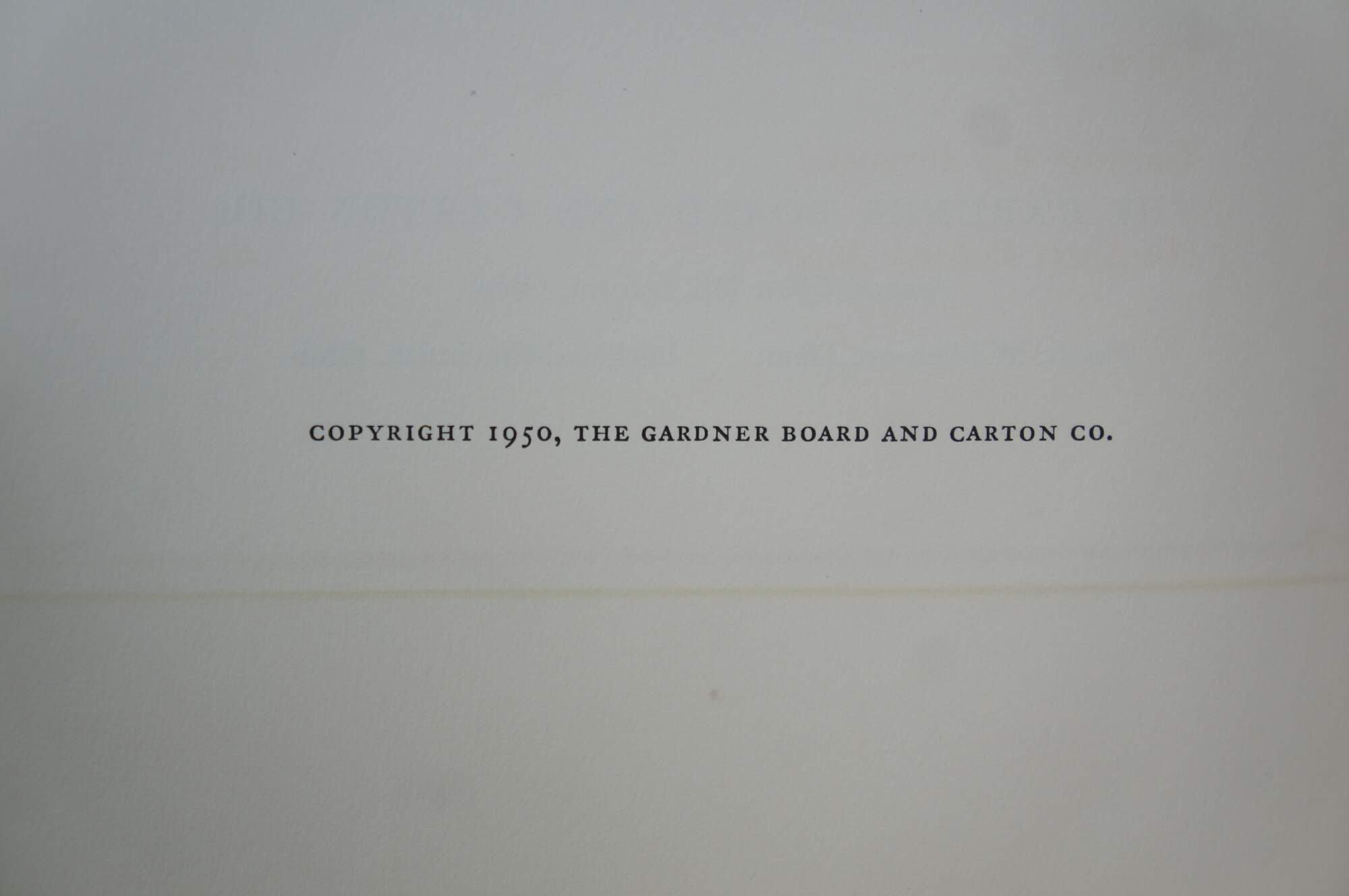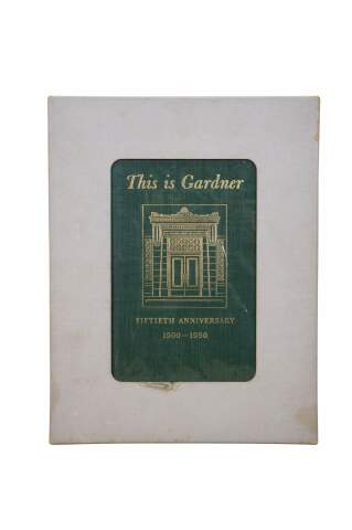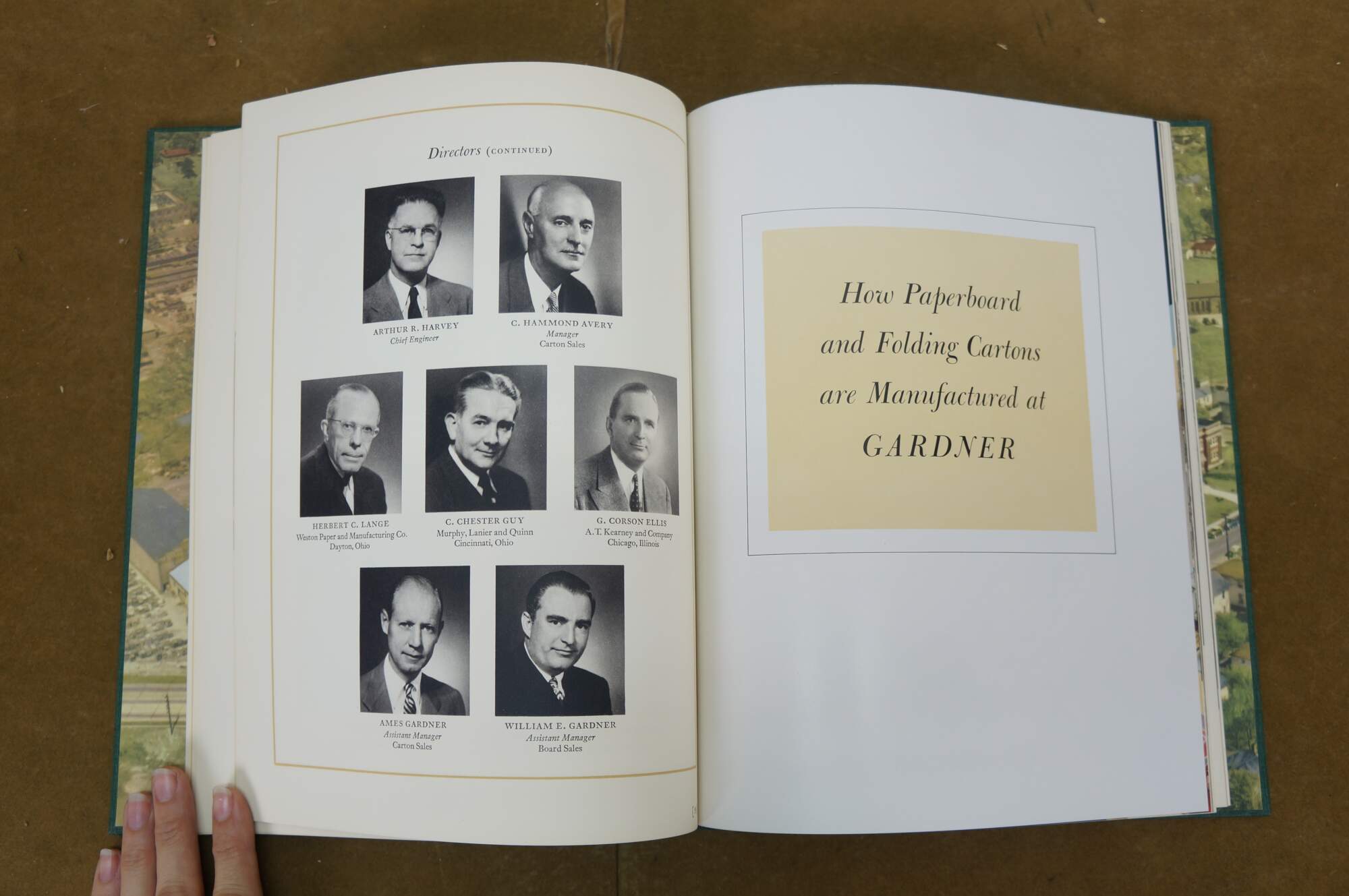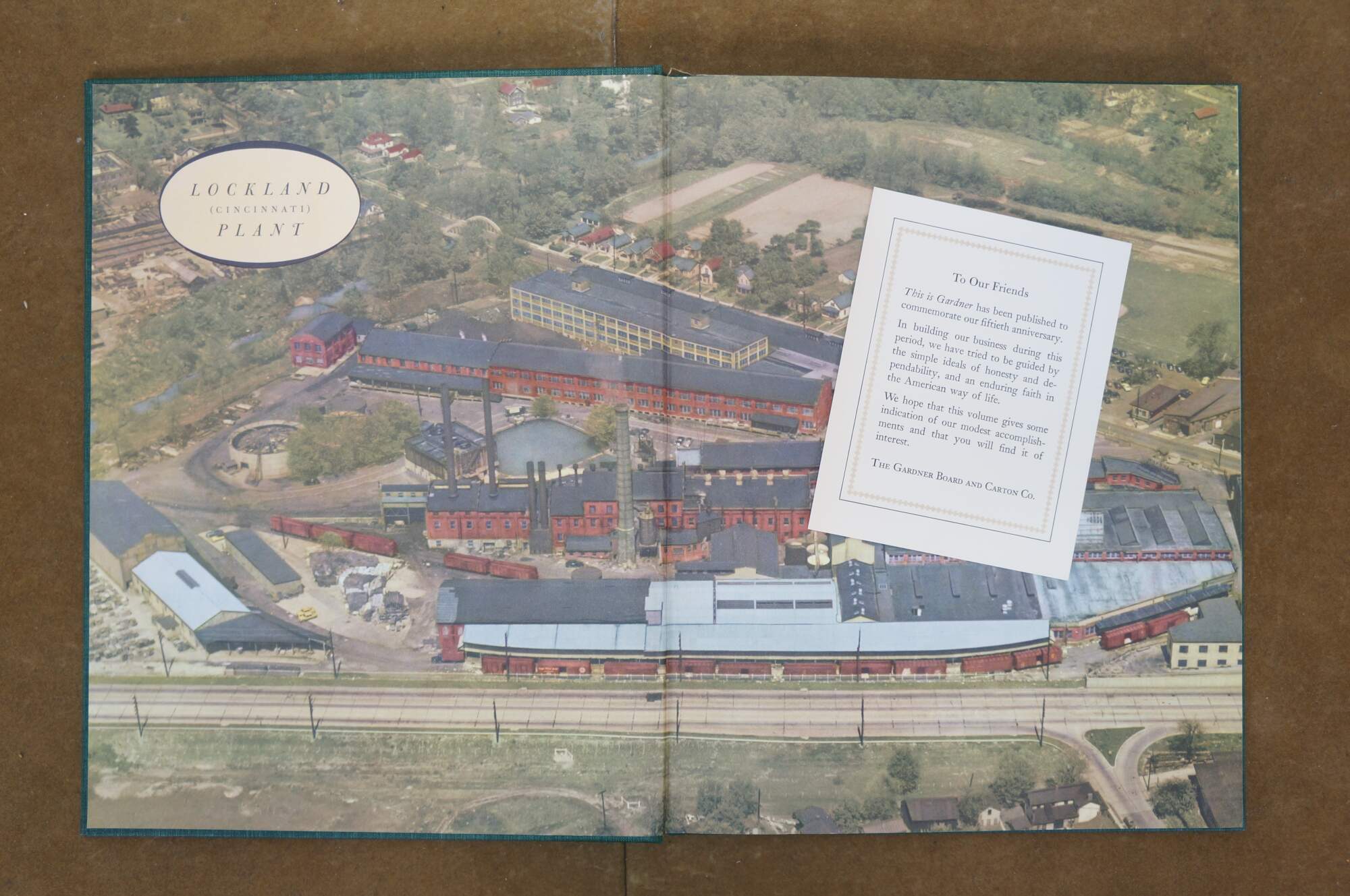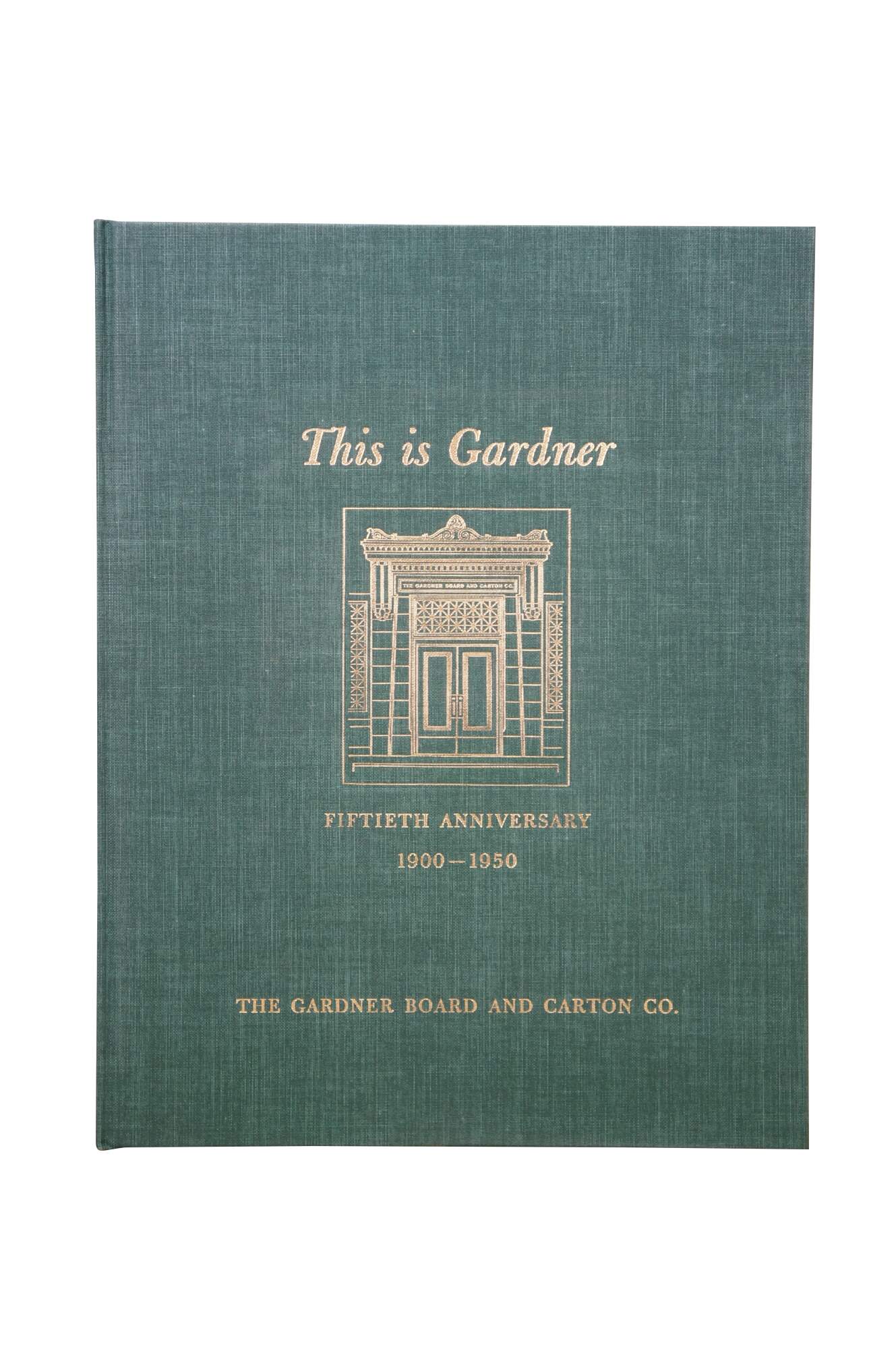 Vintage hard cover commemorative book, "This Is Gardner: Fiftieth Anniversary 1900-1950" - Copyright 1950, The Gardner Board and Carton Company, Middletown, Ohio / Lockland-Cincinnati, Ohio. Hard back / hard cover, green cloth binding with stamped gilt details. Cardboard cover.