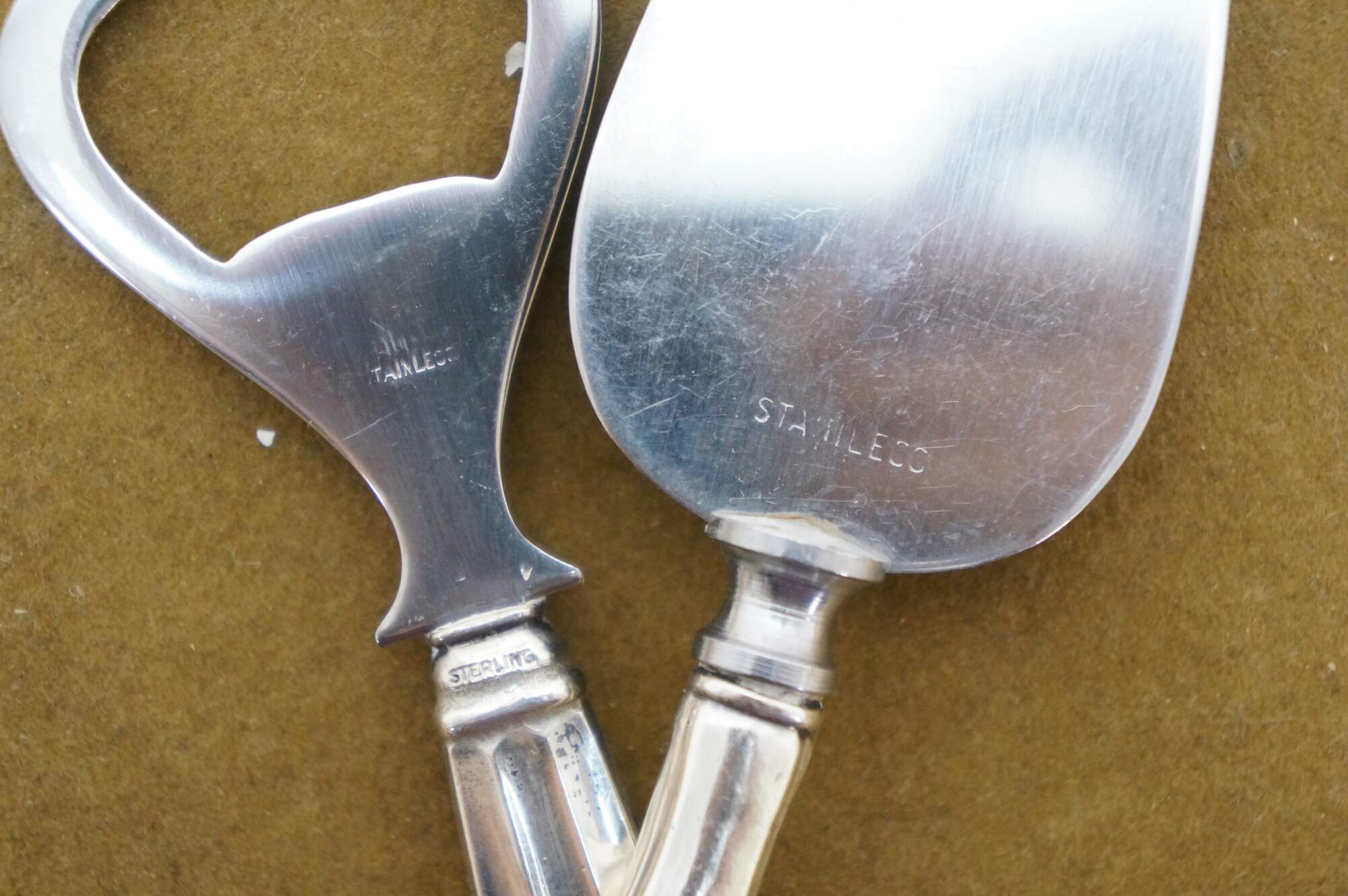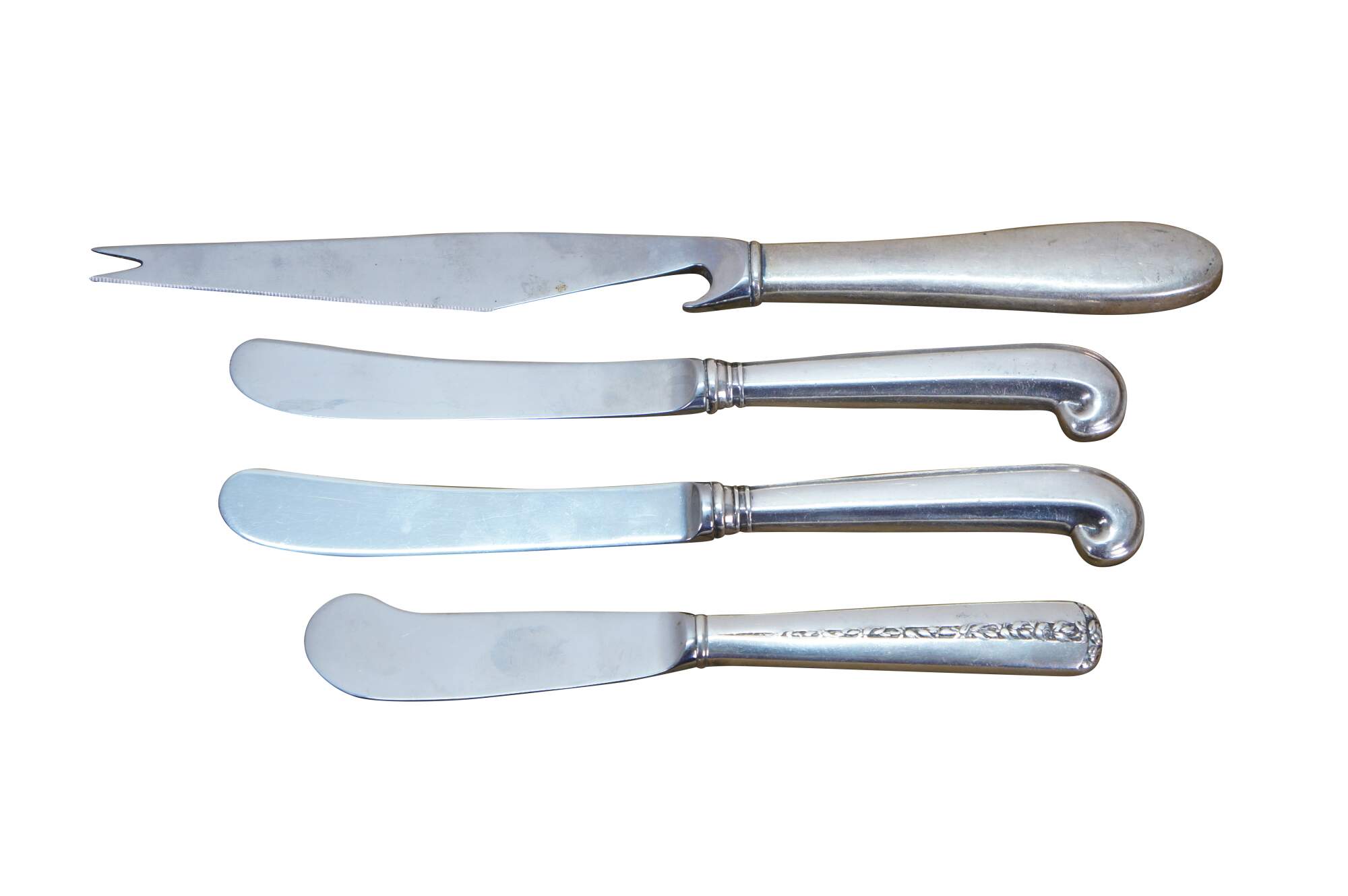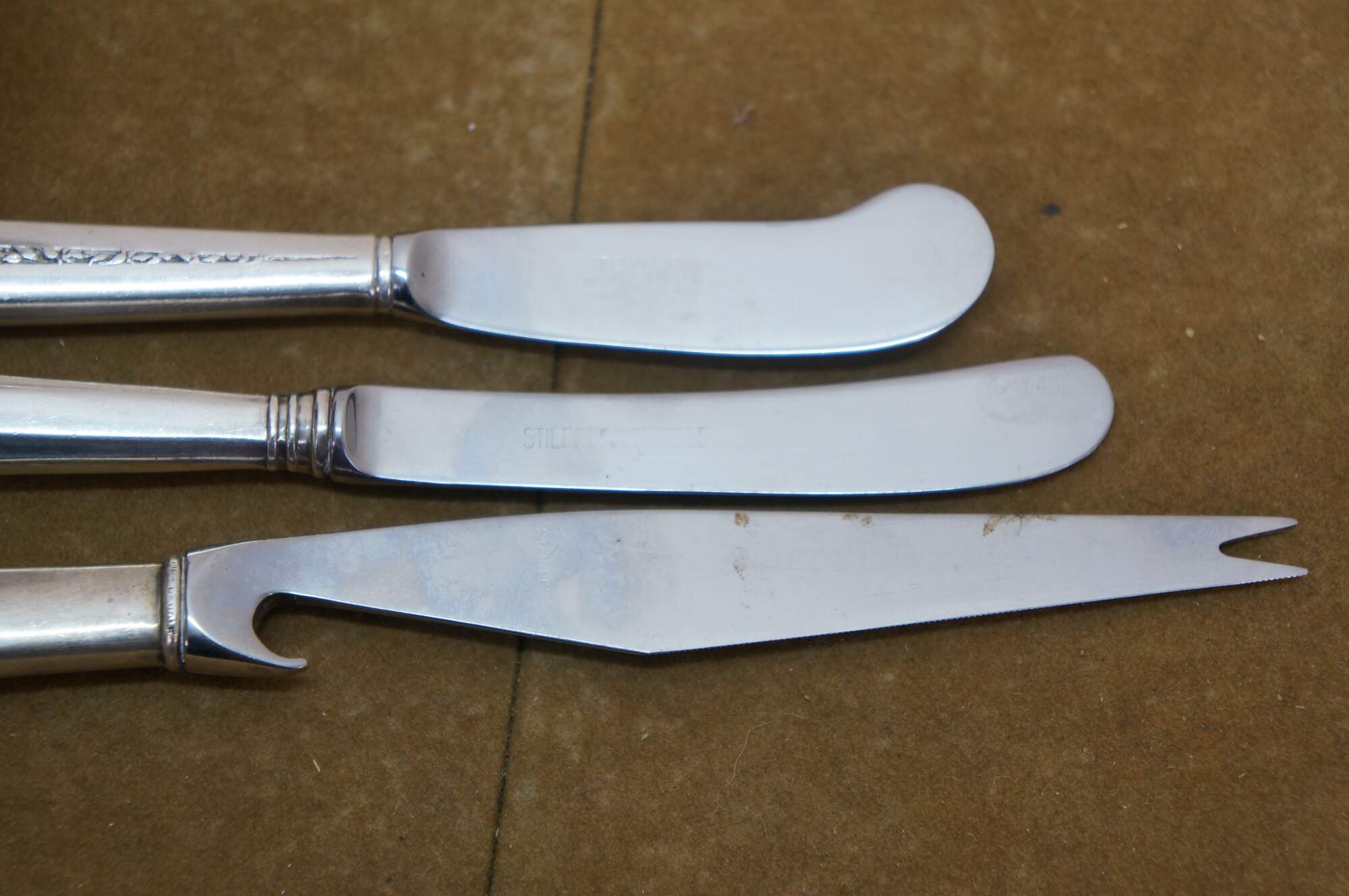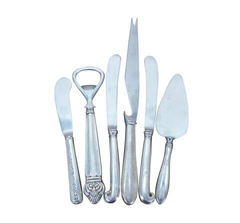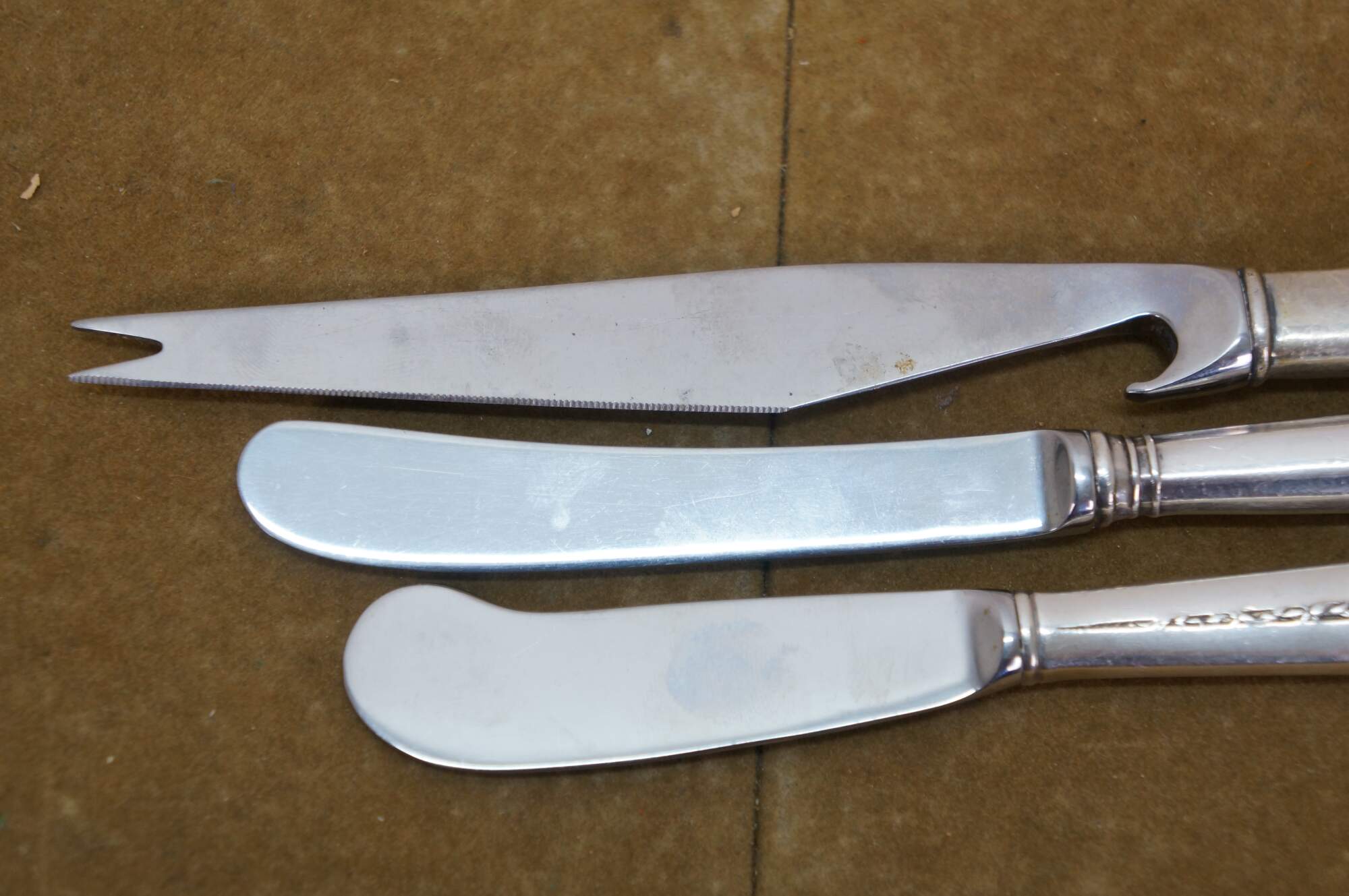 Antique / vintage 20th century lot of 6 assorted utensils with stainless steel blades and sterling silver handles. Includes three butter knives / spreaders, one cheese knife, one fish knife, and one bottle opener. Brands include Towle, Steiff, and Colonial Williamsburg.