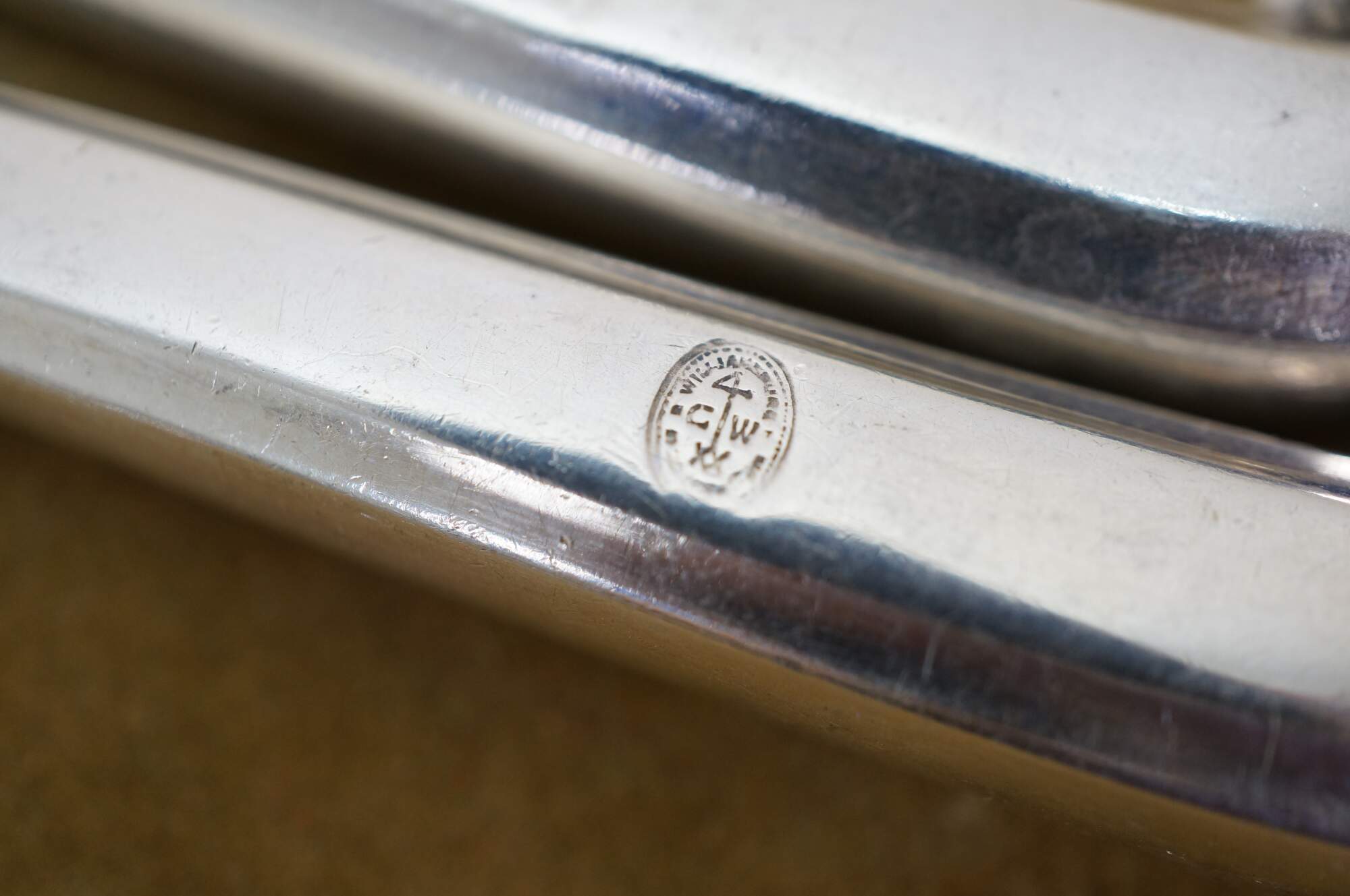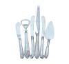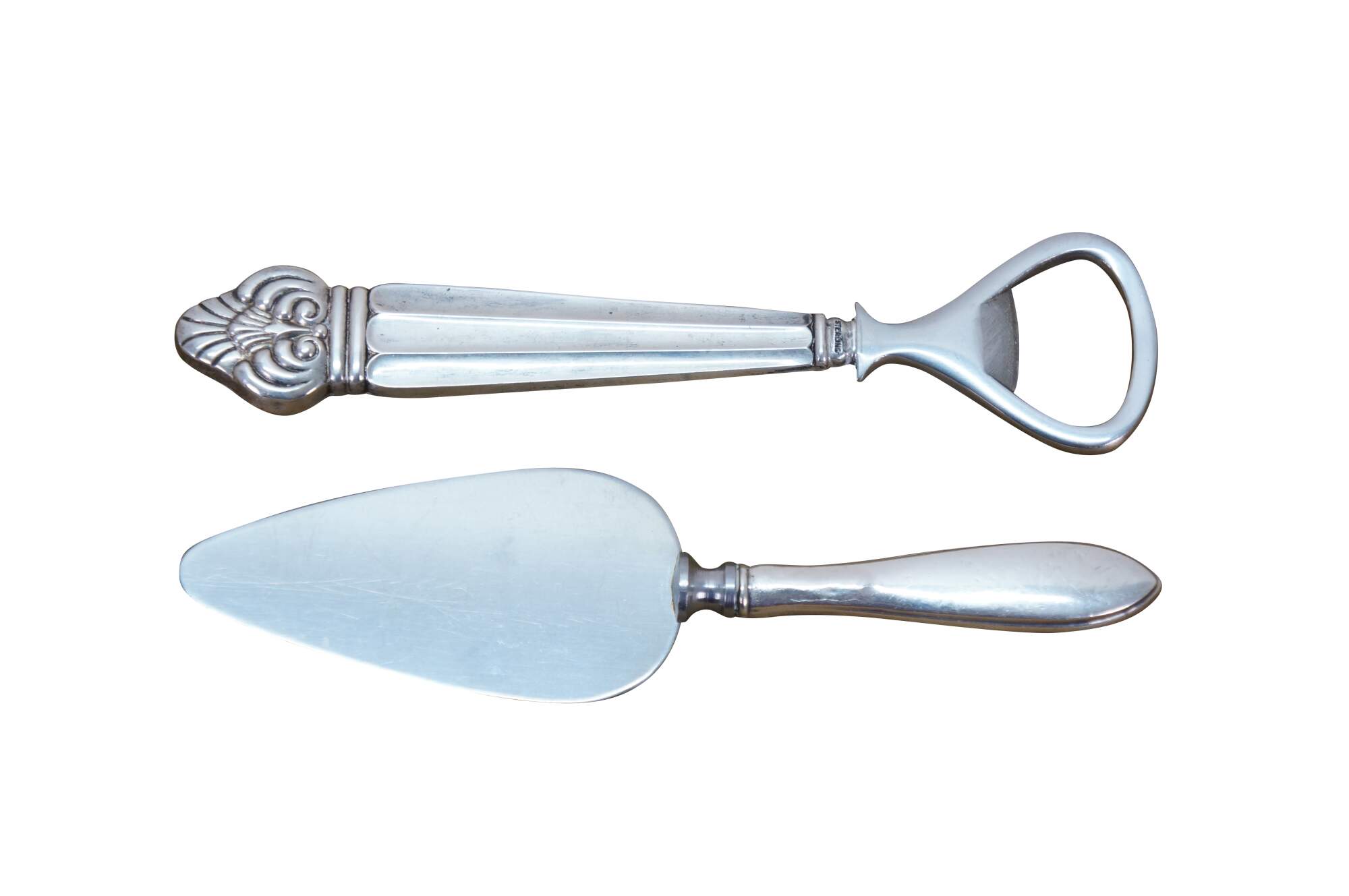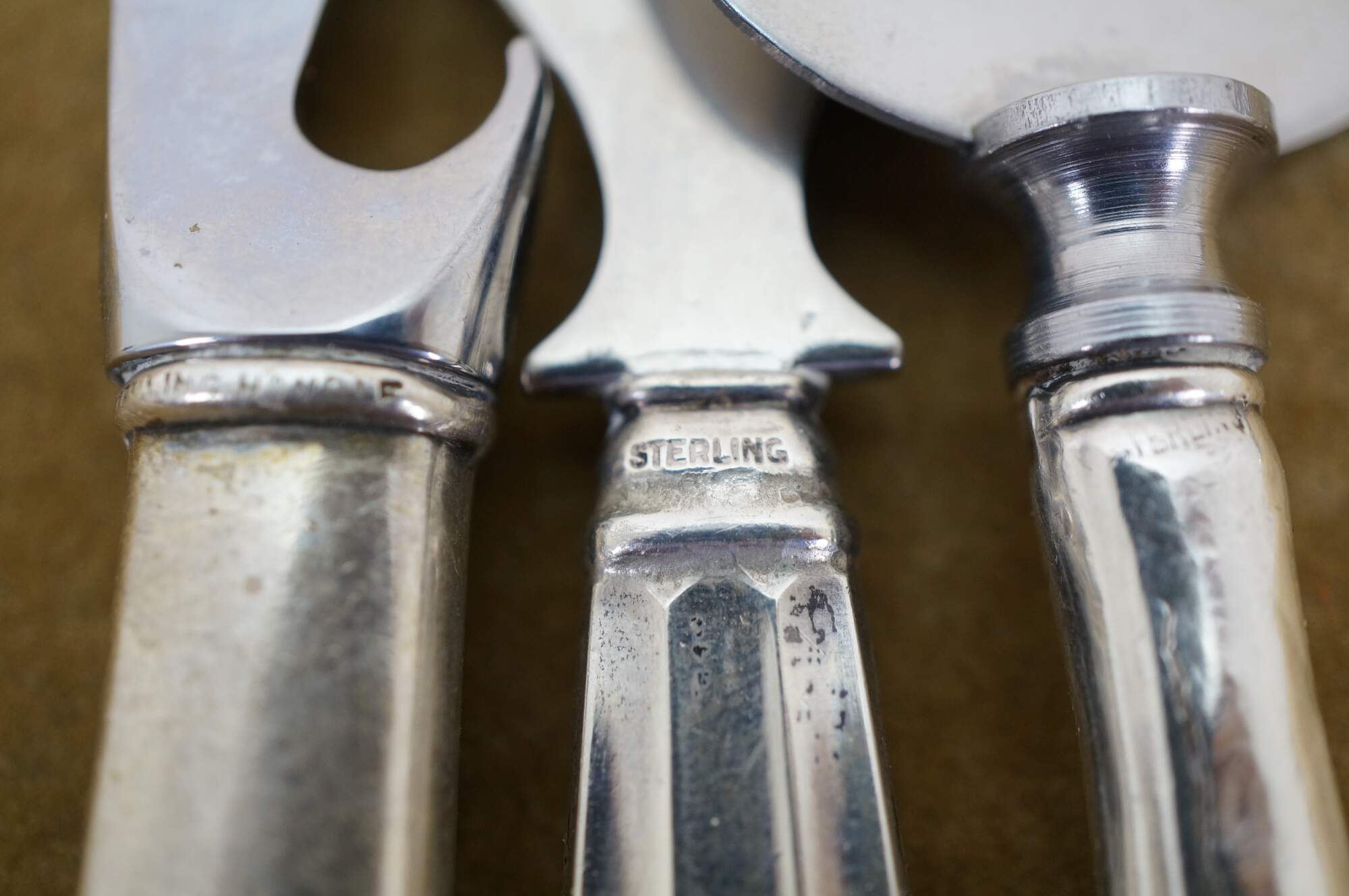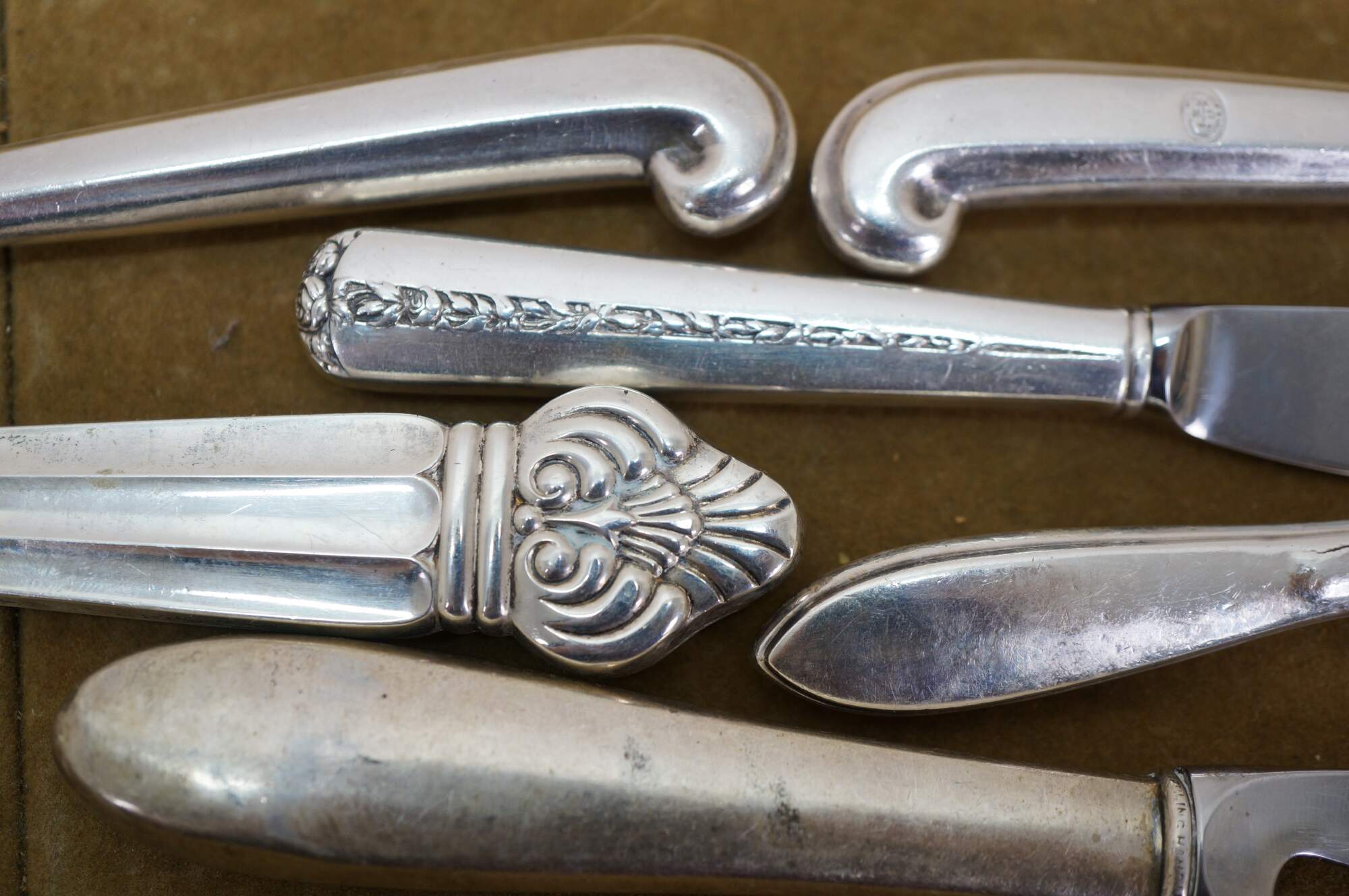 Antique / vintage 20th century lot of 6 assorted utensils with stainless steel blades and sterling silver handles. Includes three butter knives / spreaders, one cheese knife, one fish knife, and one bottle opener. Brands include Towle, Steiff, and Colonial Williamsburg.