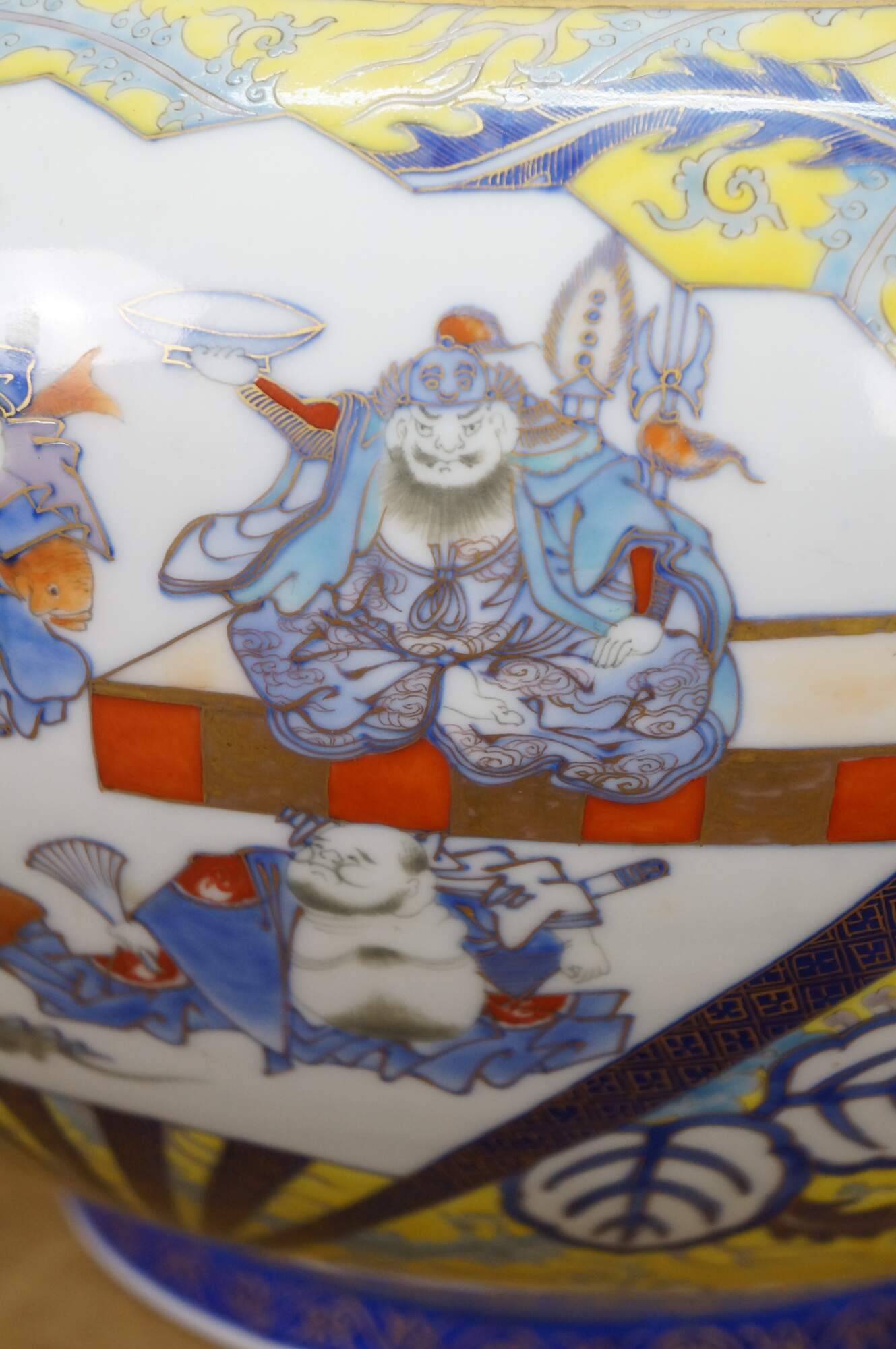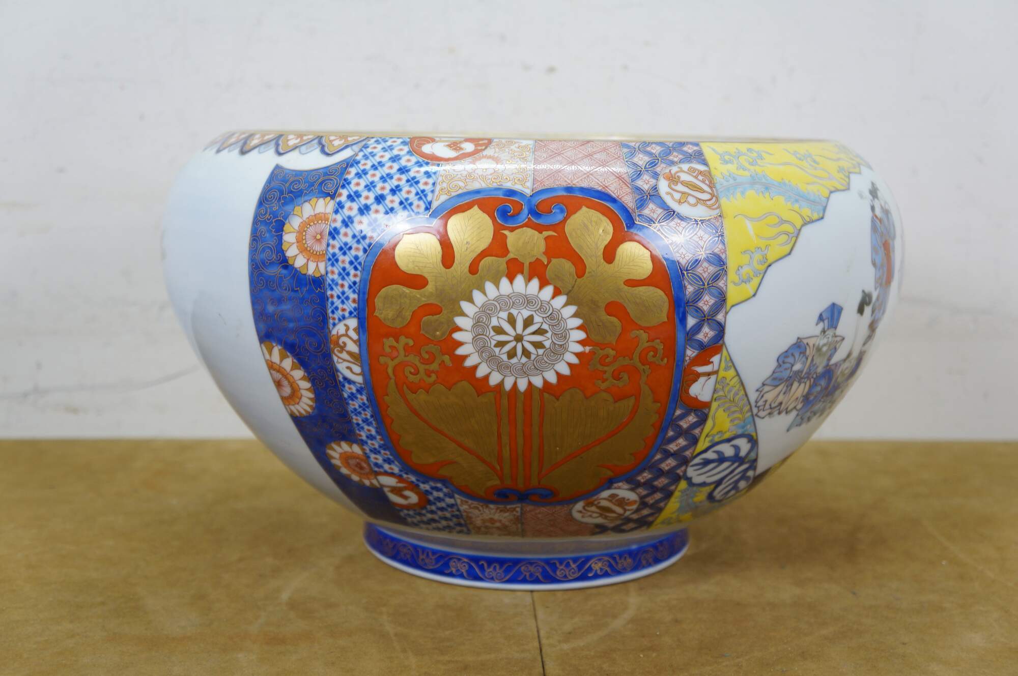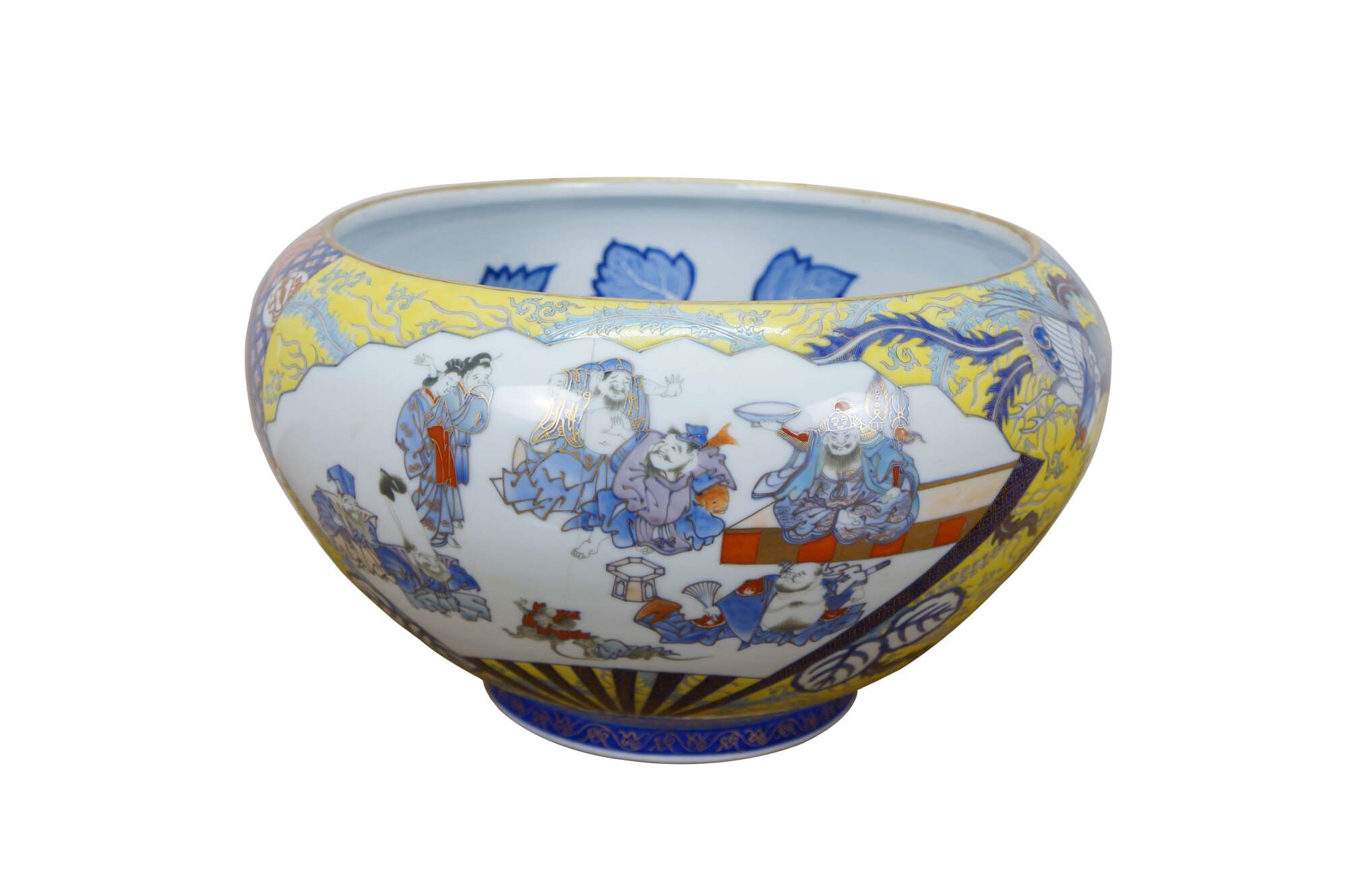 Circa early 20th century Japanese Meiji centerpiece fish bowl by Fukagawa Porcelain. Large onion shaped bowl painted on one side with a scene of figures / wise men / geishas and anthropomorphic rats, framed with brightly colored designs and a phoenix, with a trio of koi fish on the opposite side. Interior painted with blue flowers.