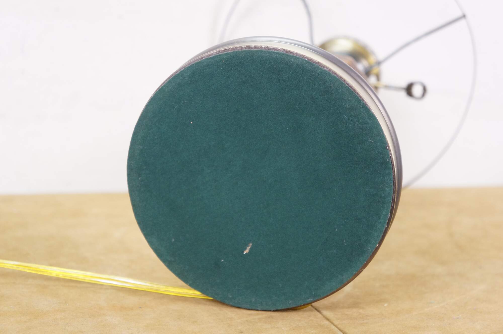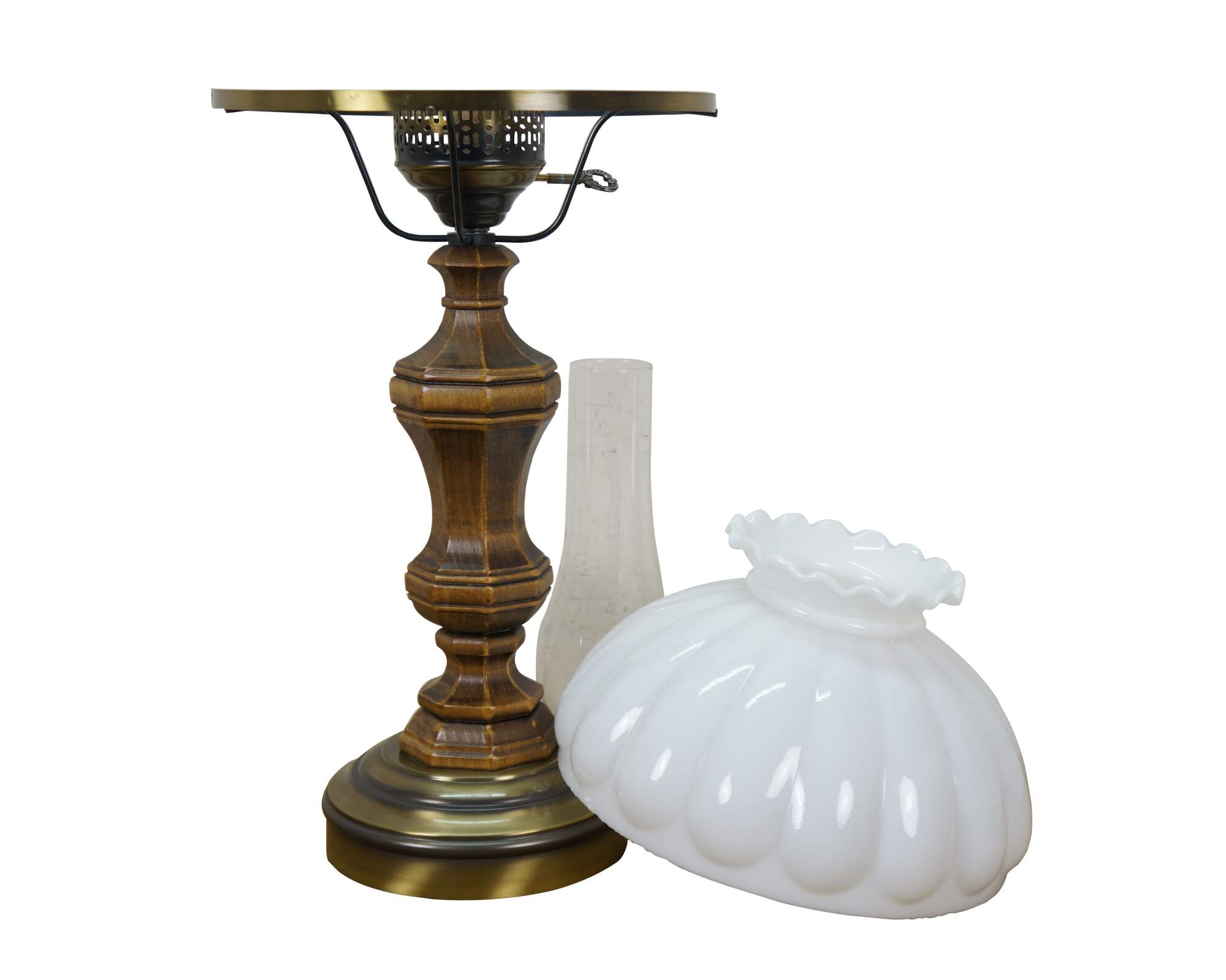 Late 20th century table lamp in the style of an old converted oil lamp. Faux wood grain resin body with round brass base and oil burner styled top supporting a clear glass hurricane and lobed, ruffle top, milk glass shade. Attributed to Pee Gee Lamps / Philip J. Greenspan Inc.