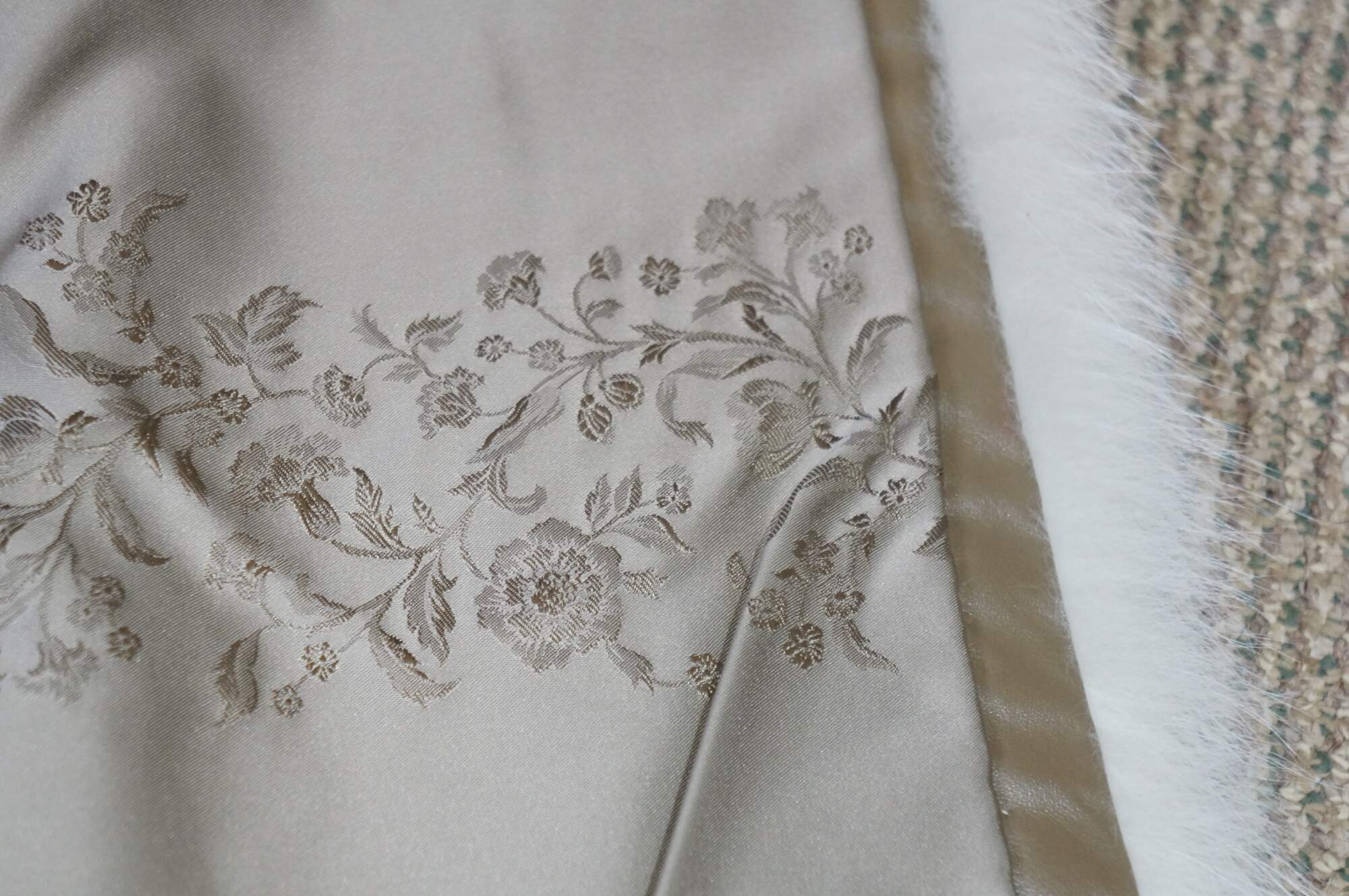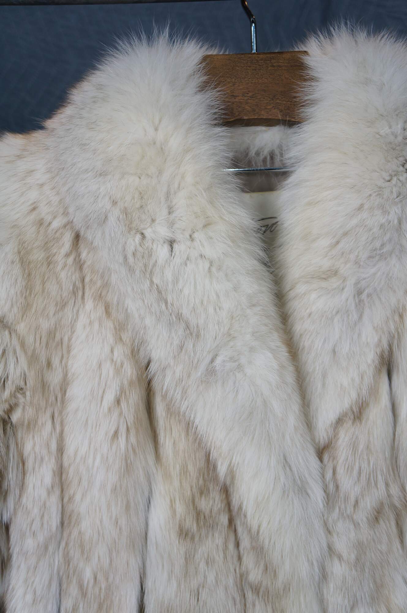 Mid to late 20th century natural blue / silver fox taxidermy fur coat. Full length; textured sleeves; hook and loop closure; no exterior pockets. Floral embroidered taupe lining. One interior breast pocket. Kotsovos - Roselawn Custom Furriers.