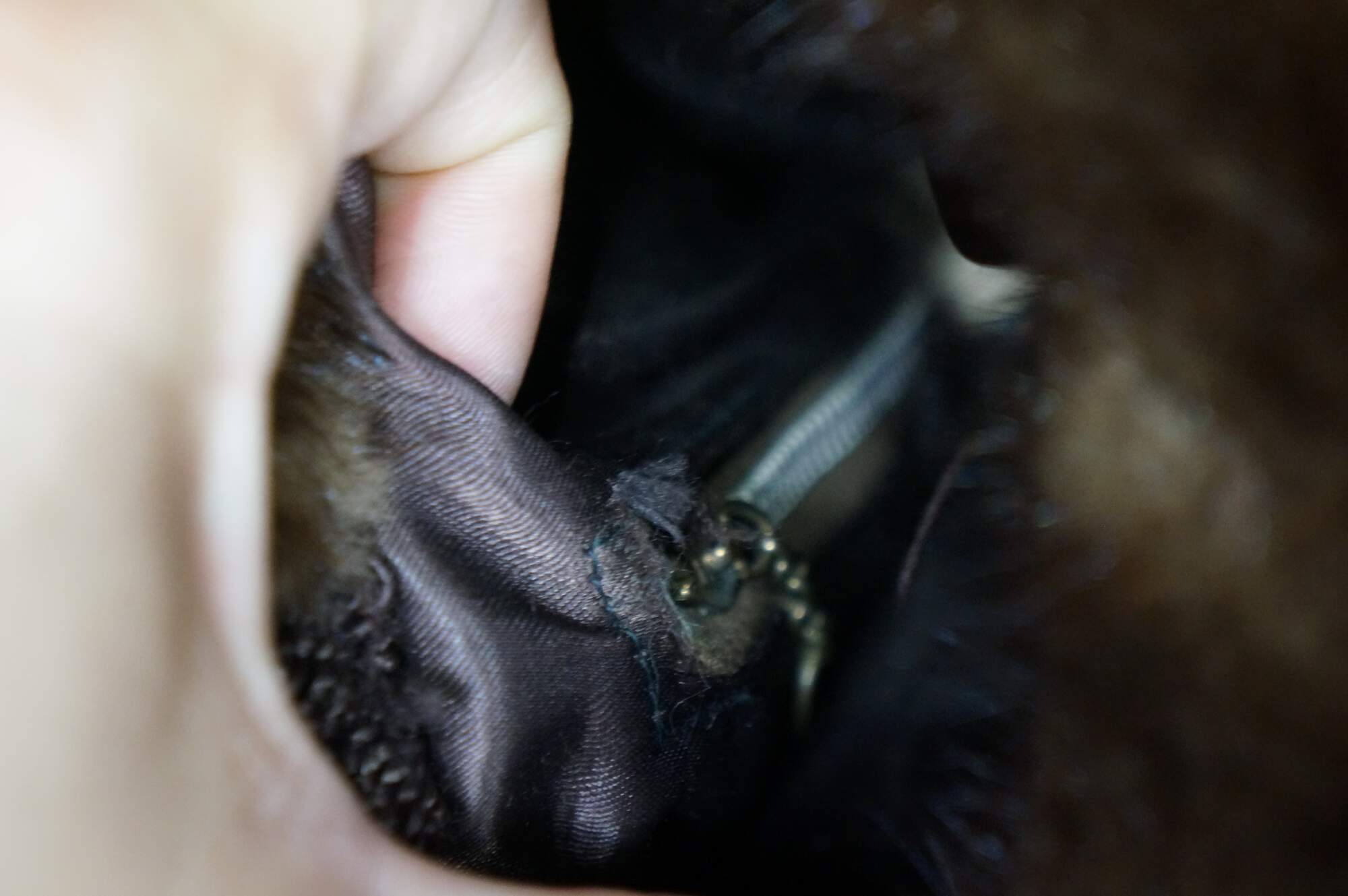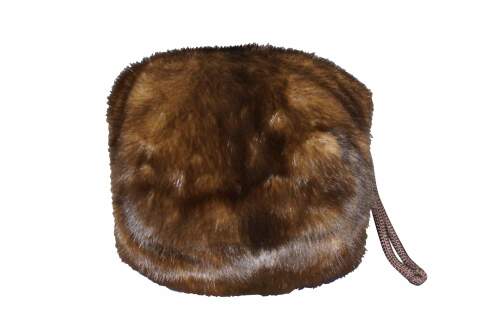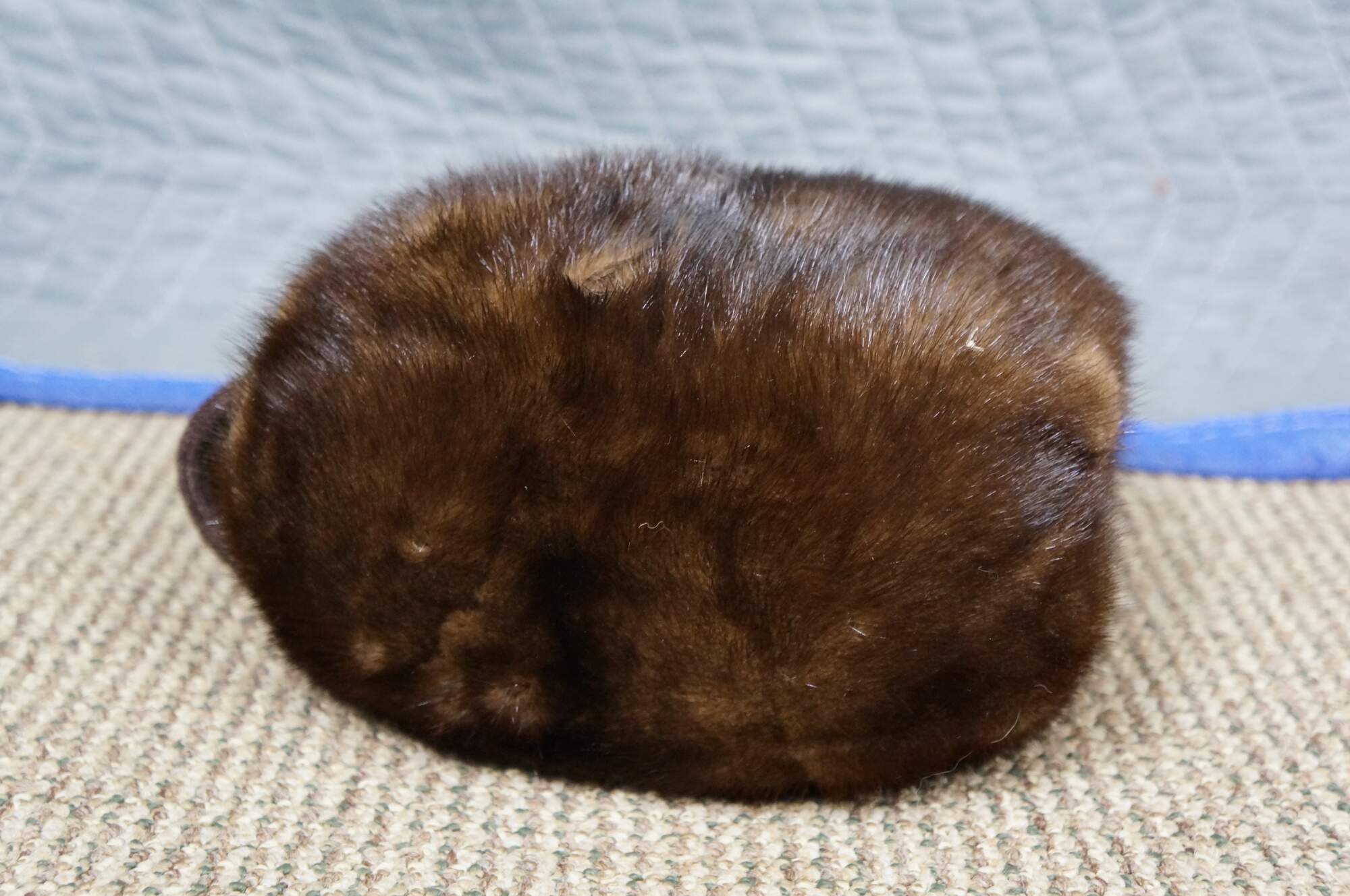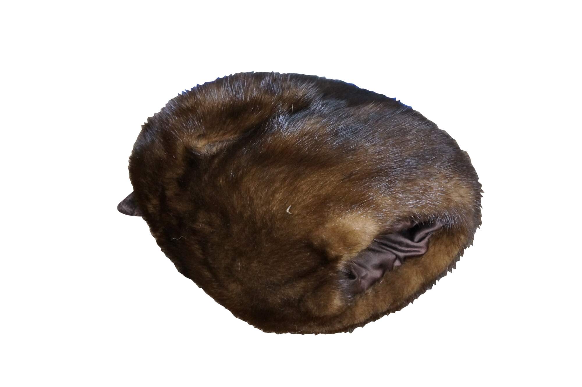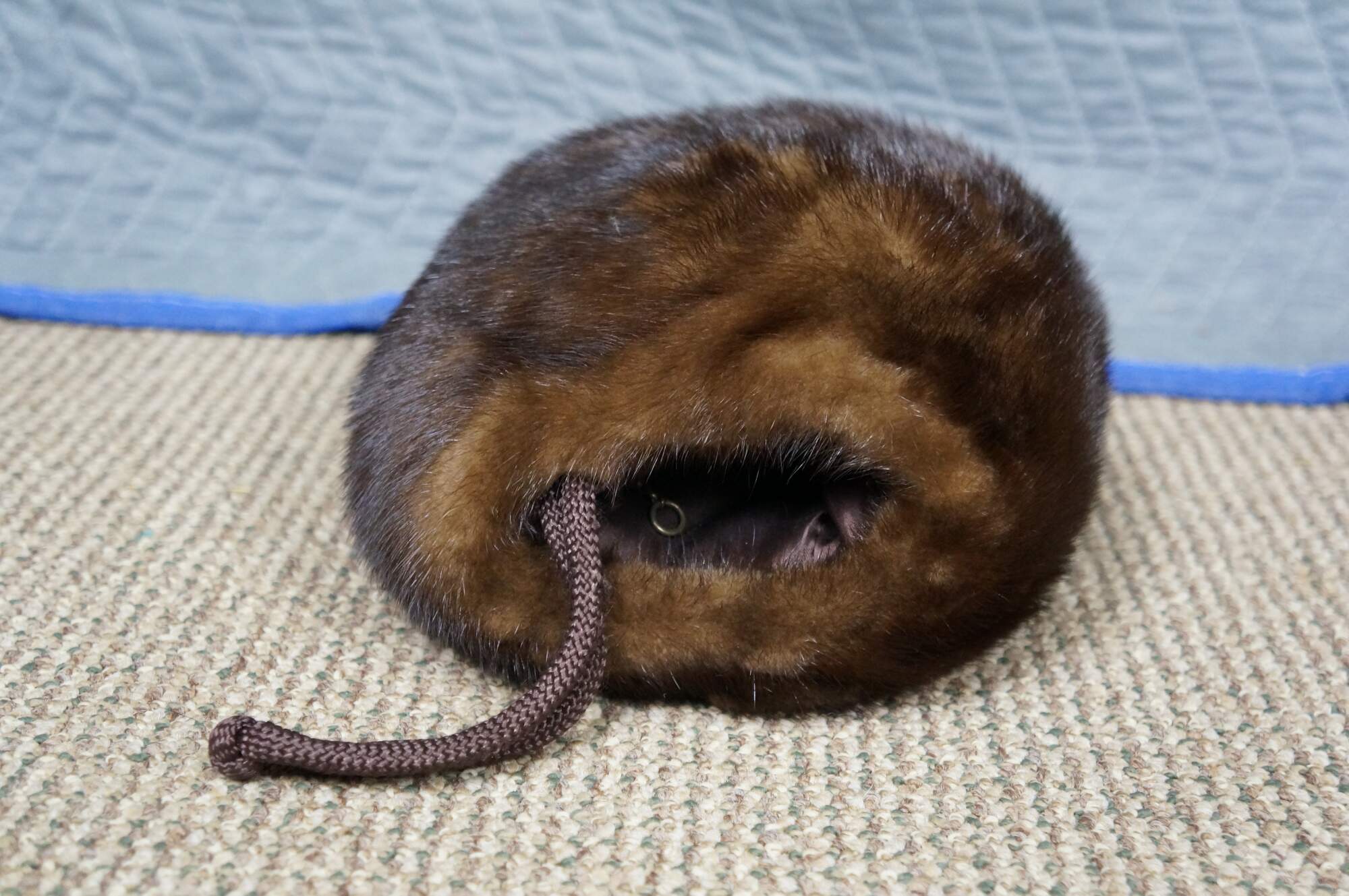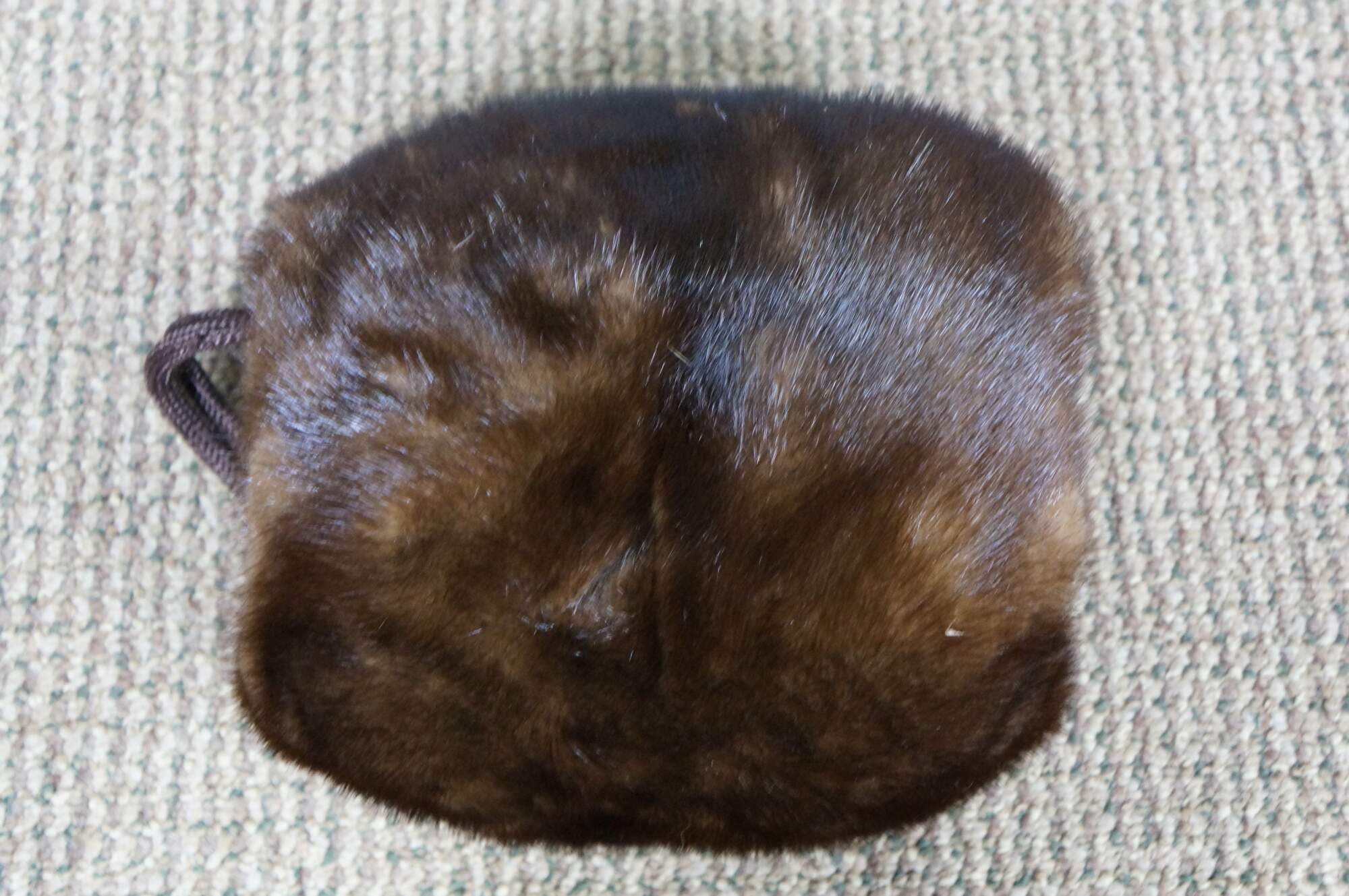 Mid to late 20th century natural dark brown mink taxidermy fur muff / hand warmer. Brown cord wrist loop; brown lining; one zipper pocket.