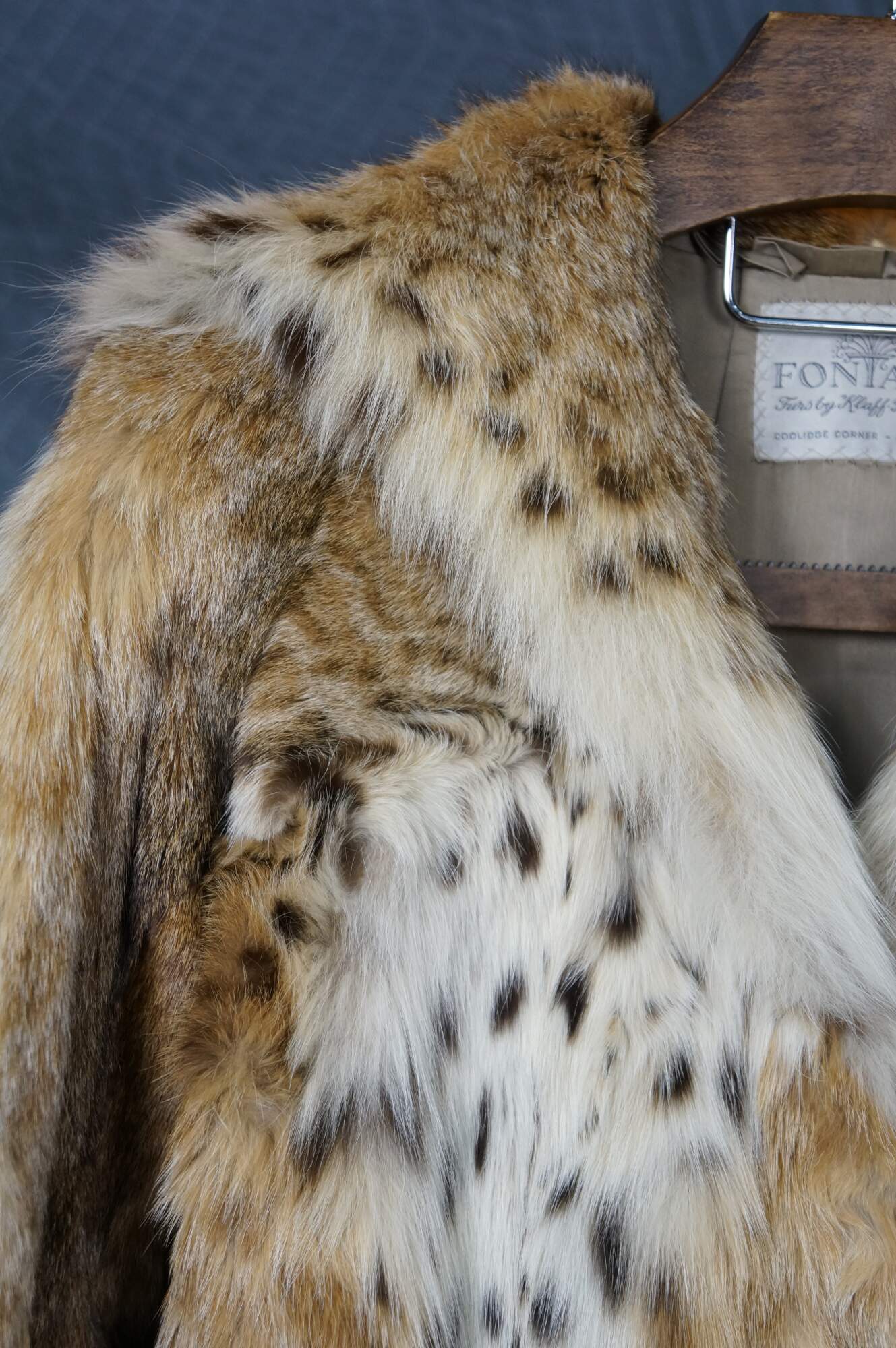 Mid to late 20th century natural spotted lynx / Bobcat fur taxidermy coat. Mid-length; hook and loop closure; no pockets; two belt slits at sides (no belt). Taupe lining monogrammed with initials JPC. Fontana Furs by Klaff Brothers - Coolidge Corner - Brookline.