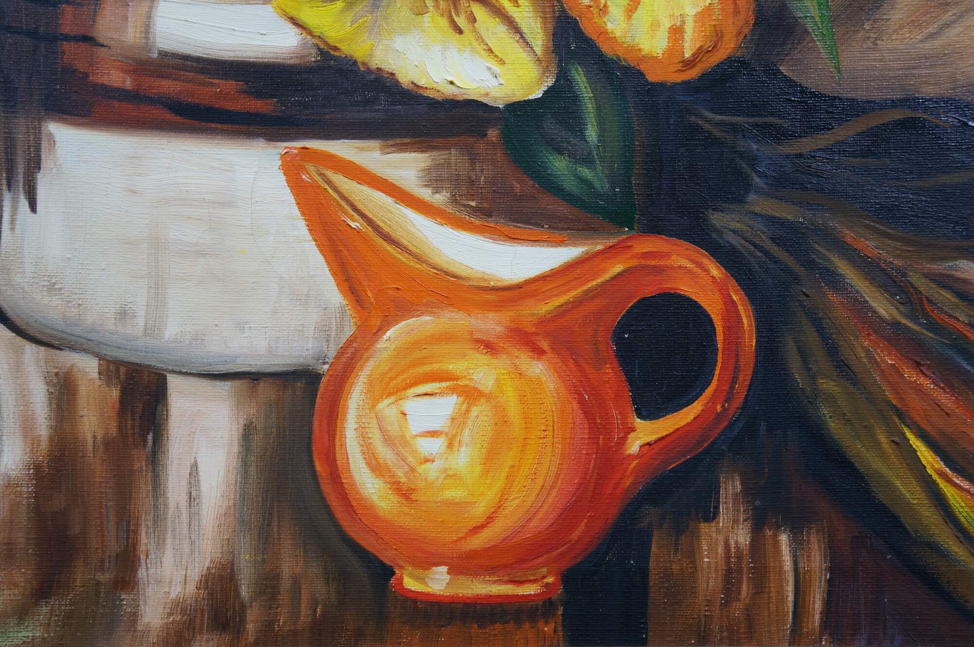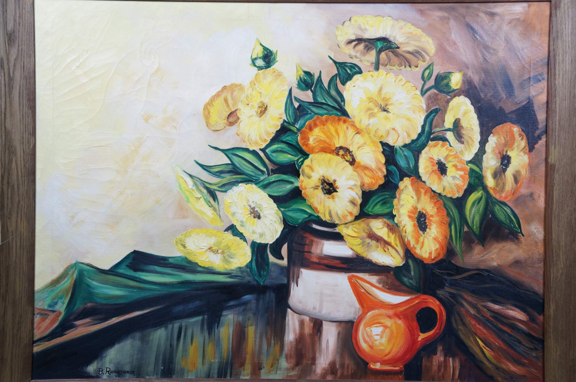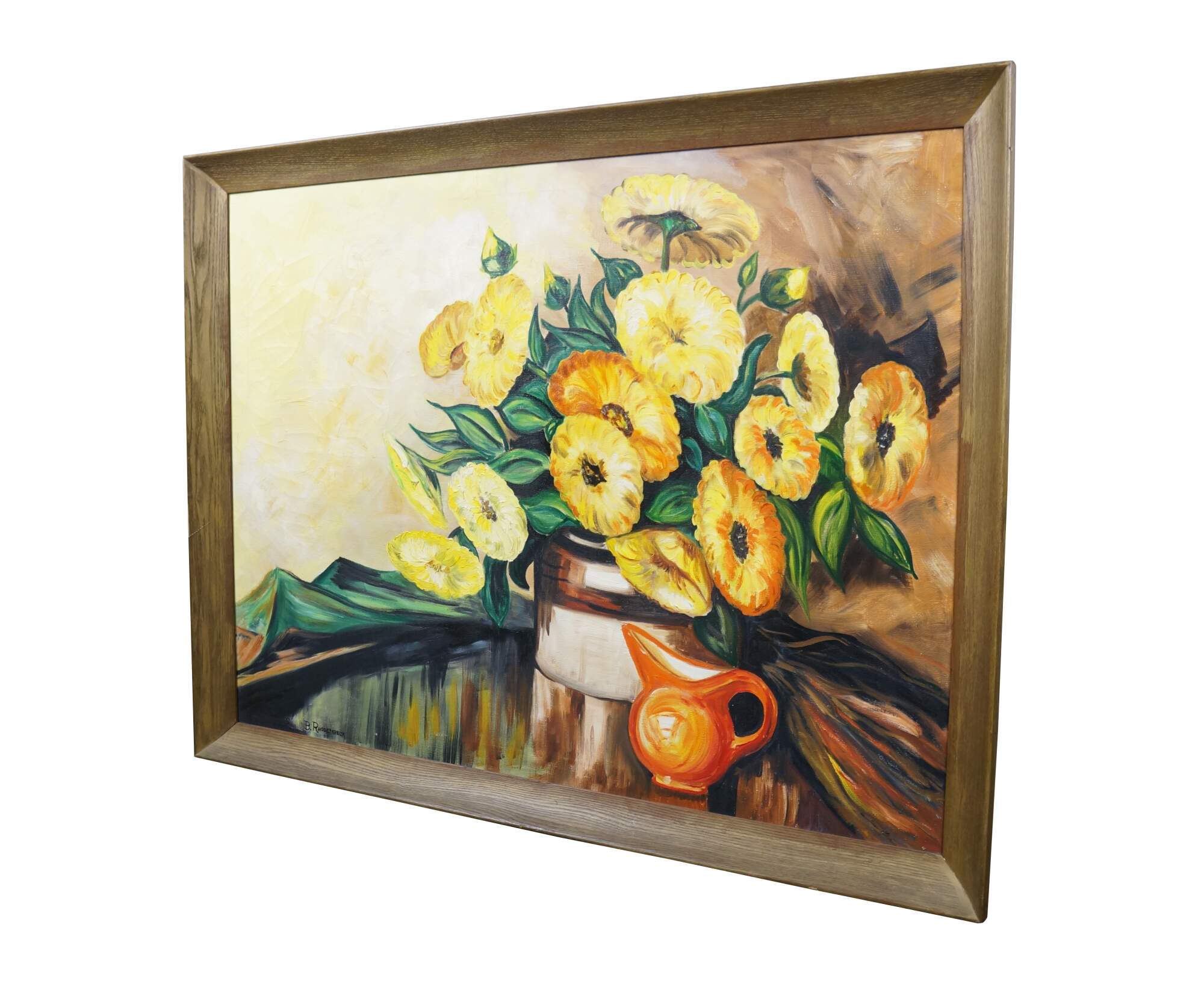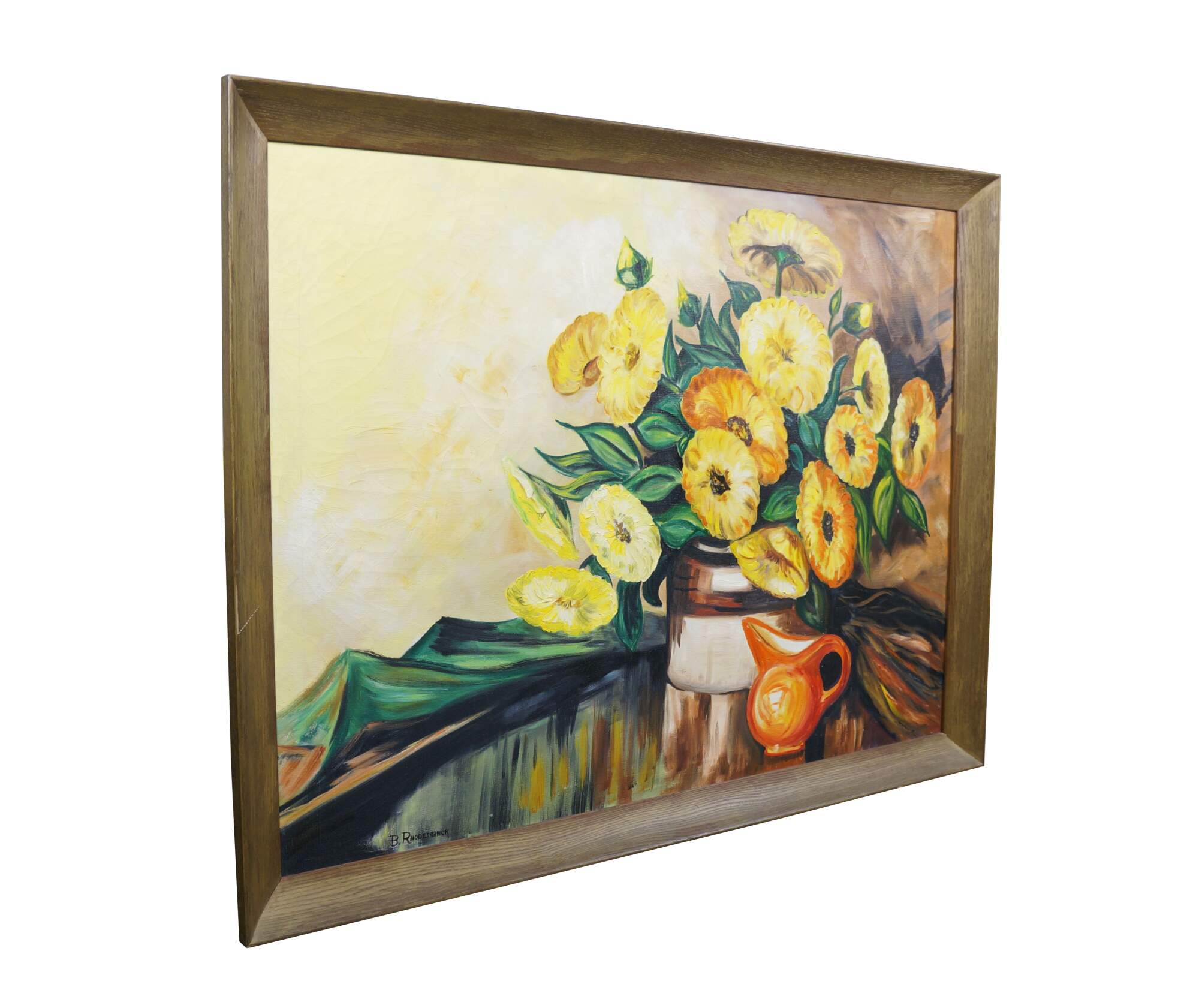 Vintage 20th century oil on canvas still life painting depicting a crock of yellow flowers on a table, draped around with a green cloth, and an orange pitcher in front. Signed B. Rhodenbeck, lower left. Beveled wood frame.