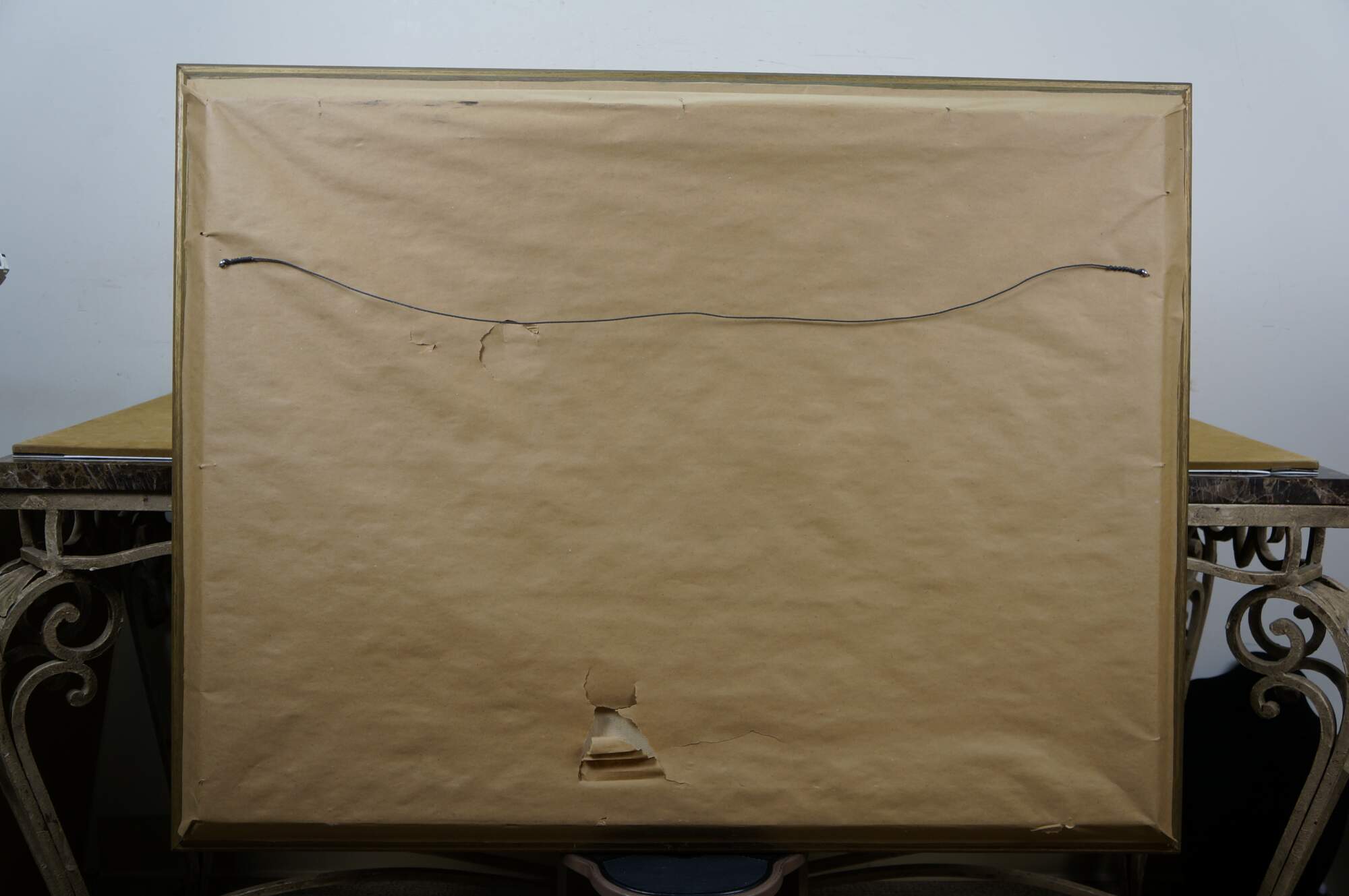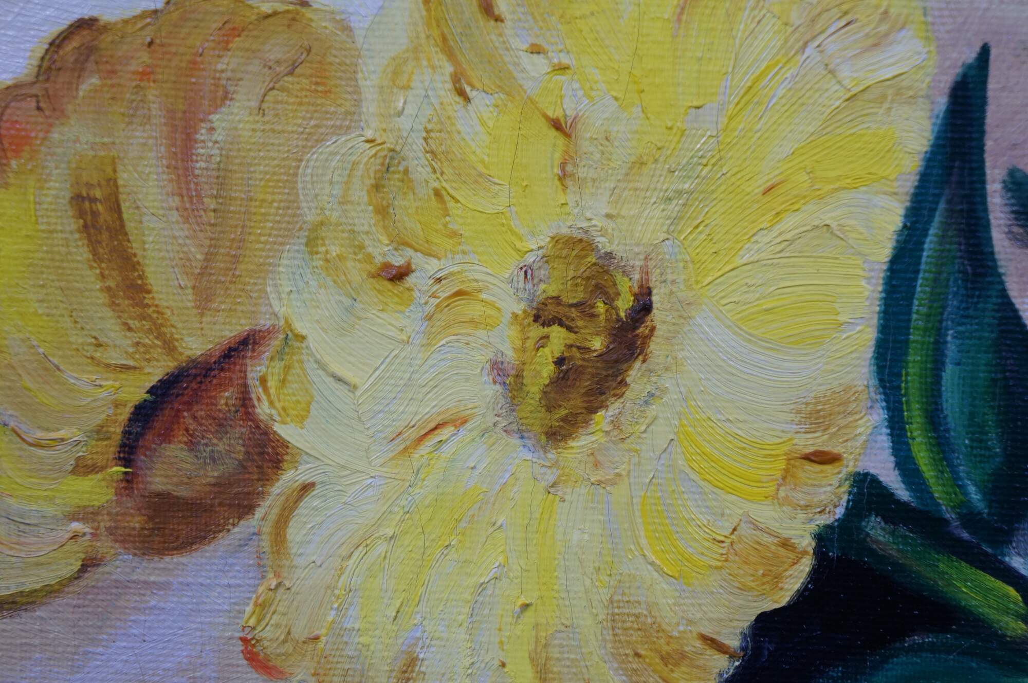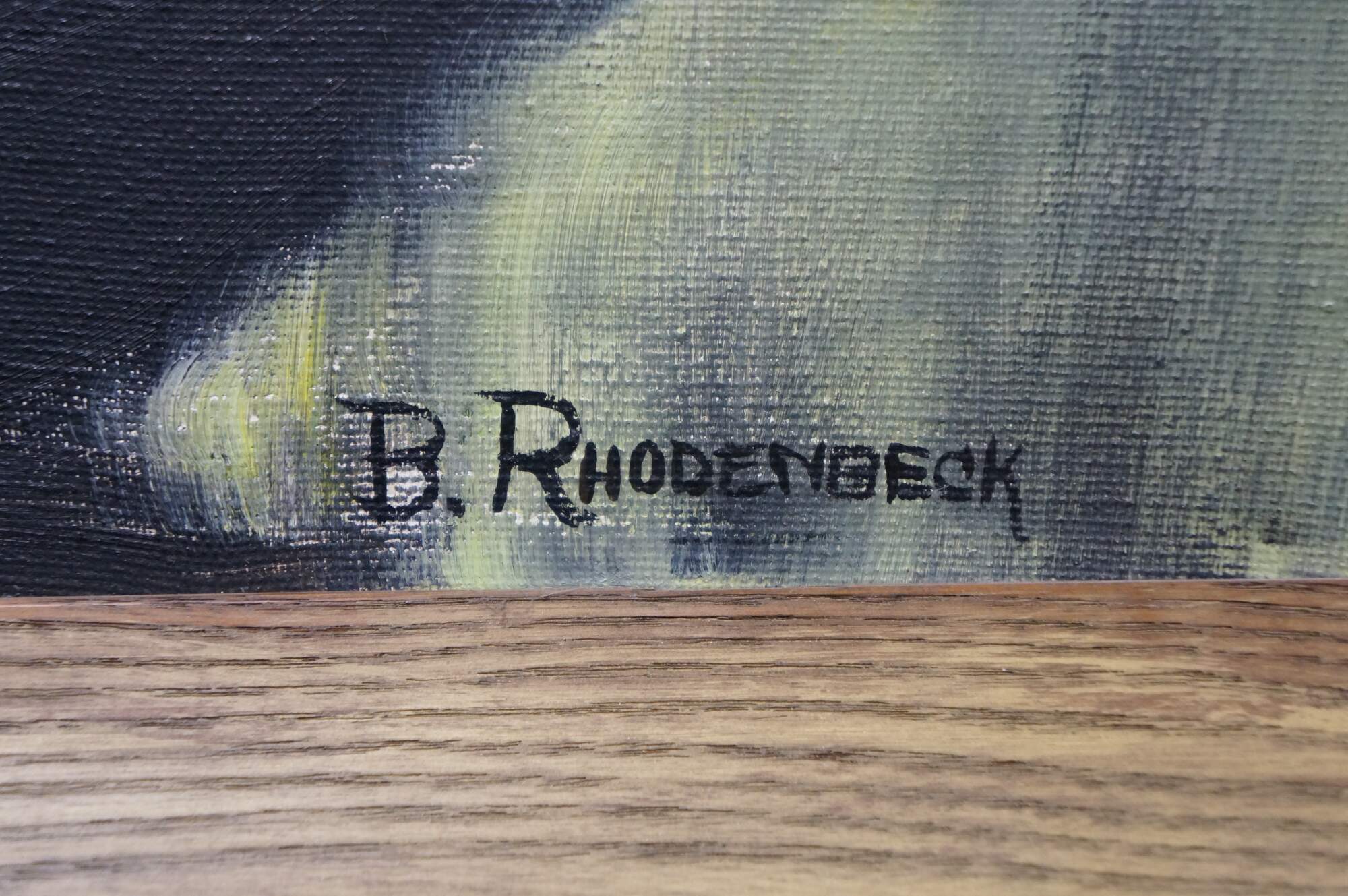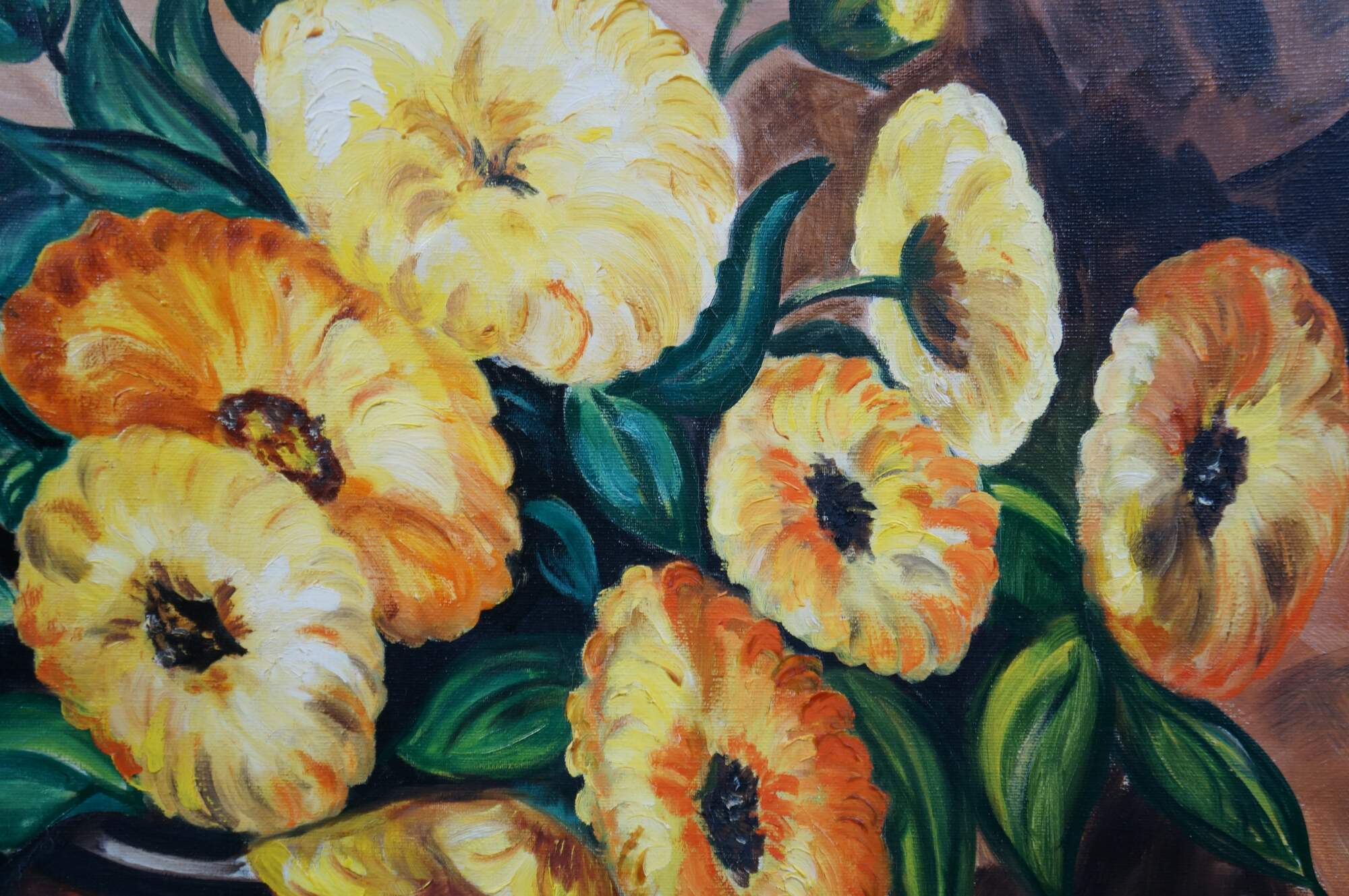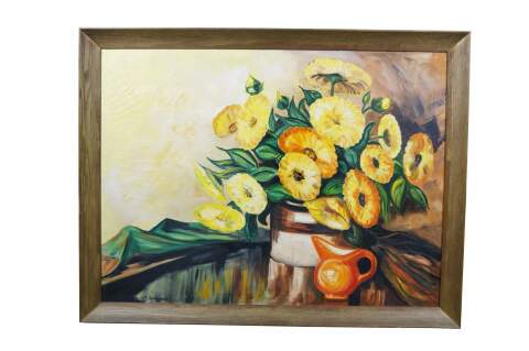 Vintage 20th century oil on canvas still life painting depicting a crock of yellow flowers on a table, draped around with a green cloth, and an orange pitcher in front. Signed B. Rhodenbeck, lower left. Beveled wood frame.