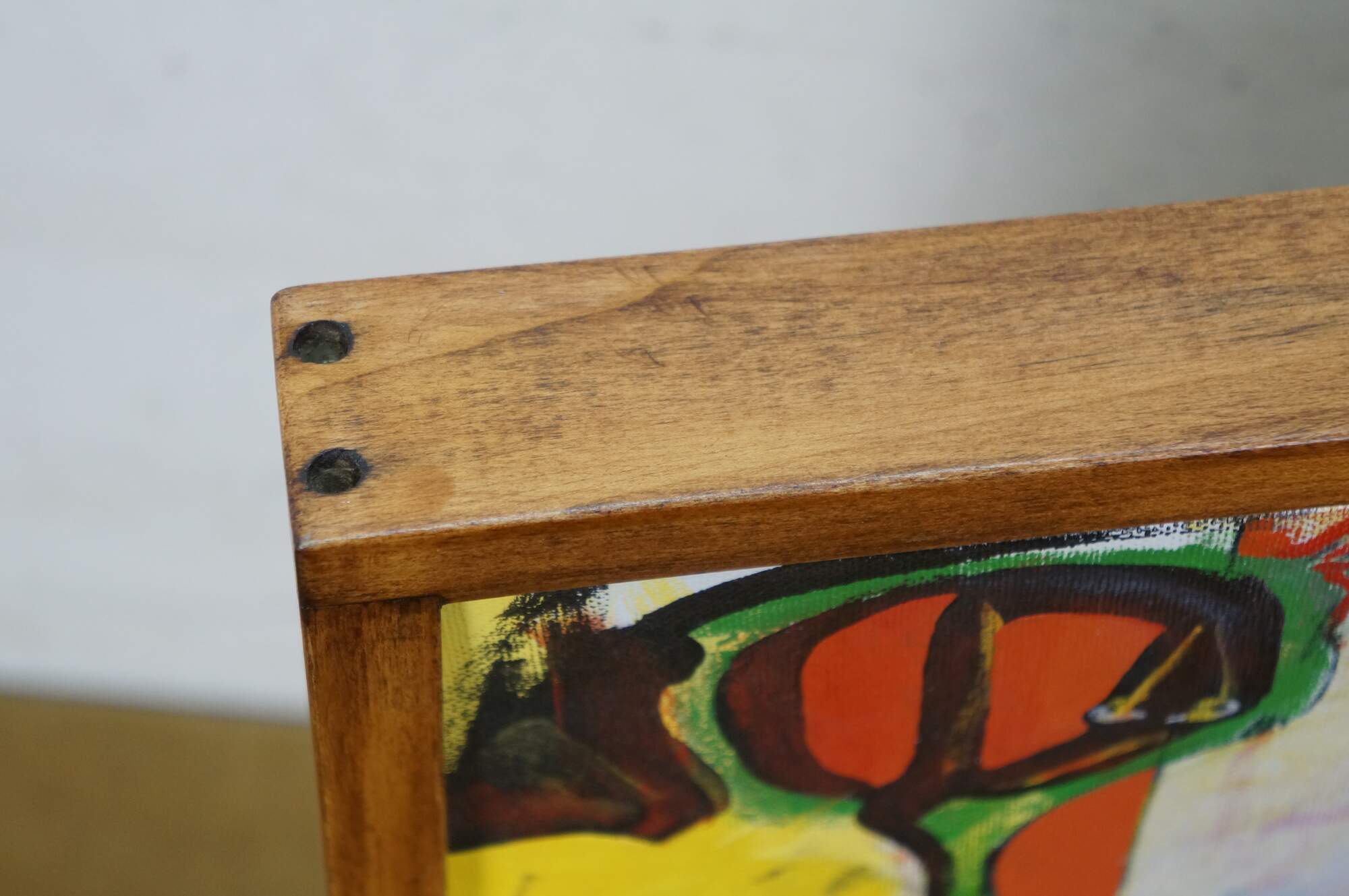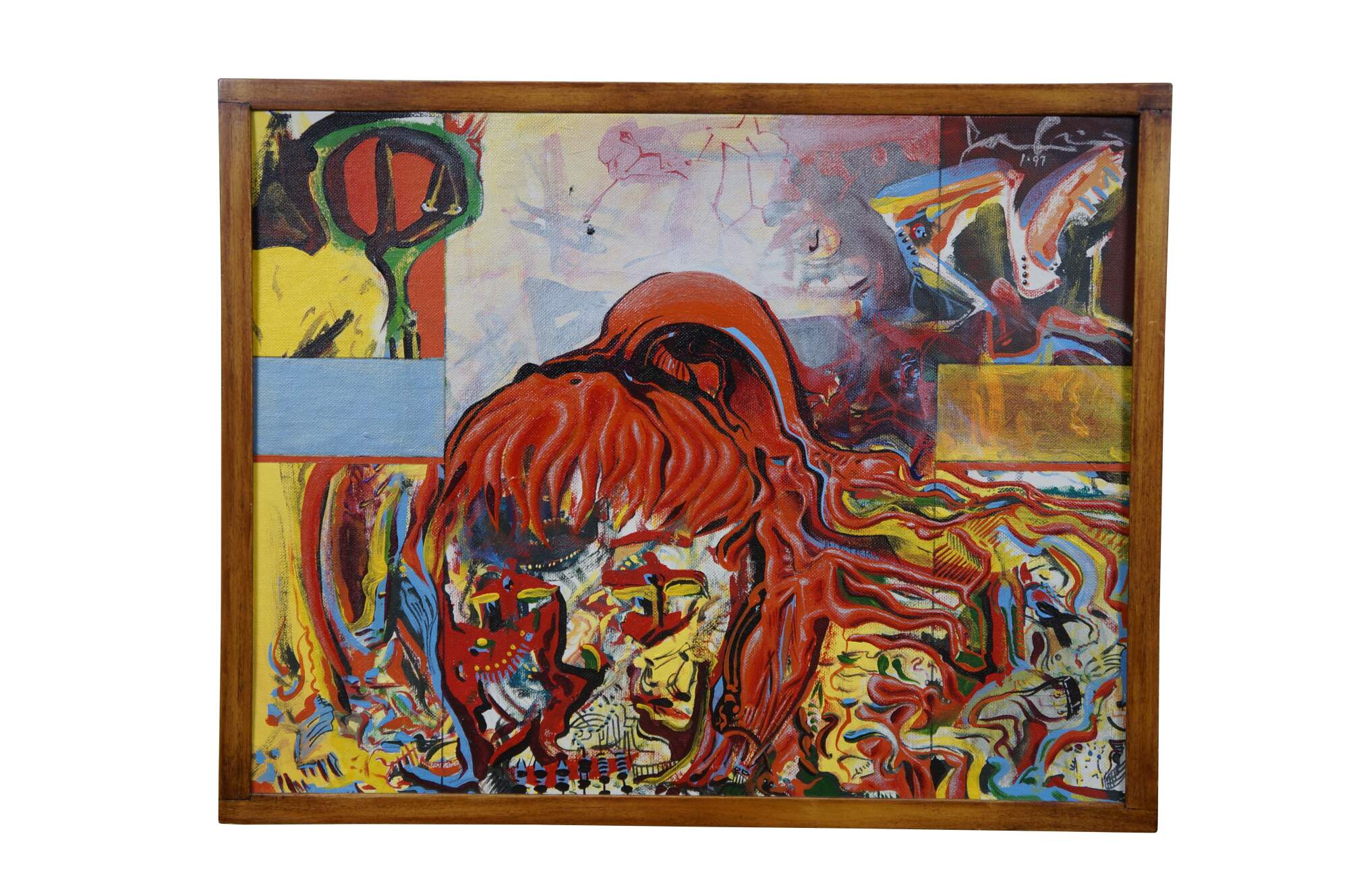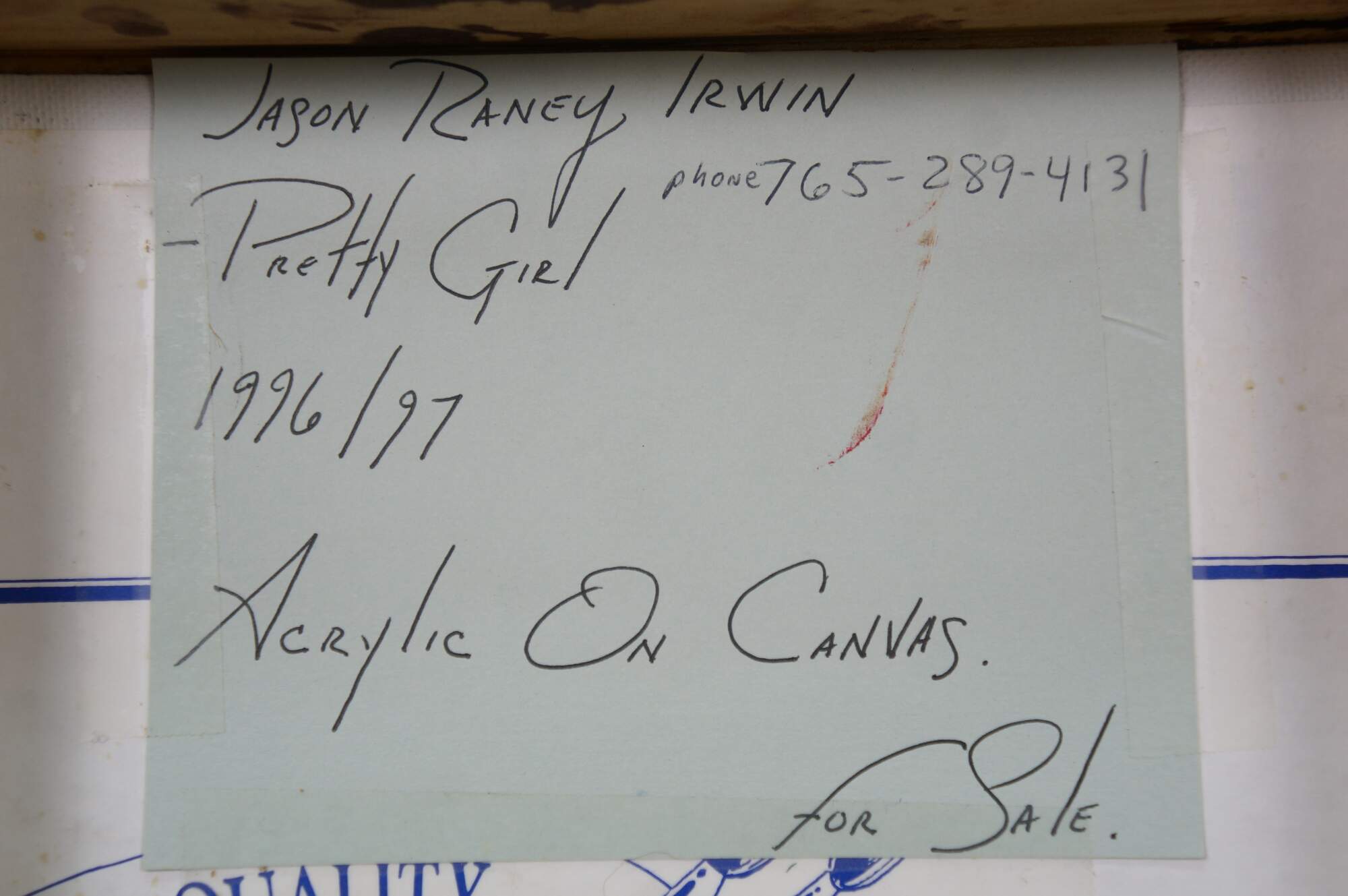 Vintage acrylic oil on canvas board painting titled "Pretty Girl" by Jason Raney Irwin. Depicts an abstract expressionist portrait of a female face with red band and hair in a pony tail, made of and surrounded by graffiti style shapes and figures. Signed and dated 1997, upper right. Wood frame.