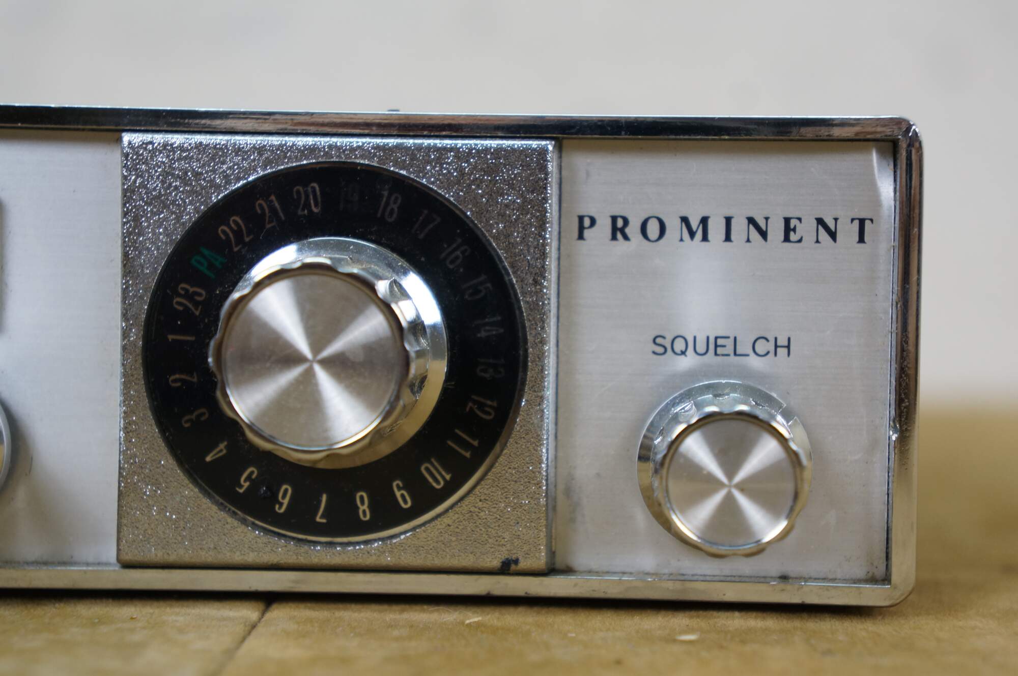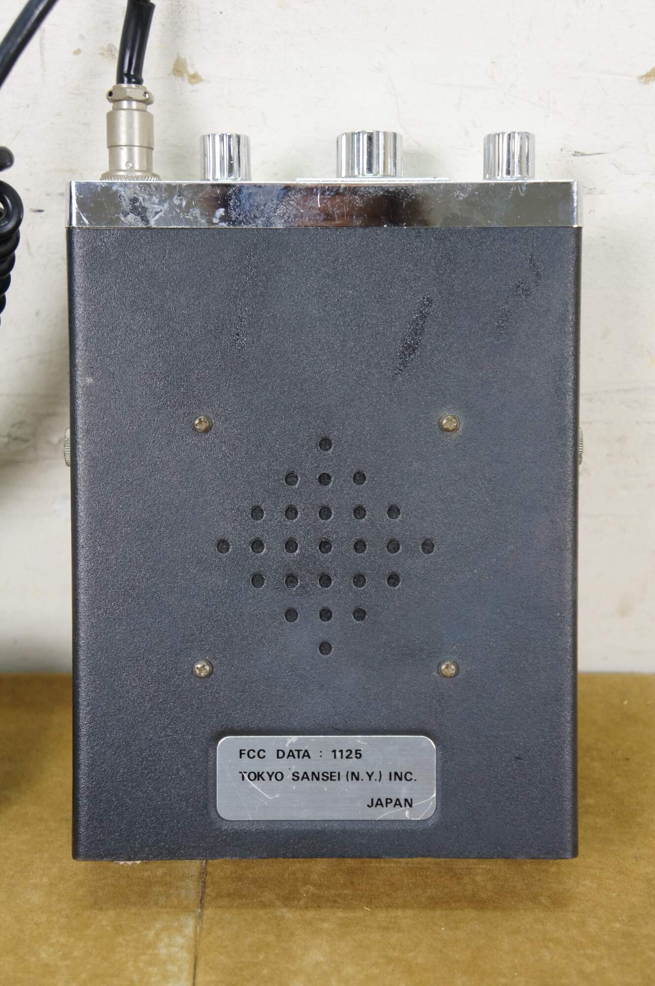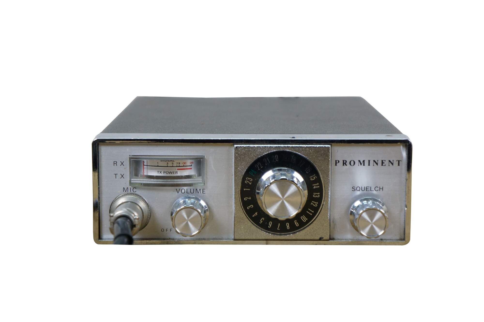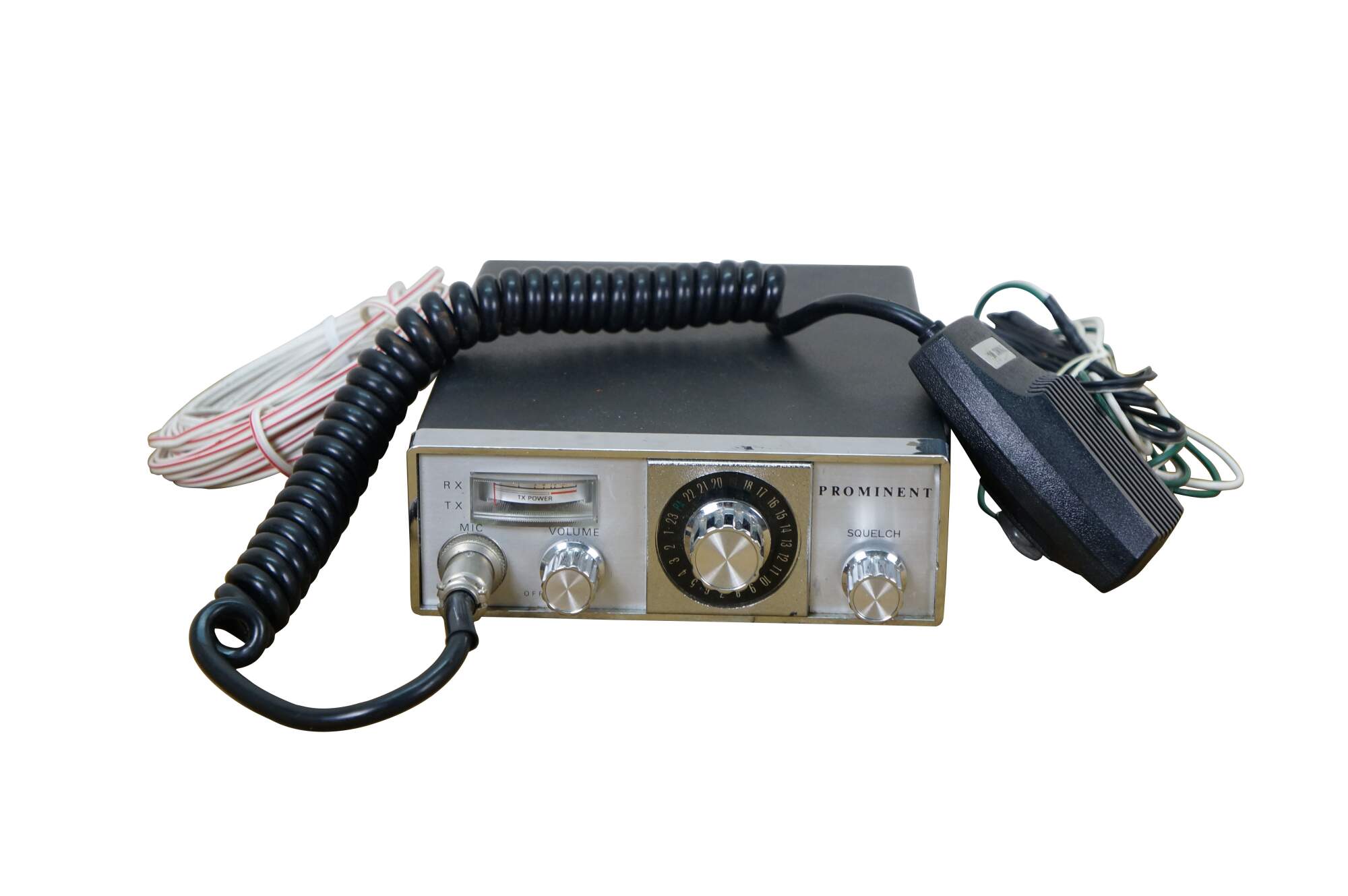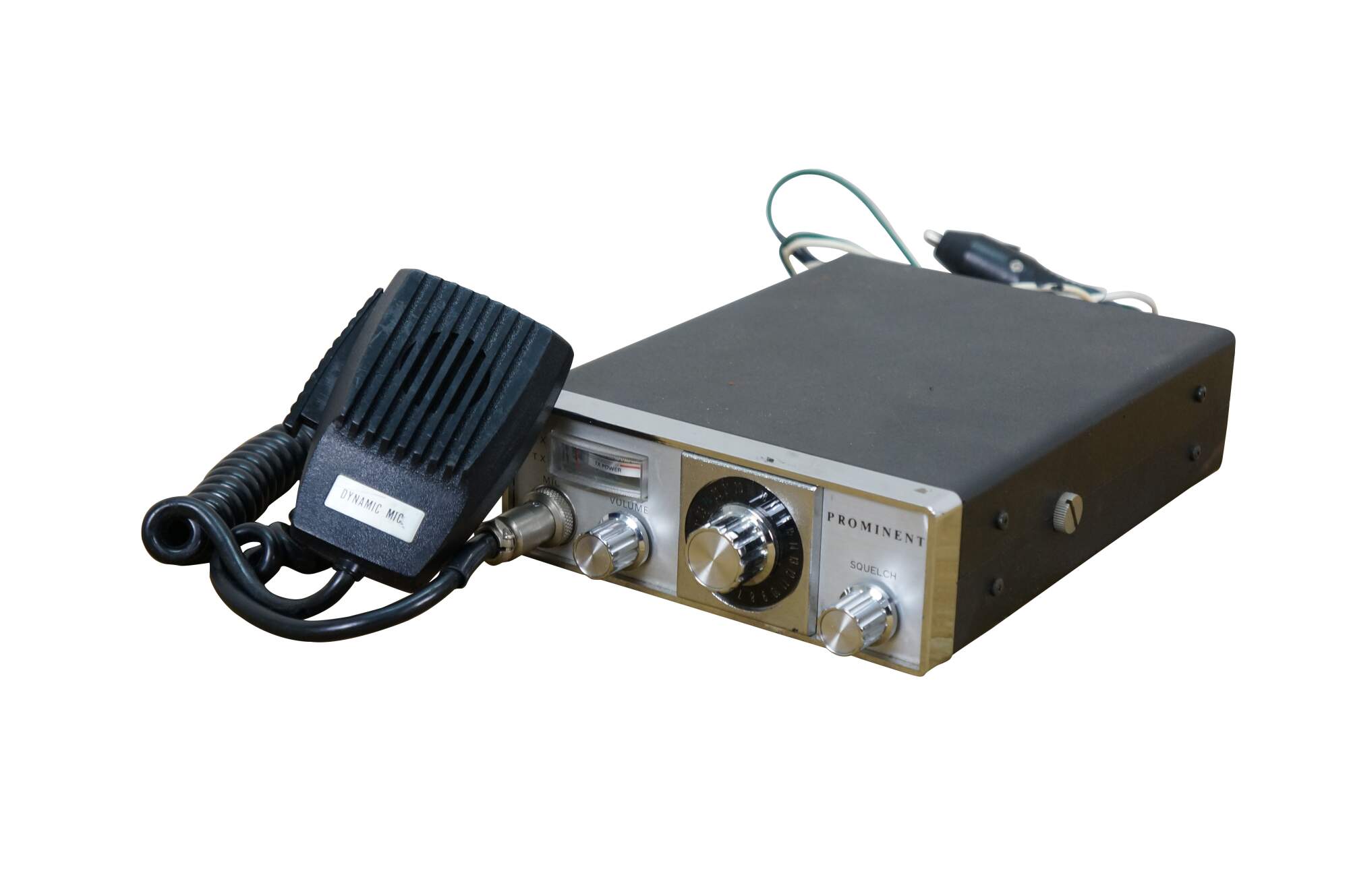 Mid to late 20th century Prominent 23 channel CB Radio and Dynamic Mic. No. 80016555. 27 MHz Transceiver / DC 13.8V - FCC Data: 1125 - Tokyo Sansei (NY) Inc - Made in Japan. Wired to plug into automobile cigarette lighter socket.