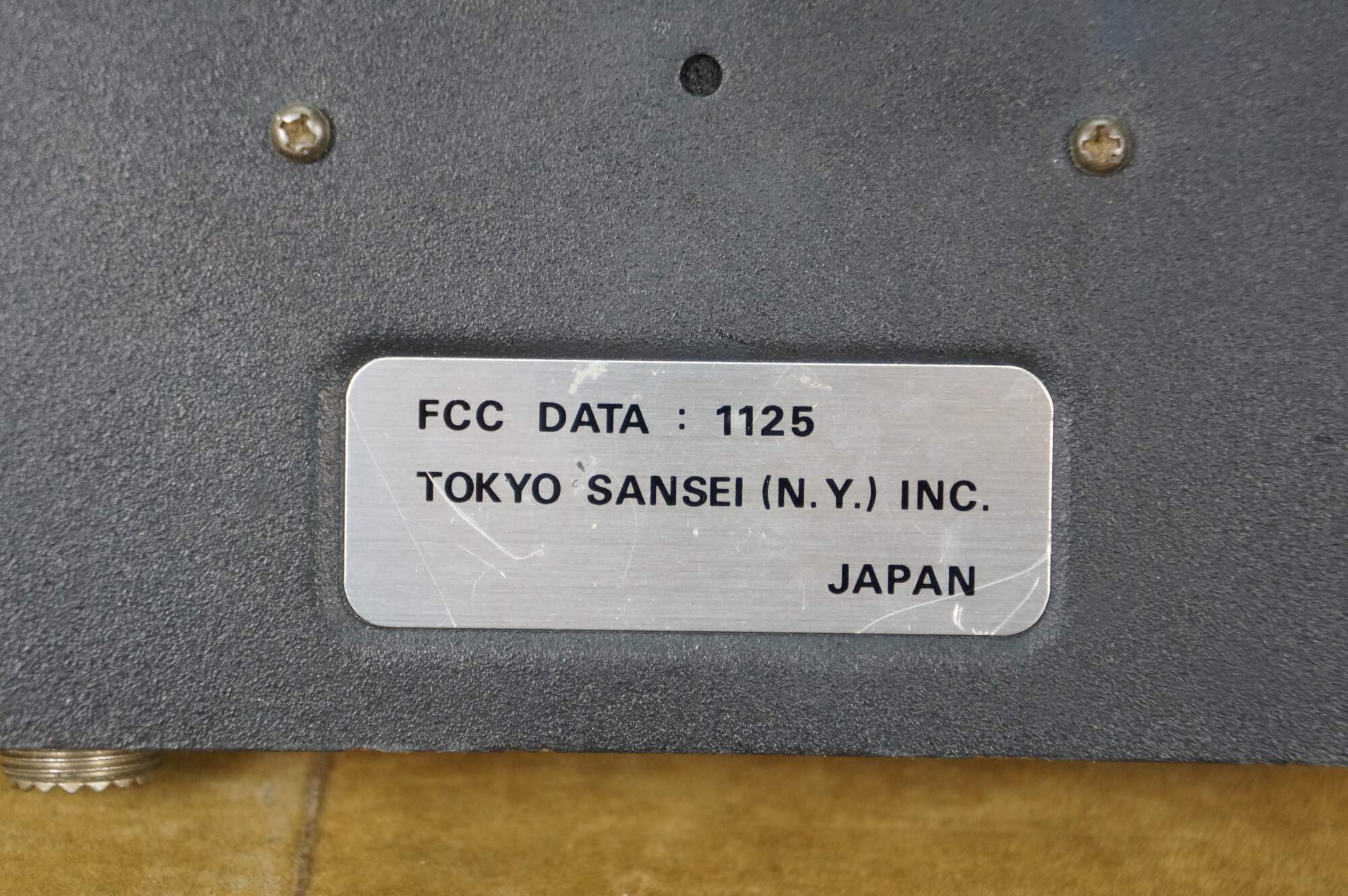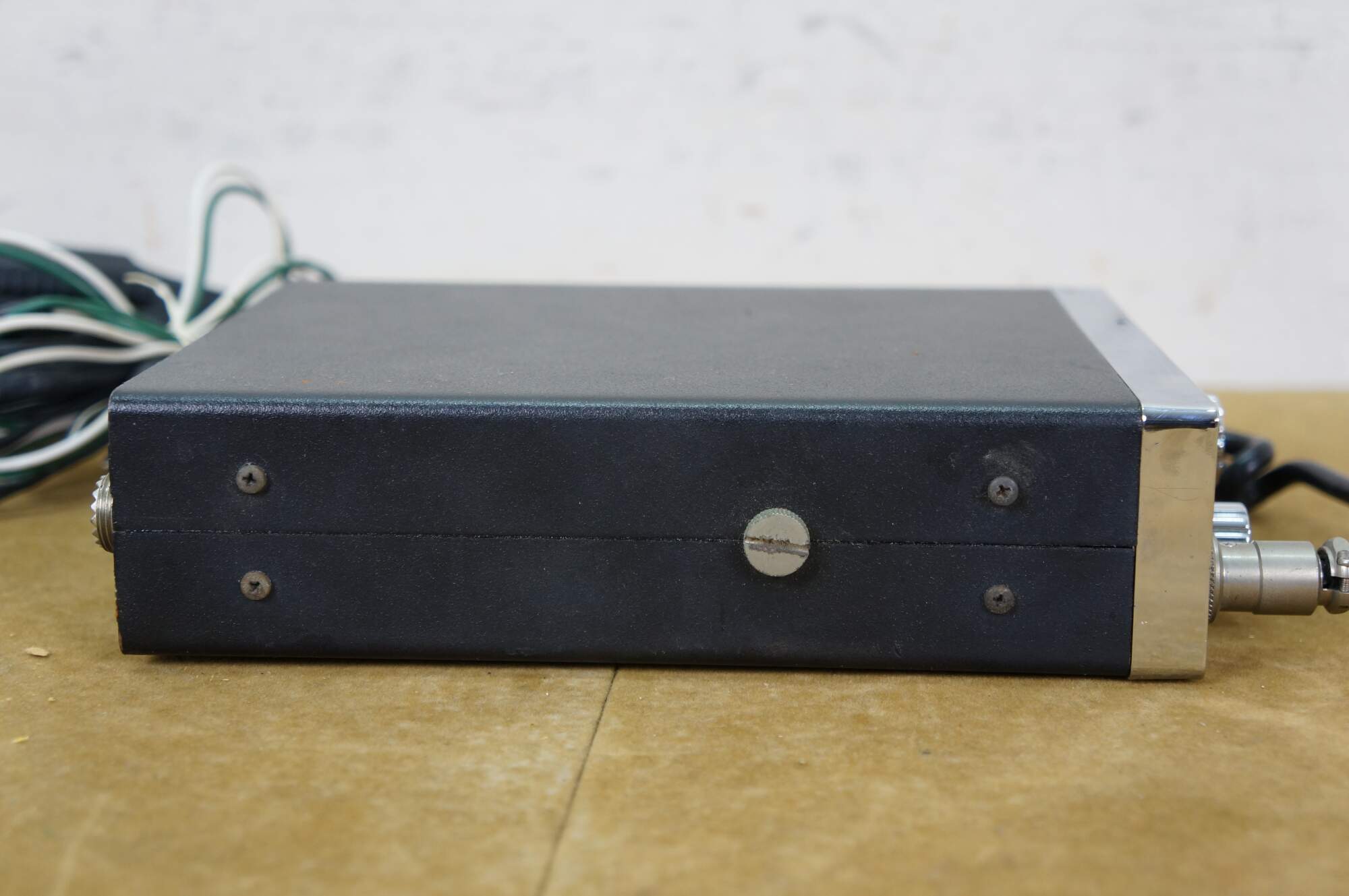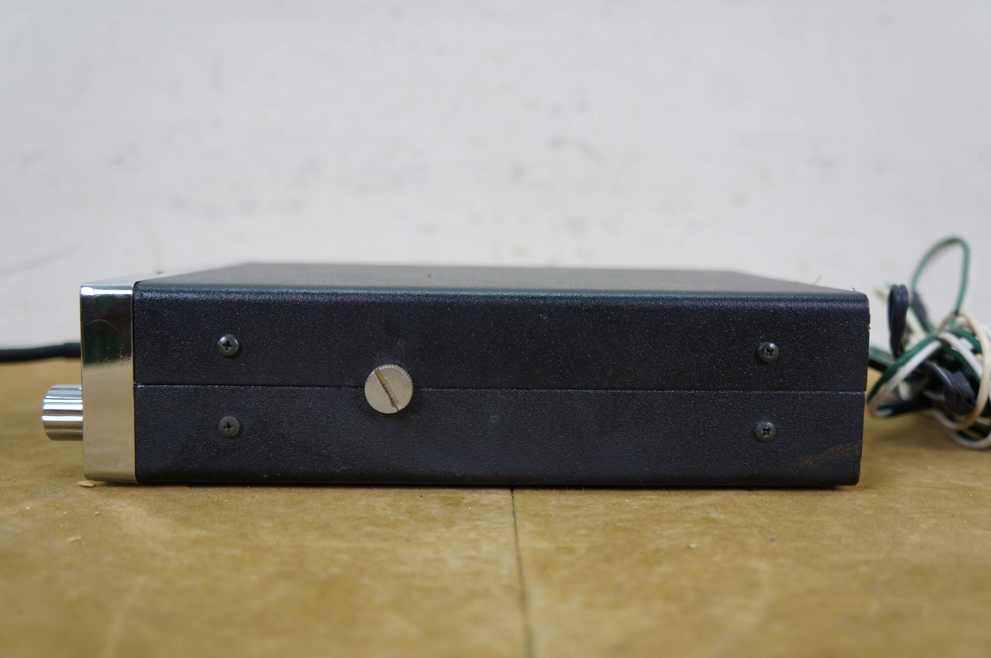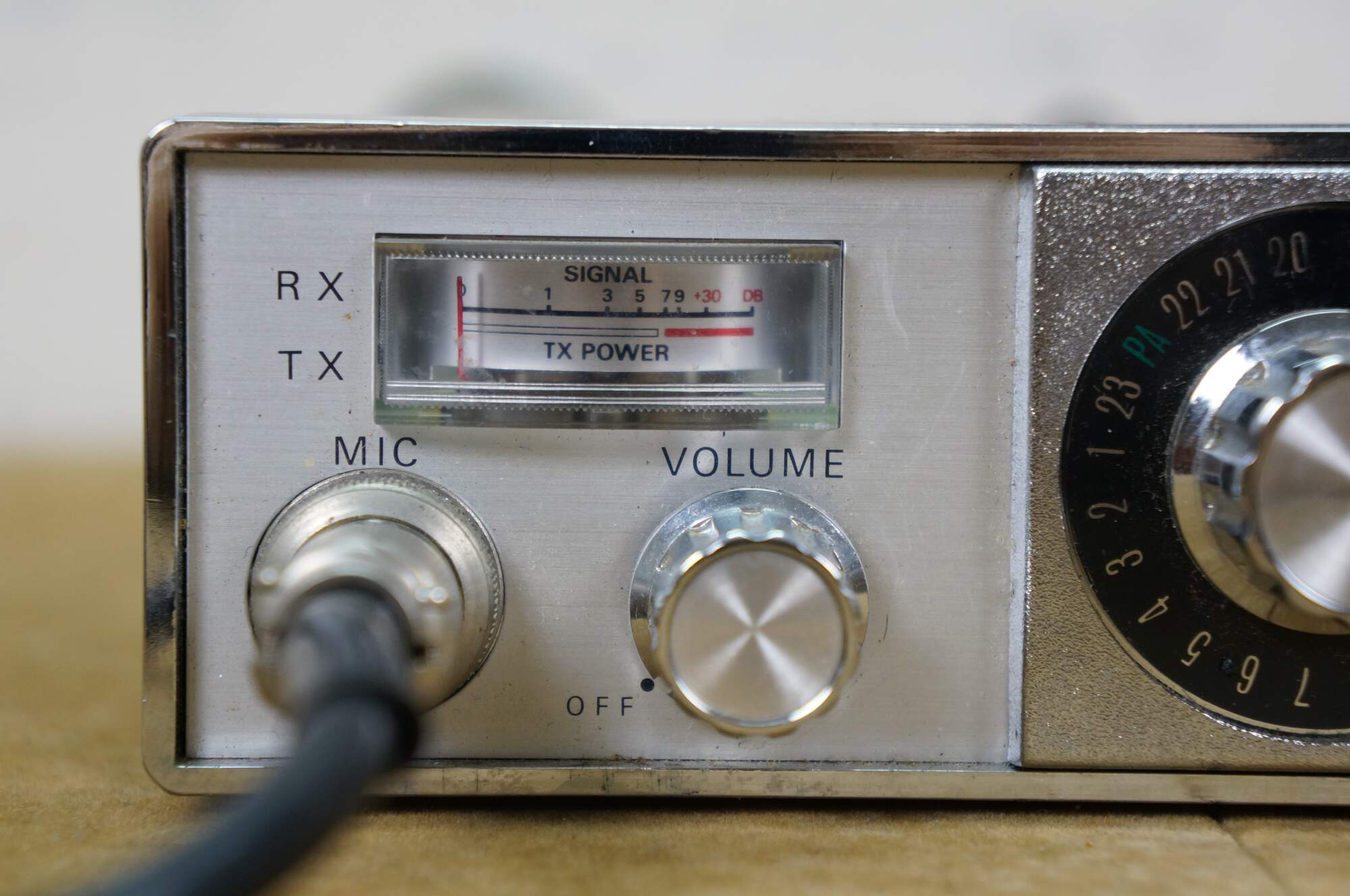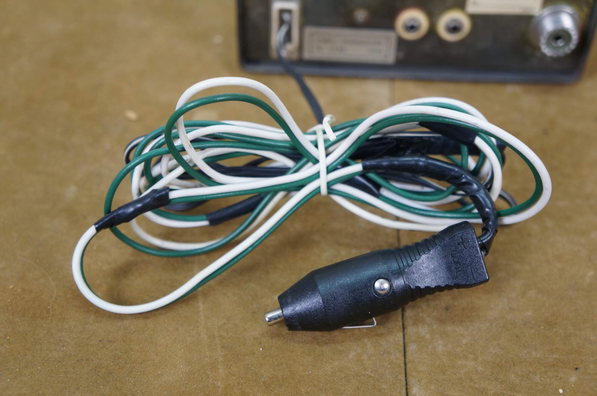 Mid to late 20th century Prominent 23 channel CB Radio and Dynamic Mic. No. 80016555. 27 MHz Transceiver / DC 13.8V - FCC Data: 1125 - Tokyo Sansei (NY) Inc - Made in Japan. Wired to plug into automobile cigarette lighter socket.