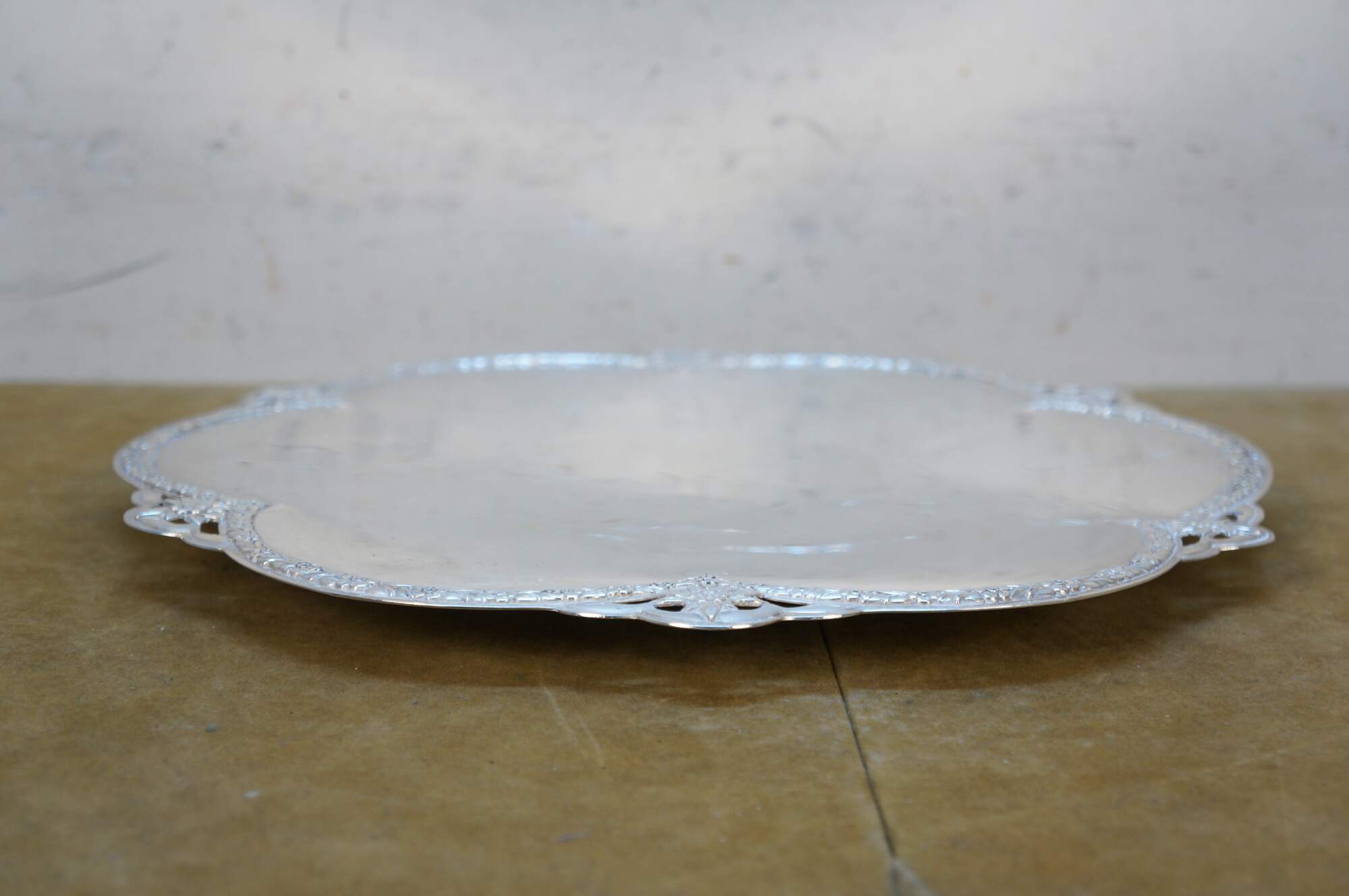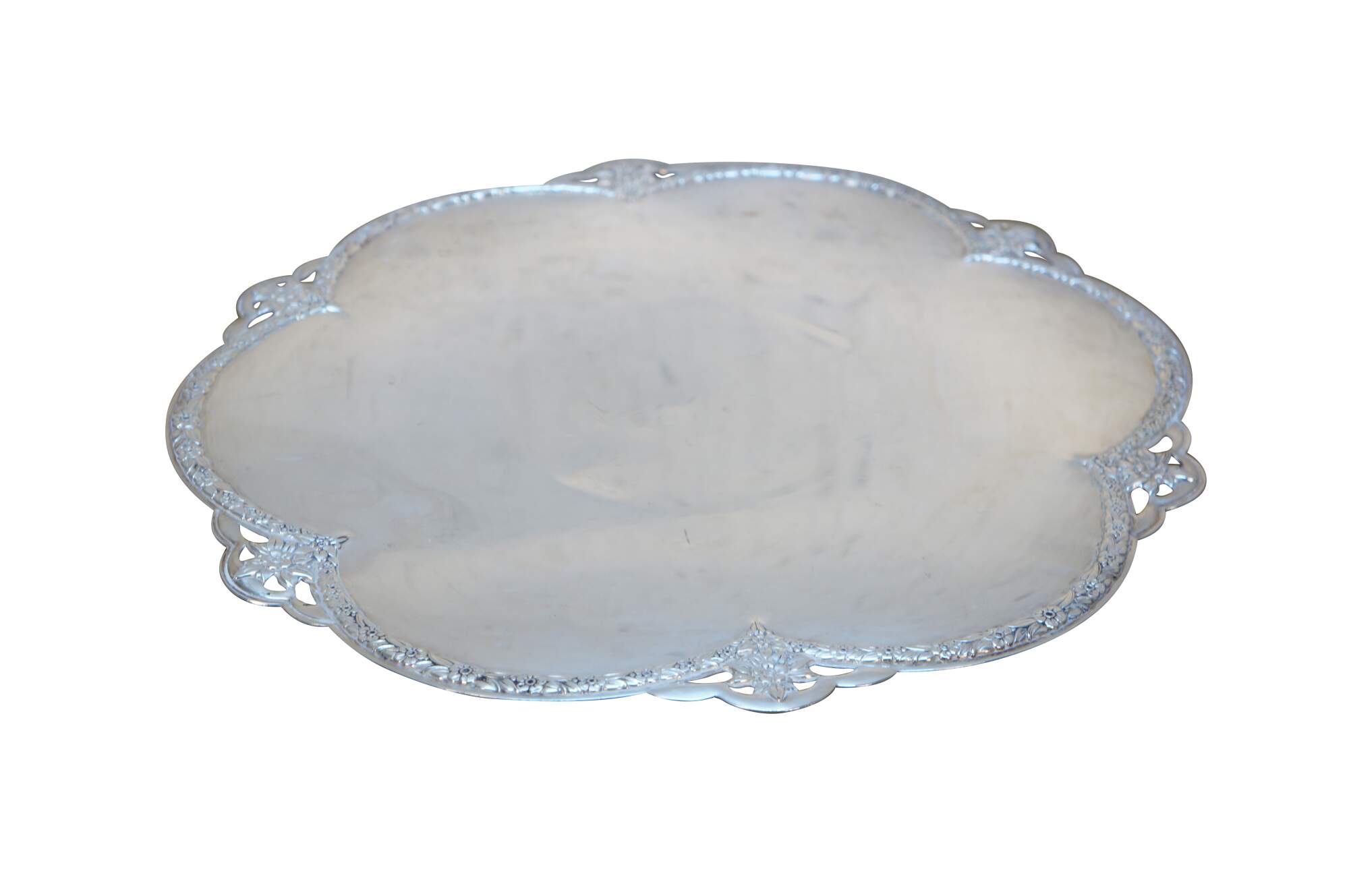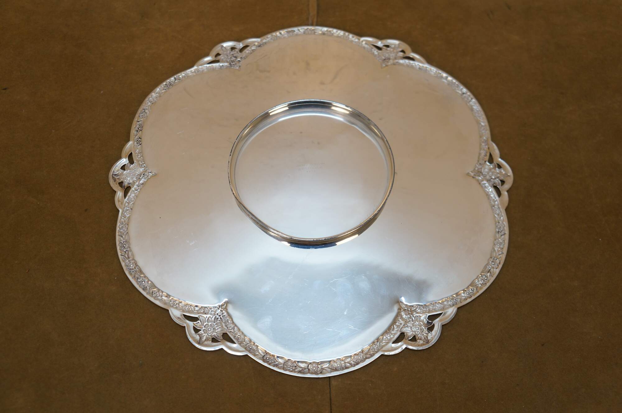 Circa mid 20th century William Rogers elegant silverplate cake plate / footed platter number 4926 in the Orange Blossom pattern. Six lobed flower shape design edged with a pattern of orange blossoms and pierced accents; round footed base.