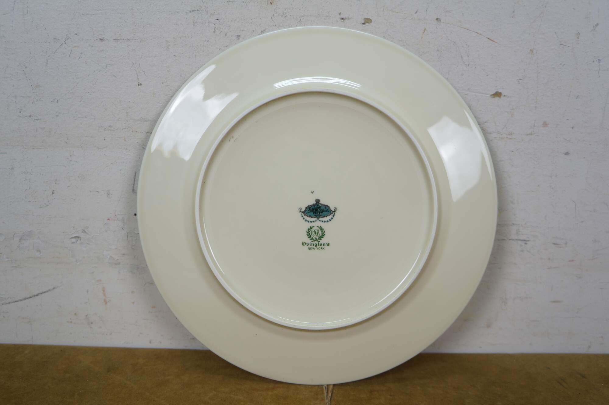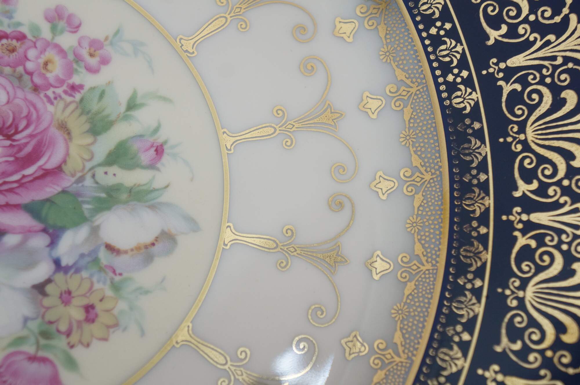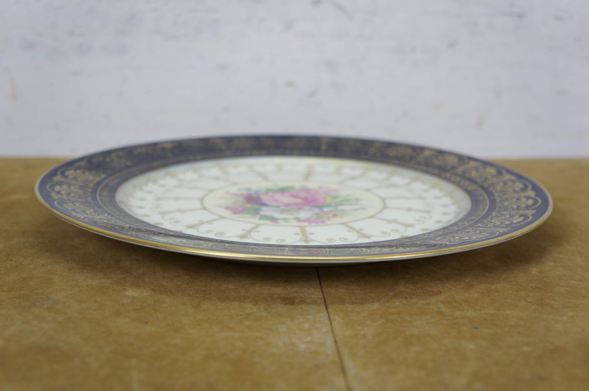 A single early 20th century Rosenthal Ivory porcelain dinner plate featuring a cobalt blue border trimmed in gilt fan and foliate designs, surrounding a hand painted central motif of a bouquet of flowers. Made in Bavaria. Sold by Ovington's New York.
