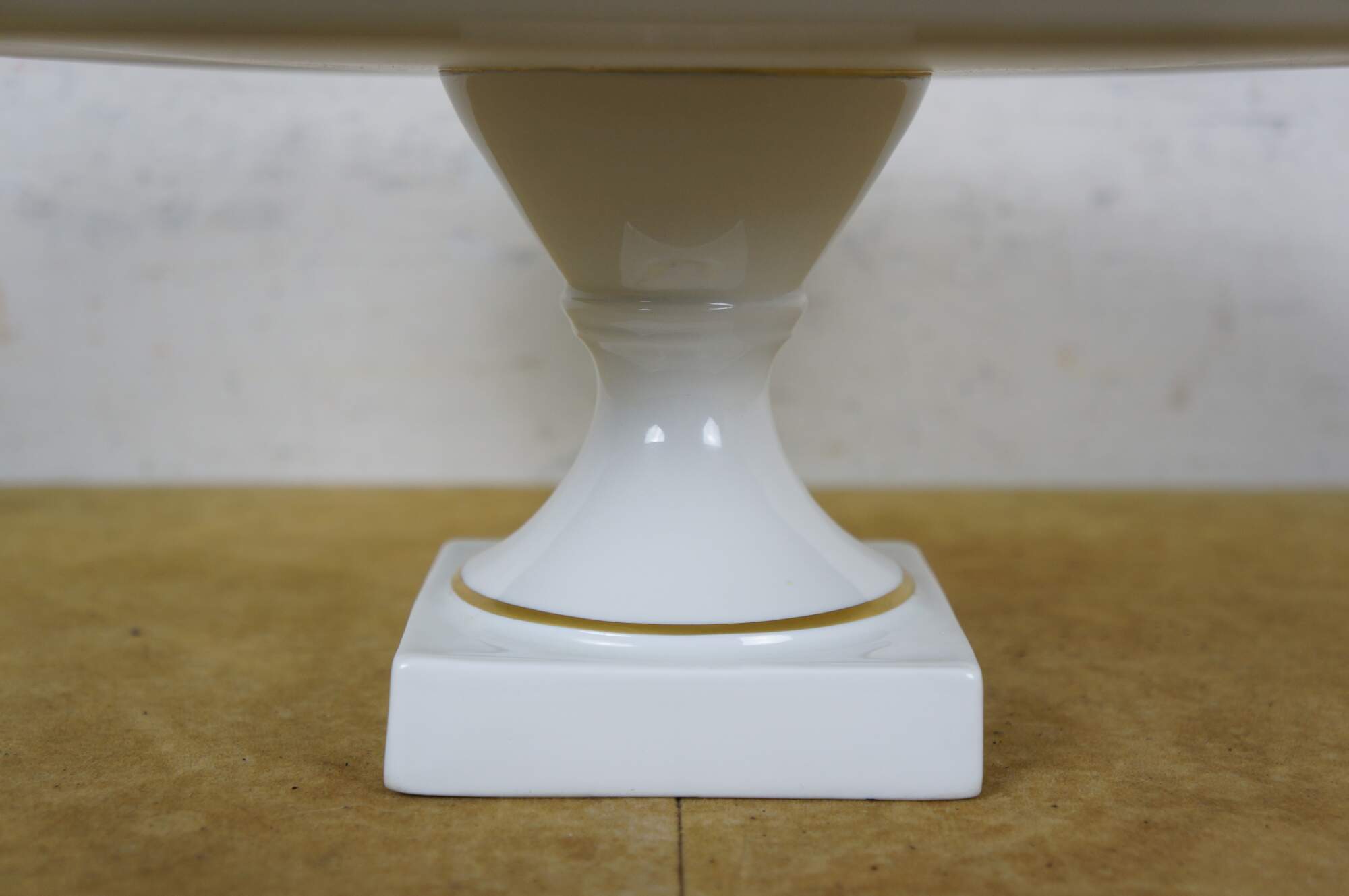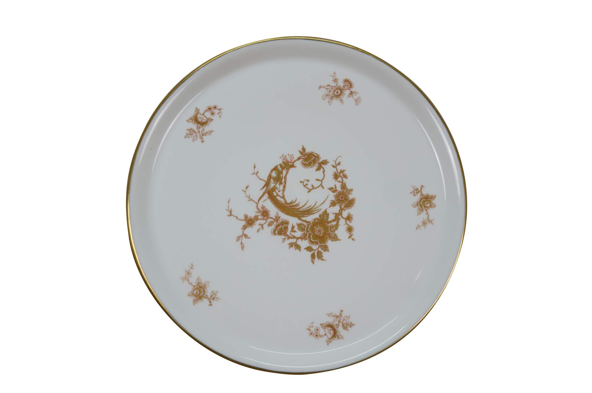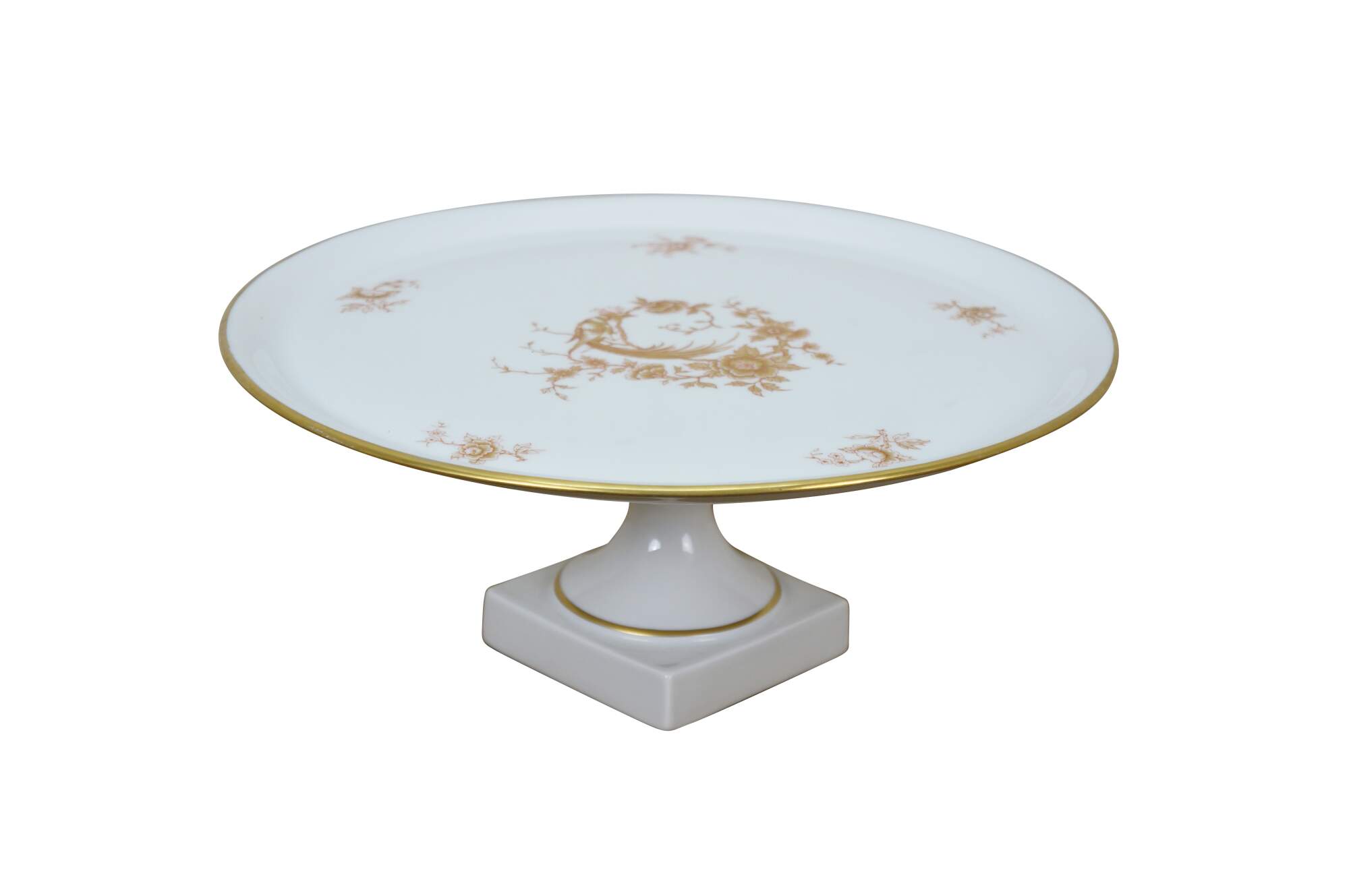 Circa mid 20th century white porcelain cake plate / cake stand with a square pedestal base and round top, trimmed in gold and painted with a peacock and flowers in orange and gold. Marked Limoges France.