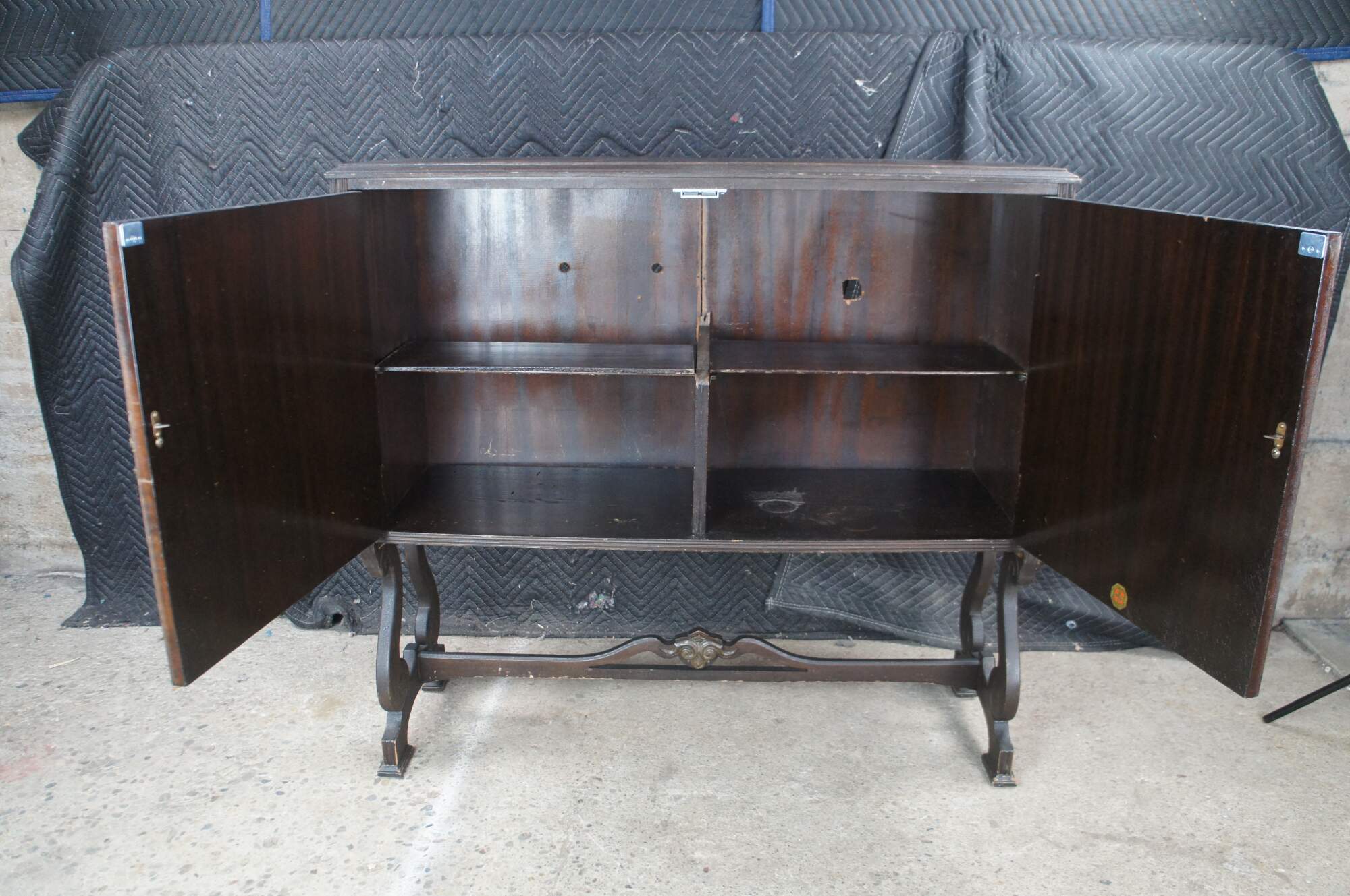 Structurally solid, wear and distressing from age and use, finish loss / scuffing, ring, alligatoring to finish, holes cut in back for stereo equipment, some staining, edge wear, break to inteior middle support.