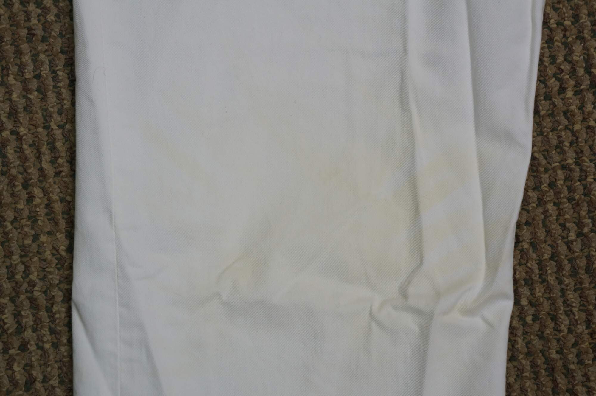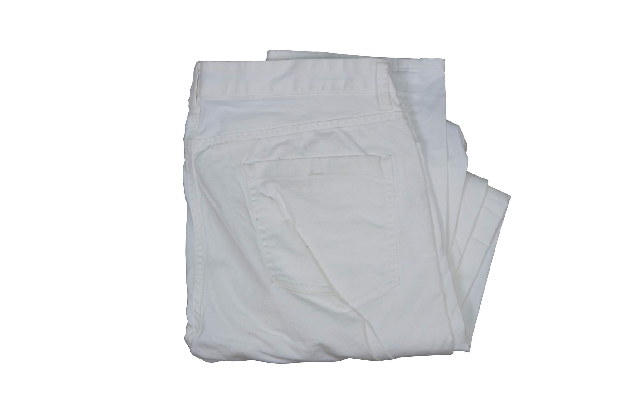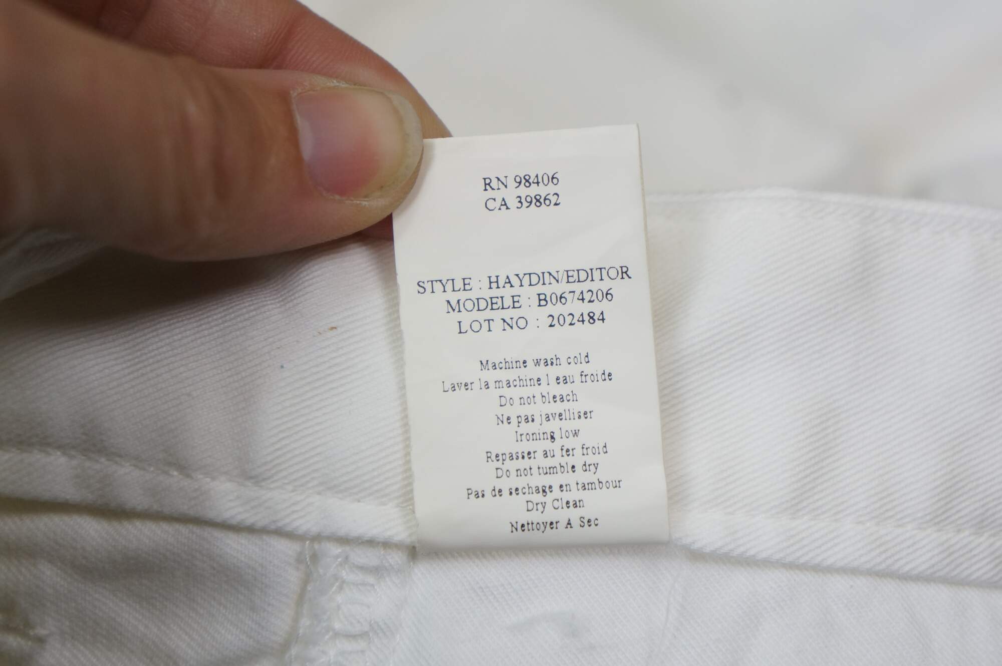 Vintage Theory Haydin / Editor men's white denim jeans / pants. Button fly. Two back pockets. Two front side pockets, right hand watch pocket. 95% Cotton / 5% Polyurethane. Made in China.