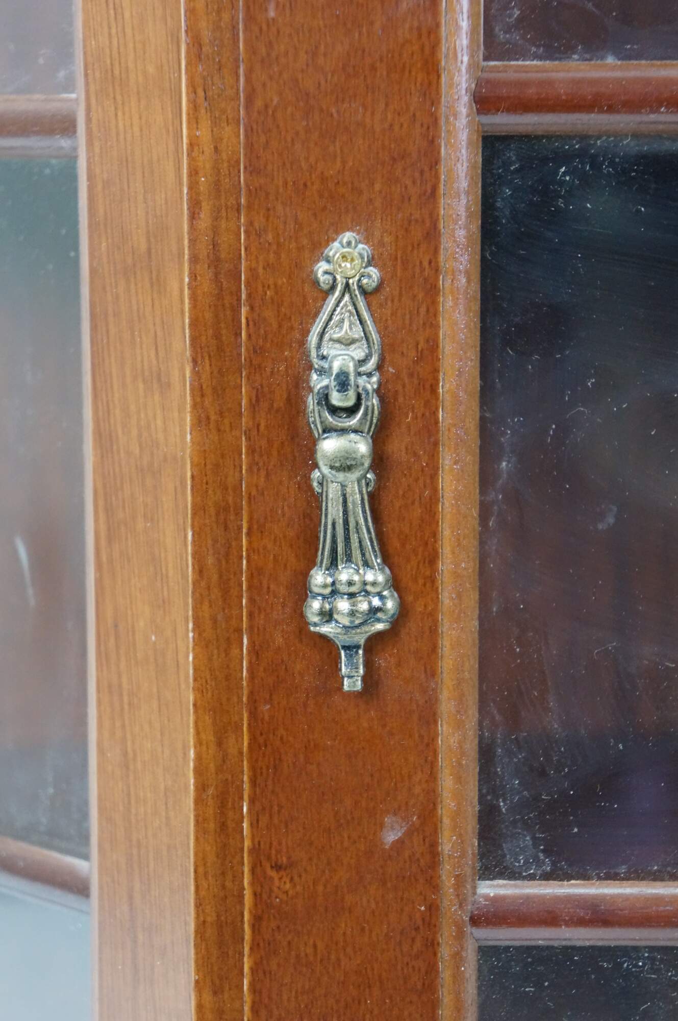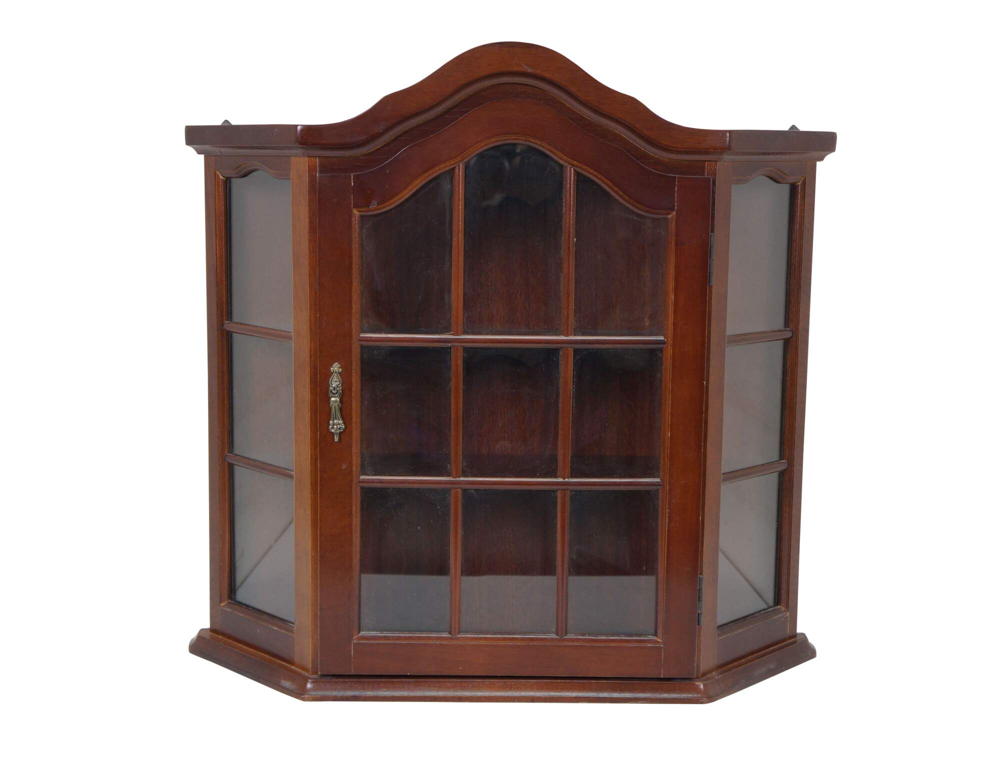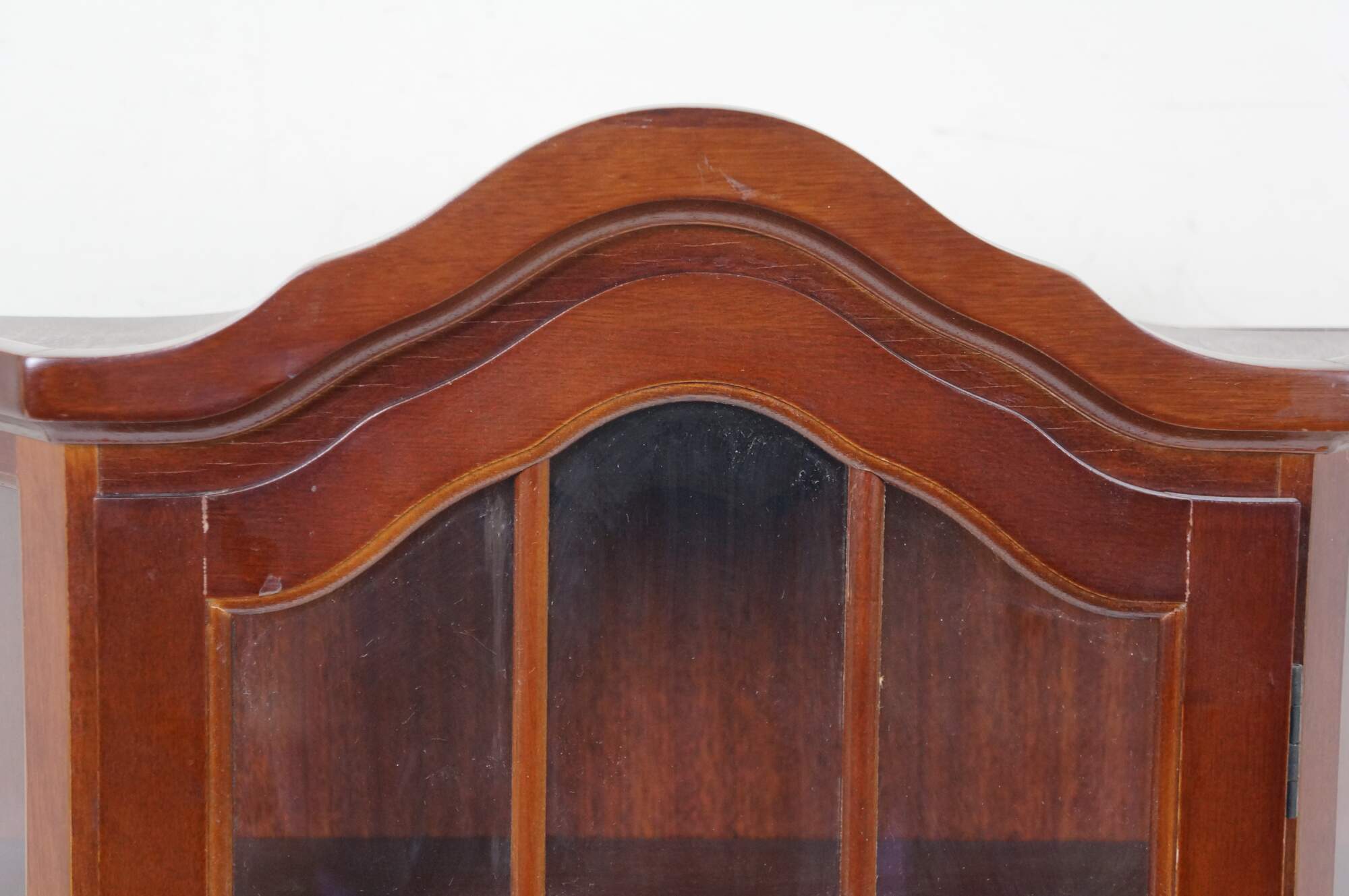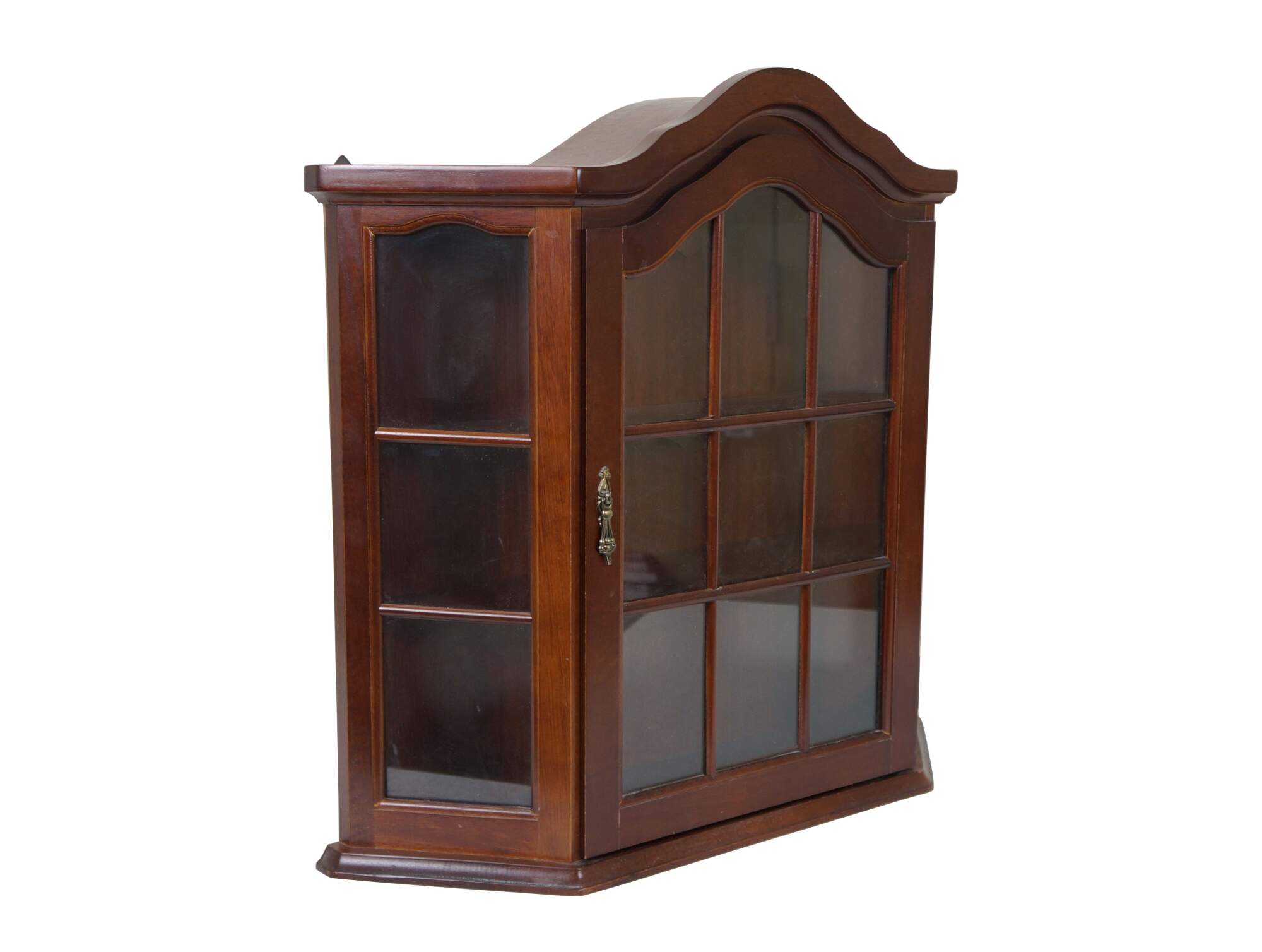 Vintage 20th century mahogany Chippendale style curio / display cabinet featuring a three sided glass front, arch top, and three interior shelves. Back of cabinet is fitted with slots to accomodate wiring for lights.