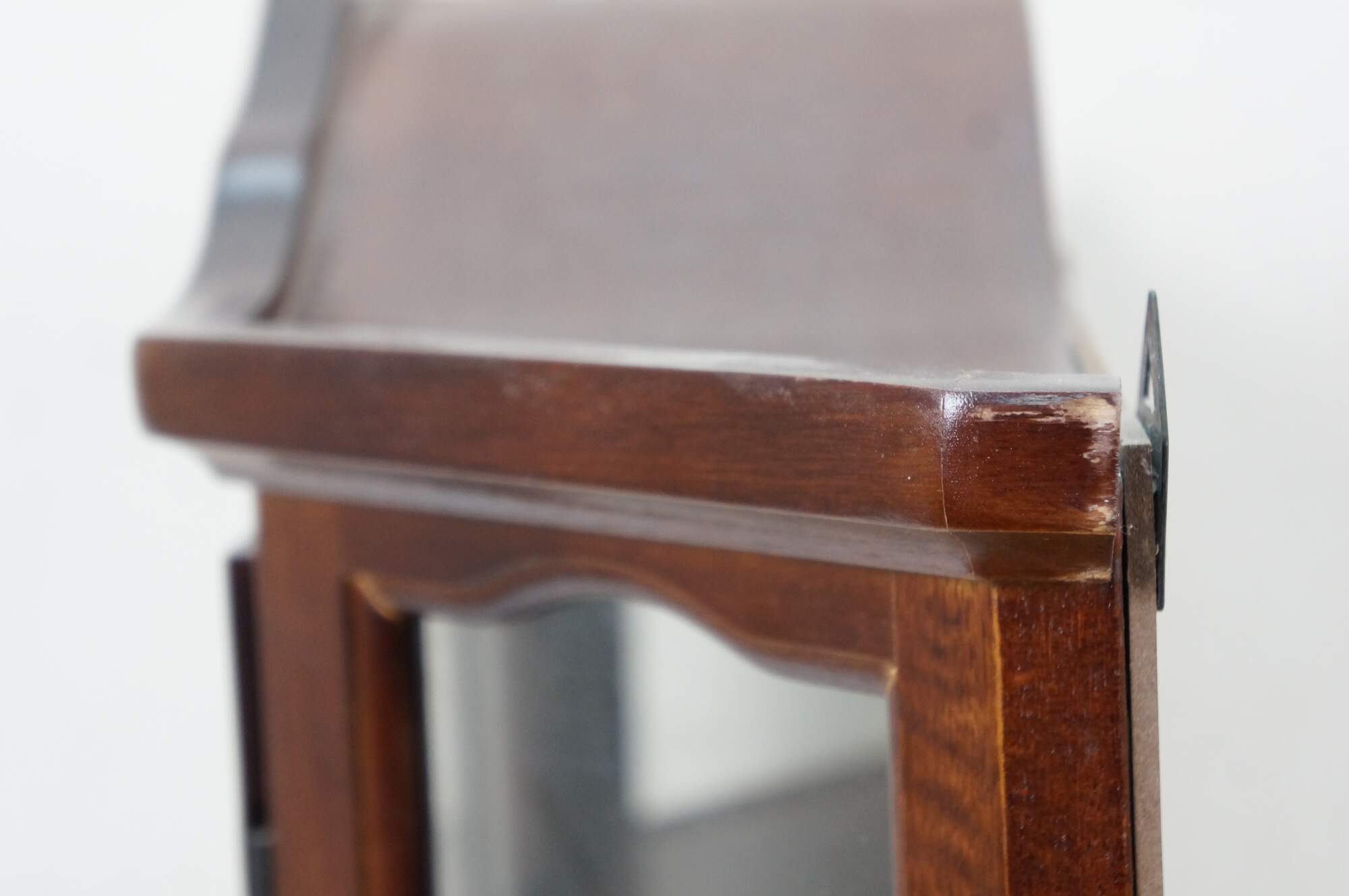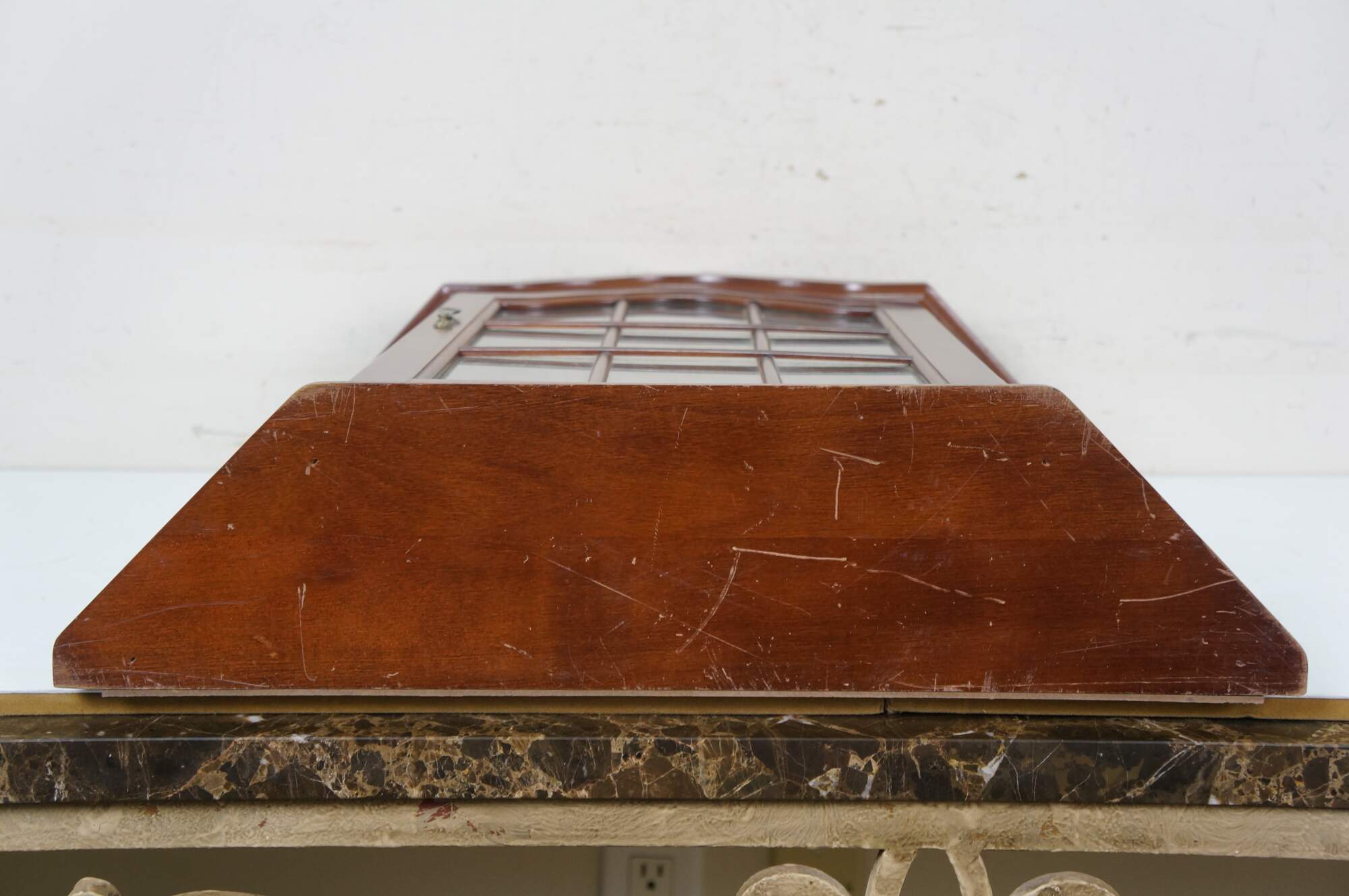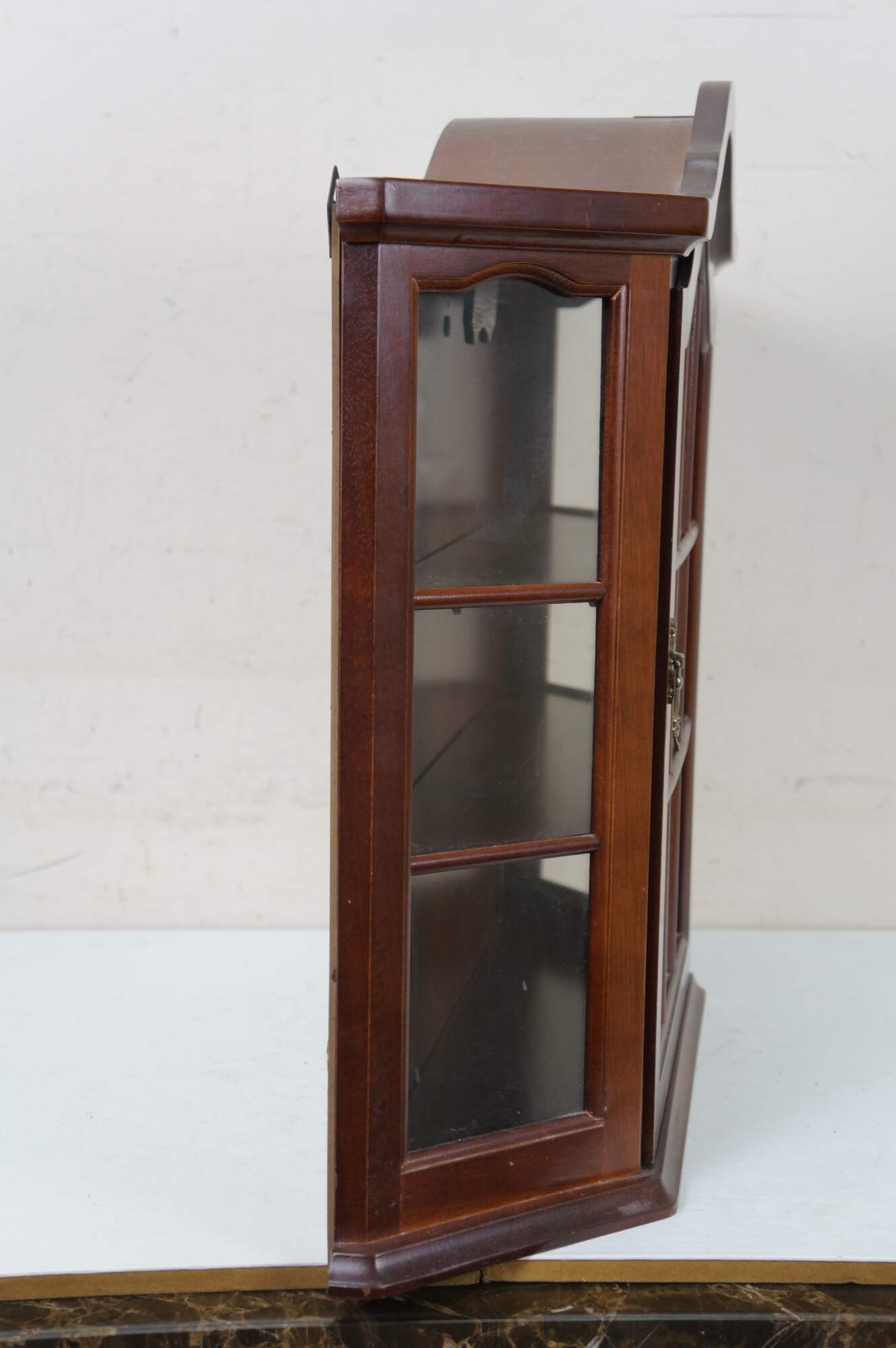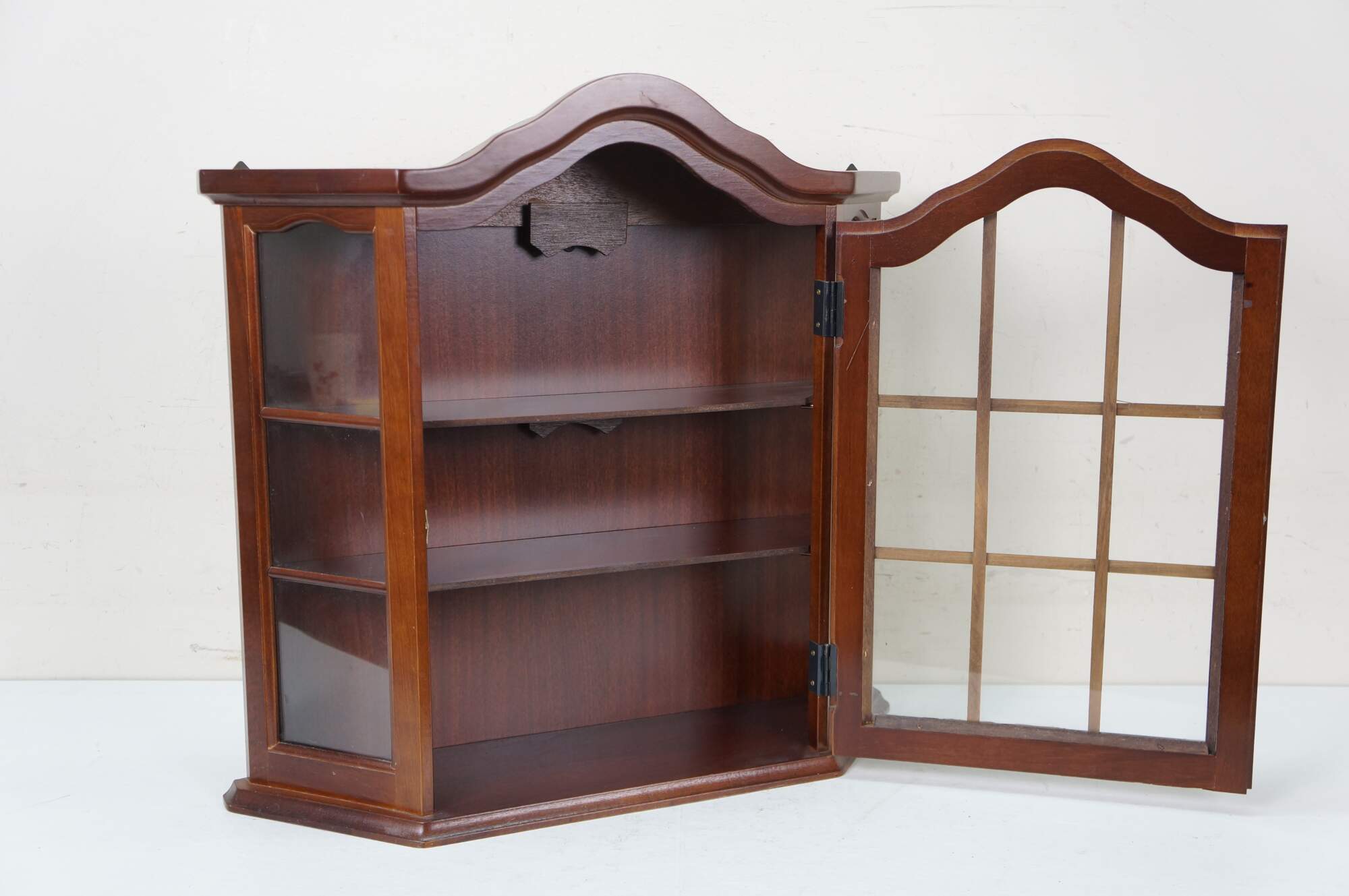 Vintage 20th century mahogany Chippendale style curio / display cabinet featuring a three sided glass front, arch top, and three interior shelves. Back of cabinet is fitted with slots to accomodate wiring for lights.