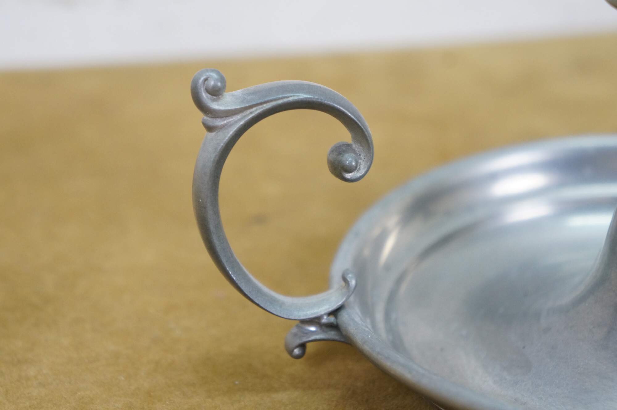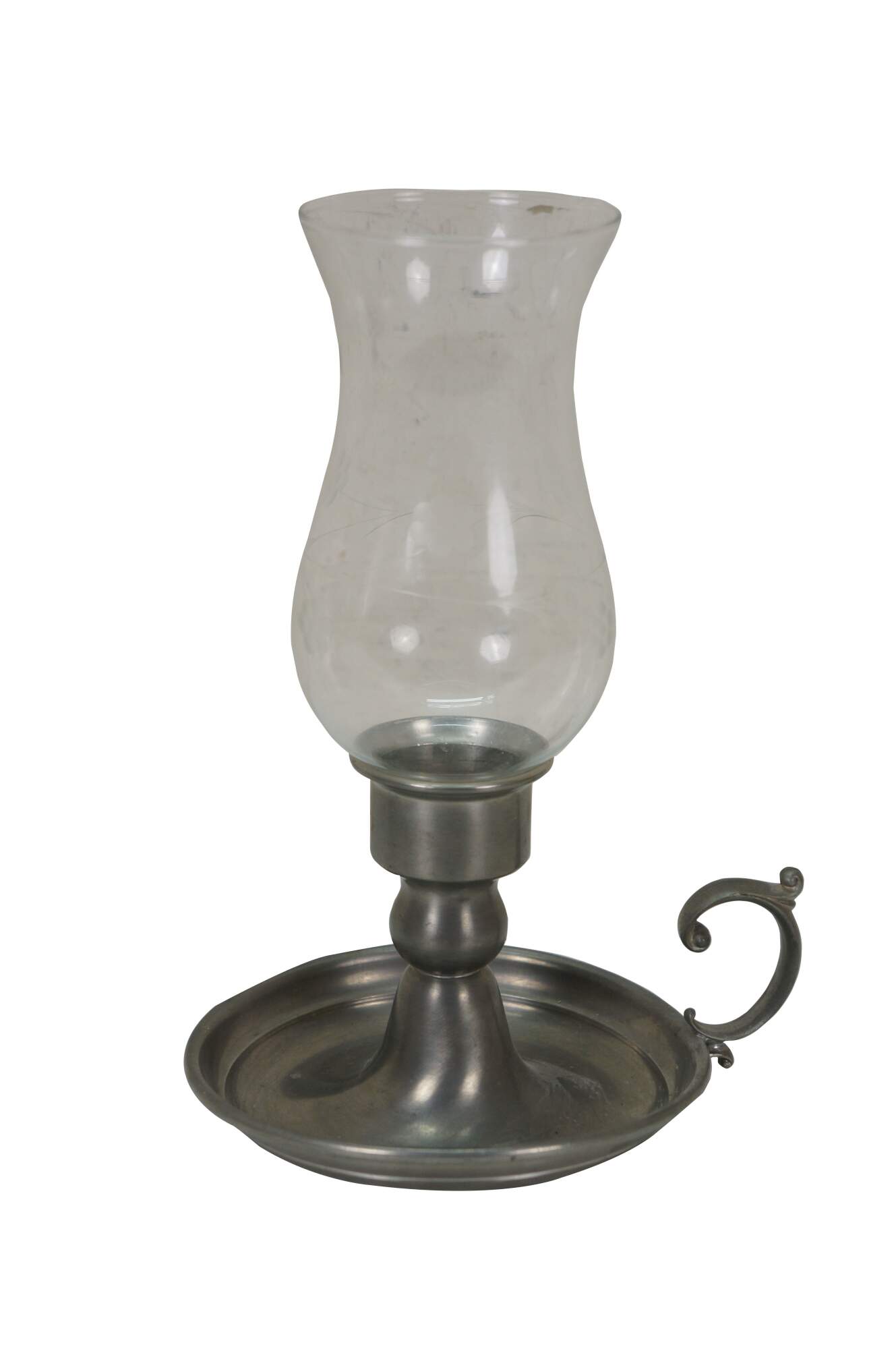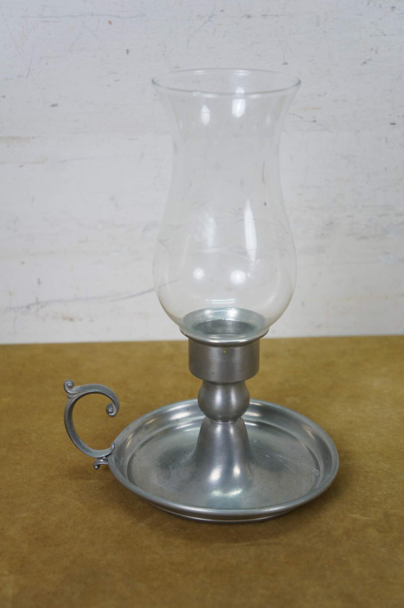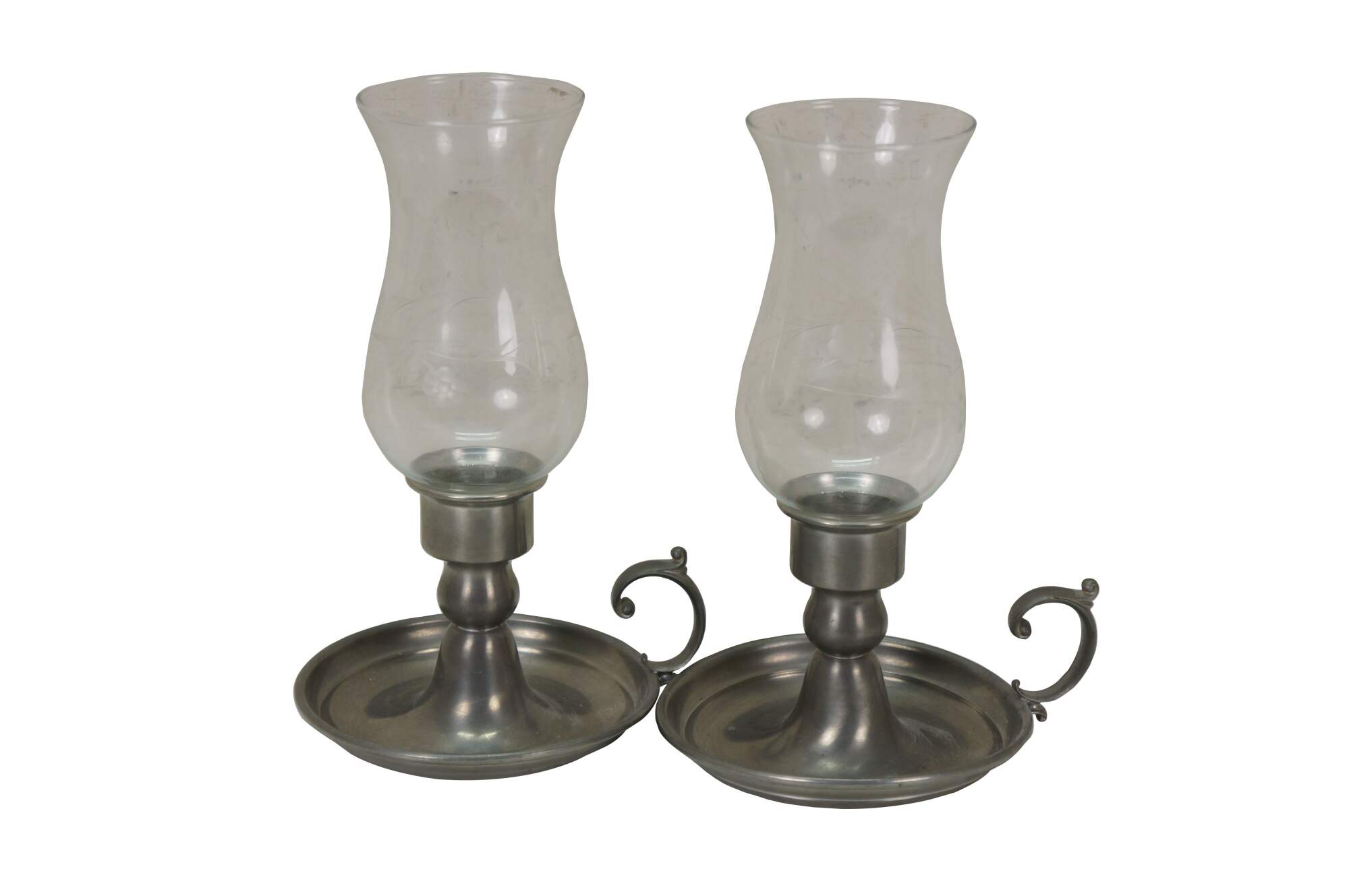 Pair of vintage Early American Pewter by Web chamberstick style candle holders with scrolled handles and clear glass hurricanes witched with flowers.